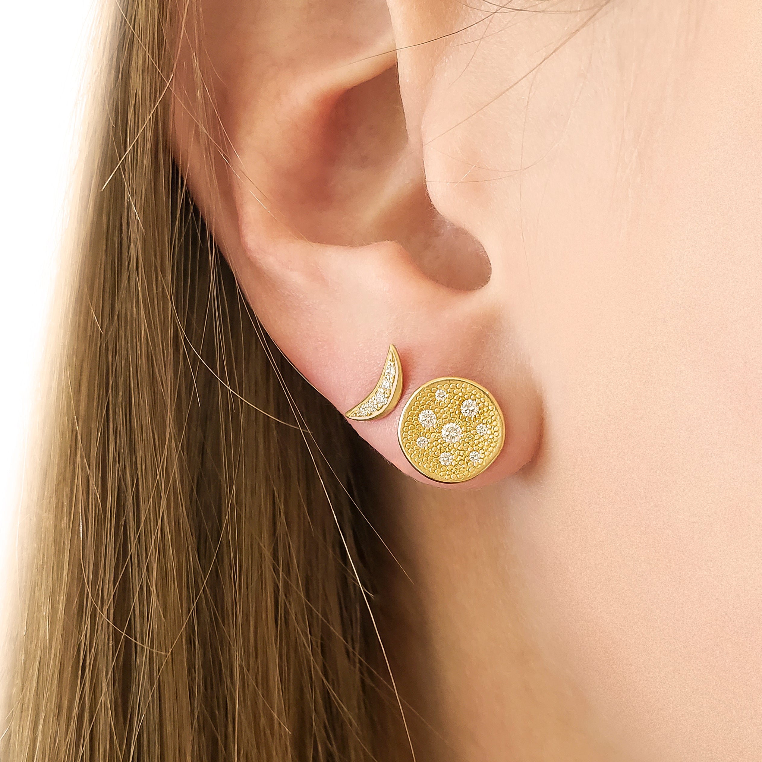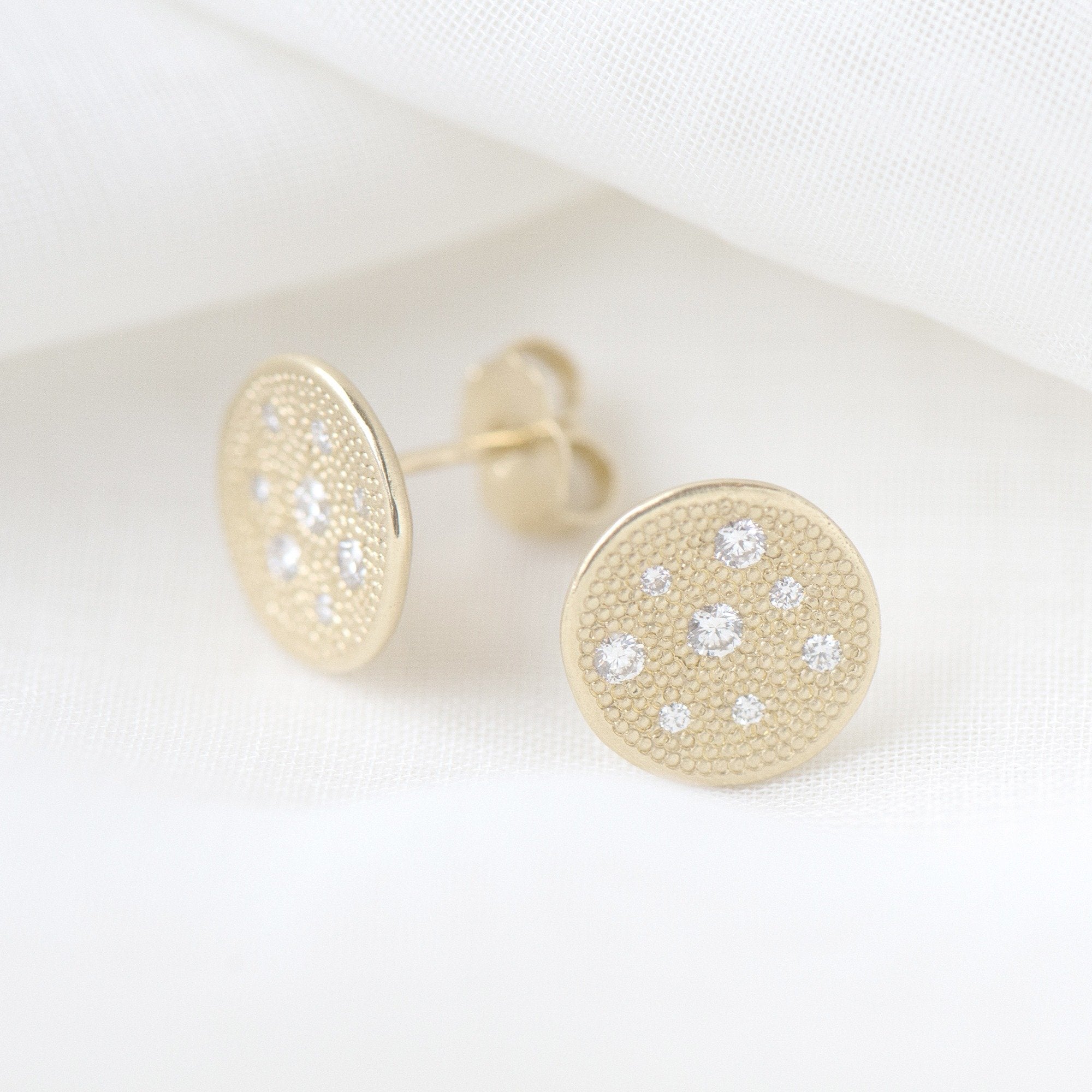 Our coveted "Stardust" collection gold disc earrings. Each earring is pave set with 8 brilliant diamonds of varying sizes.