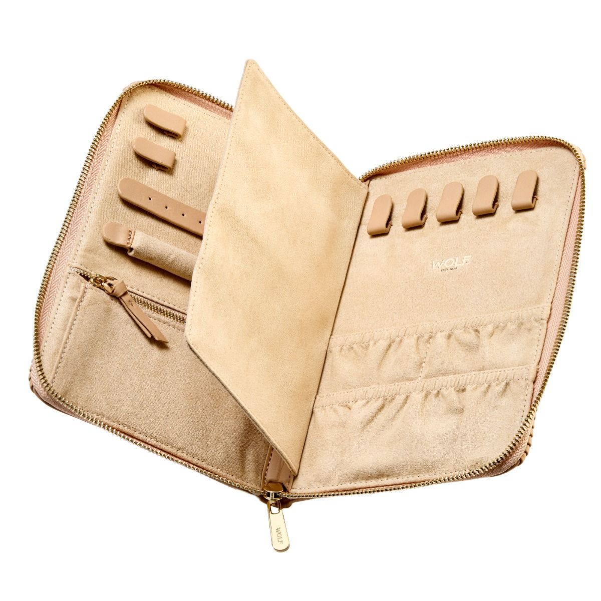 The Bella Jewelry Portfolio brings opulence and sophistication with perfectly pleated exterior and gold finish hardware. Inside find LusterLoc™ lined storage for rings and earrings, a zip compartment, 5 necklace and 4 bracelet snap closure hooks with elasticated pouches to prevent tangling. Simply beautiful.