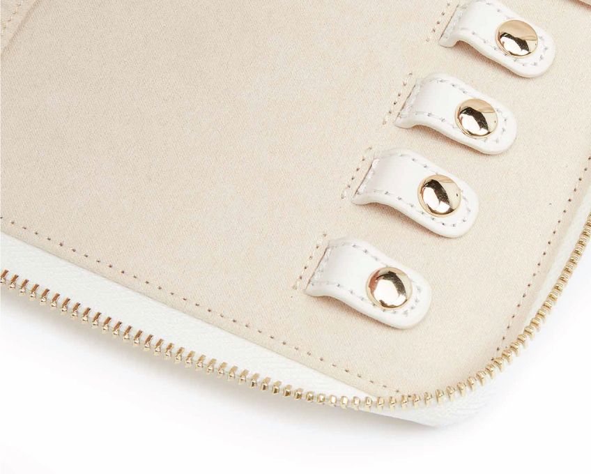 • Storage: 1 earring tab, 1 ring tab, 2 zip compartments, 4 snap-on necklace hooks with pocket