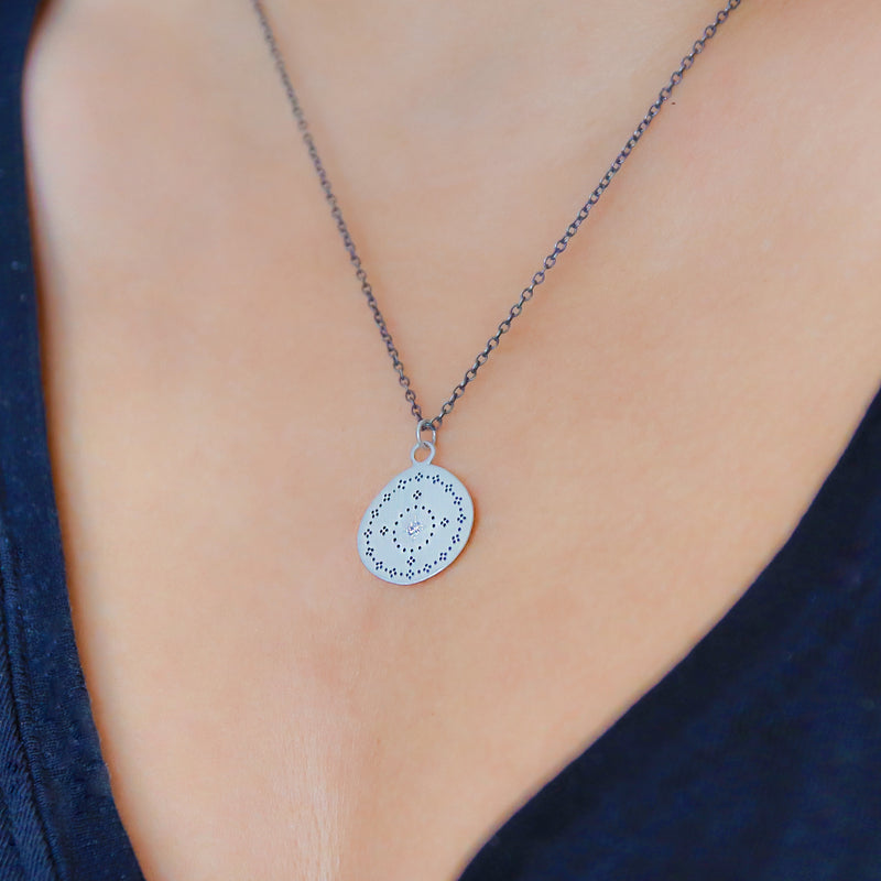 Etched with echoes of the past, this sterling silver pendant carries the soft imprint of memory, delicate Nostalgia impressions that drift across its surface like a faded story. At its center, a single gemstone glows with quiet clarity, anchoring the piece in light and sentiment. Worn close to the heart, it becomes a gentle reminder of moments held and remembered.