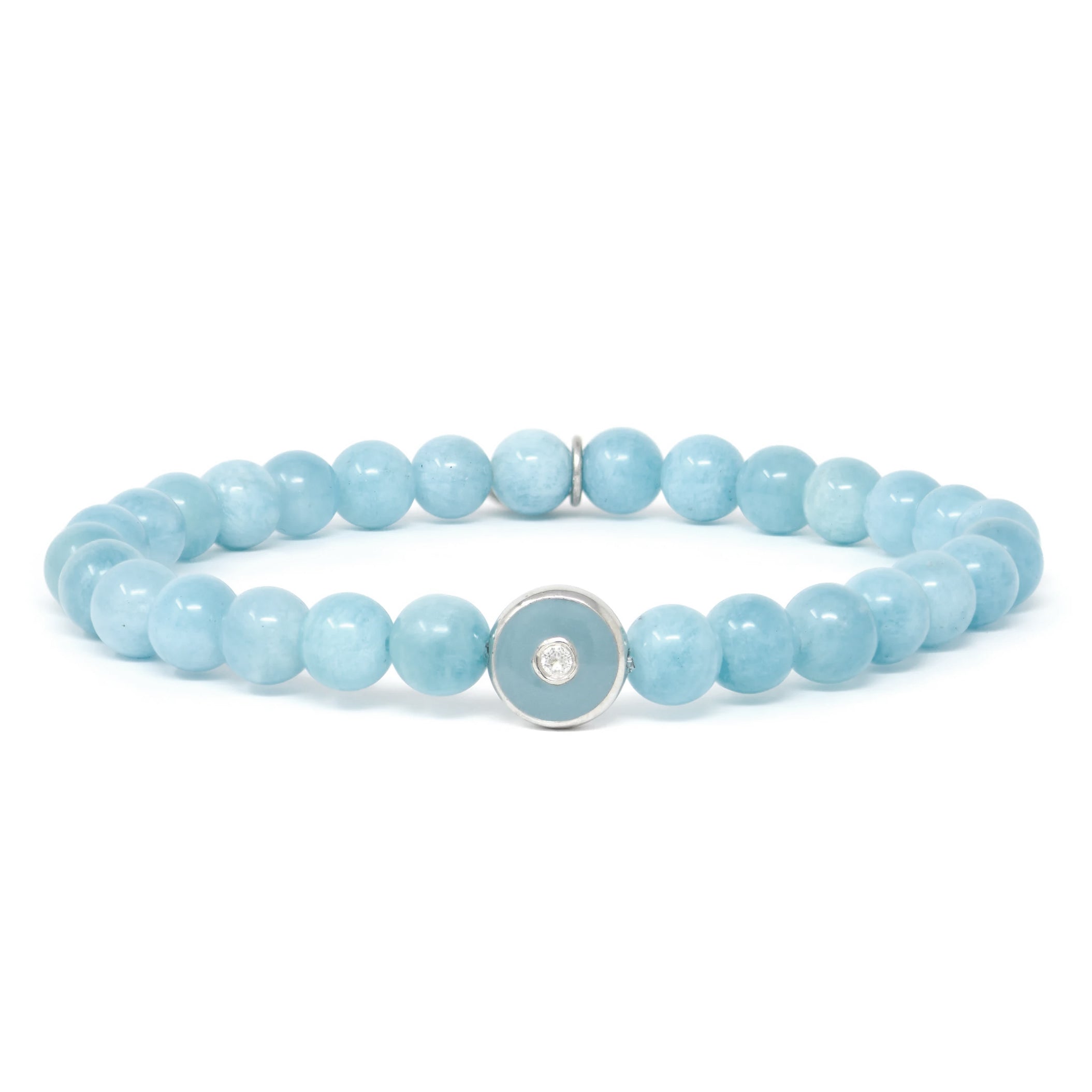 Amazonite beads are strung together and fastened with a sterling silver enamel charm set with clear topaz on a stretchy cord.