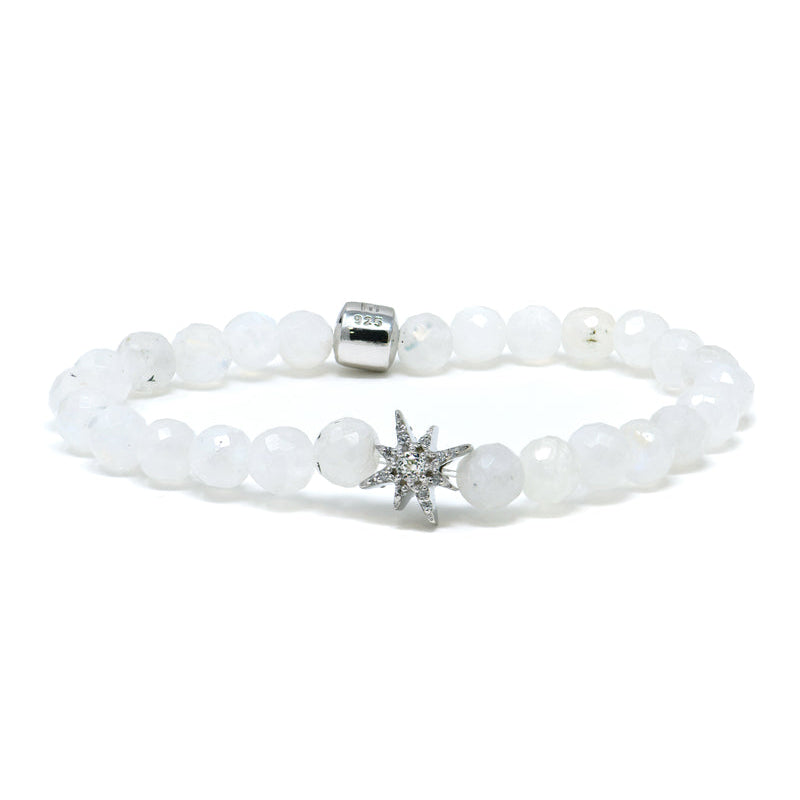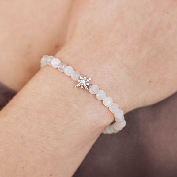 Faceted moonstone rondelles are strung together with a sterling silver starburst charm on a stretchy cord.