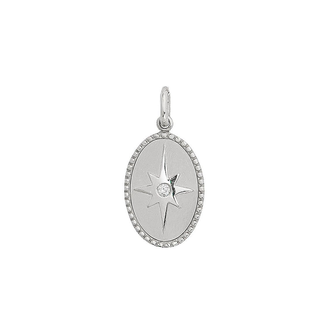 Sculpted and engraved by hand in 10k white gold with a 1 pt diamond.