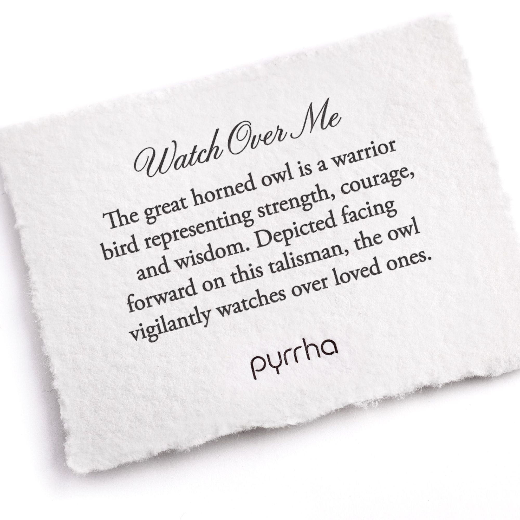 The great horned owl is a warrior bird representing strength, courage, and wisdom. Depicted facing forward on this talisman, the owl vigilantly watches over loved ones.