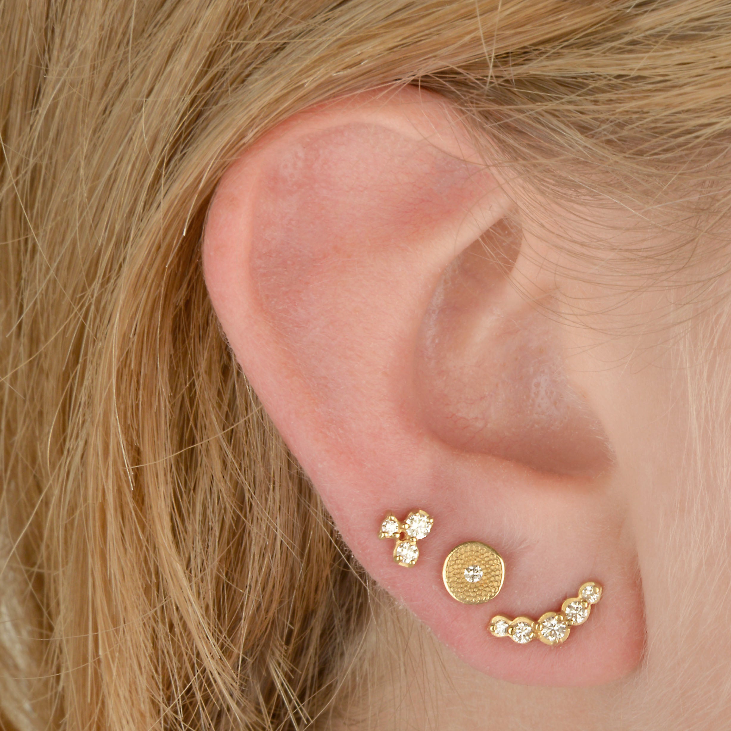 Gold stud earring with Stardust beaded texture mini circle, center set with a sparkling diamond.