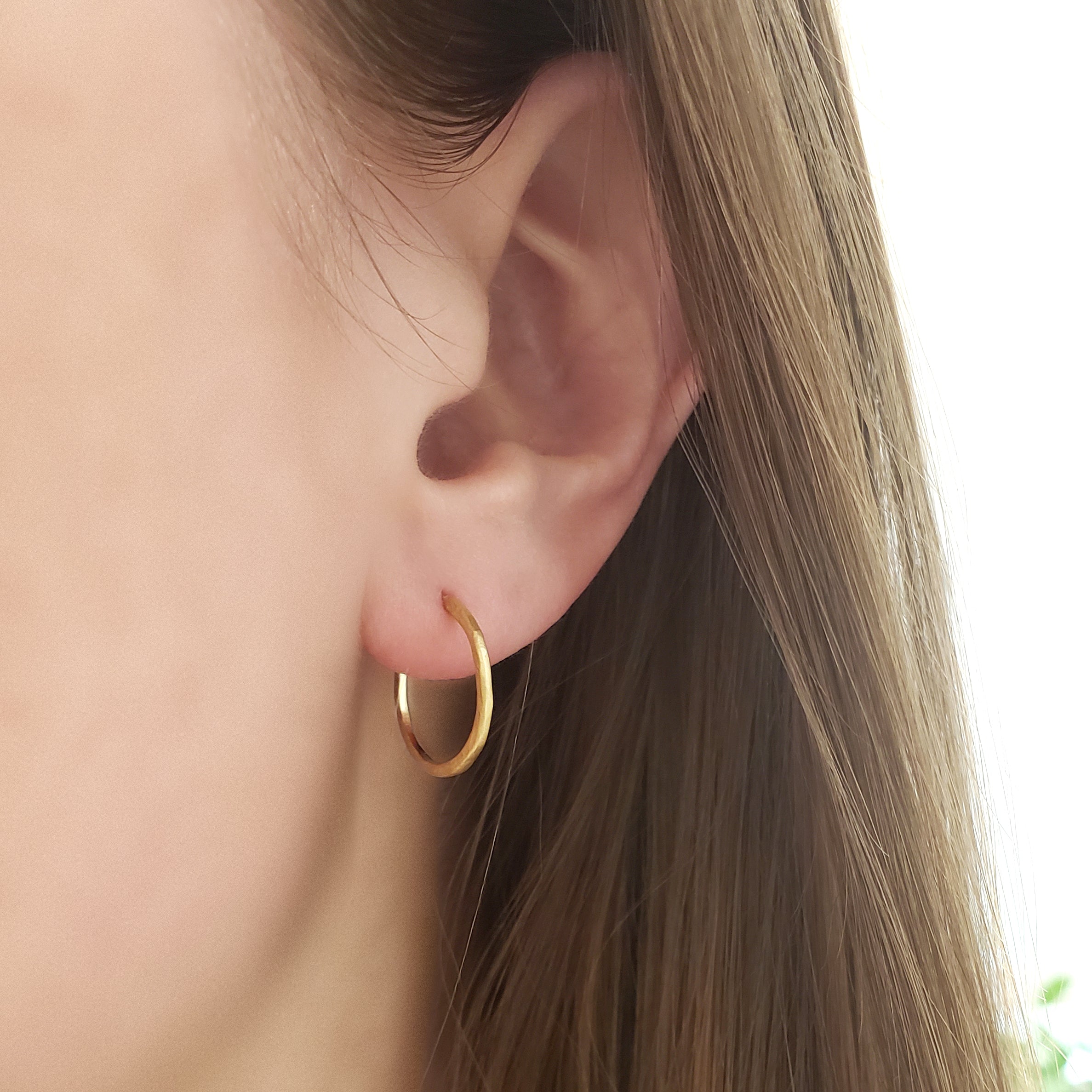 Gold open hoop earring with hammered texture. ~16.95mm