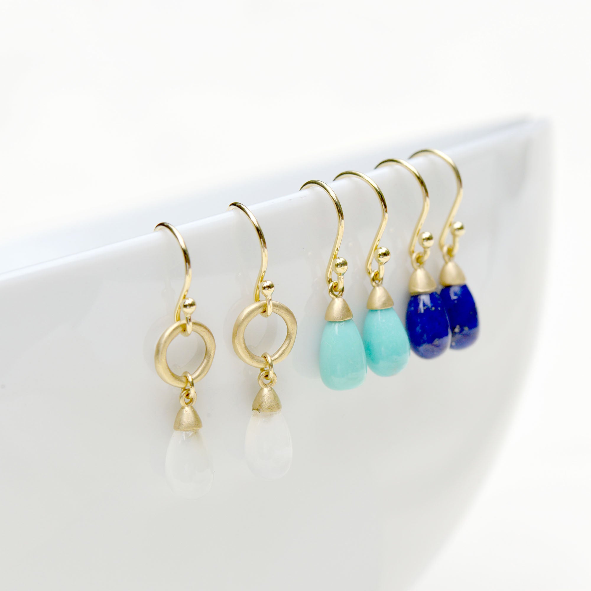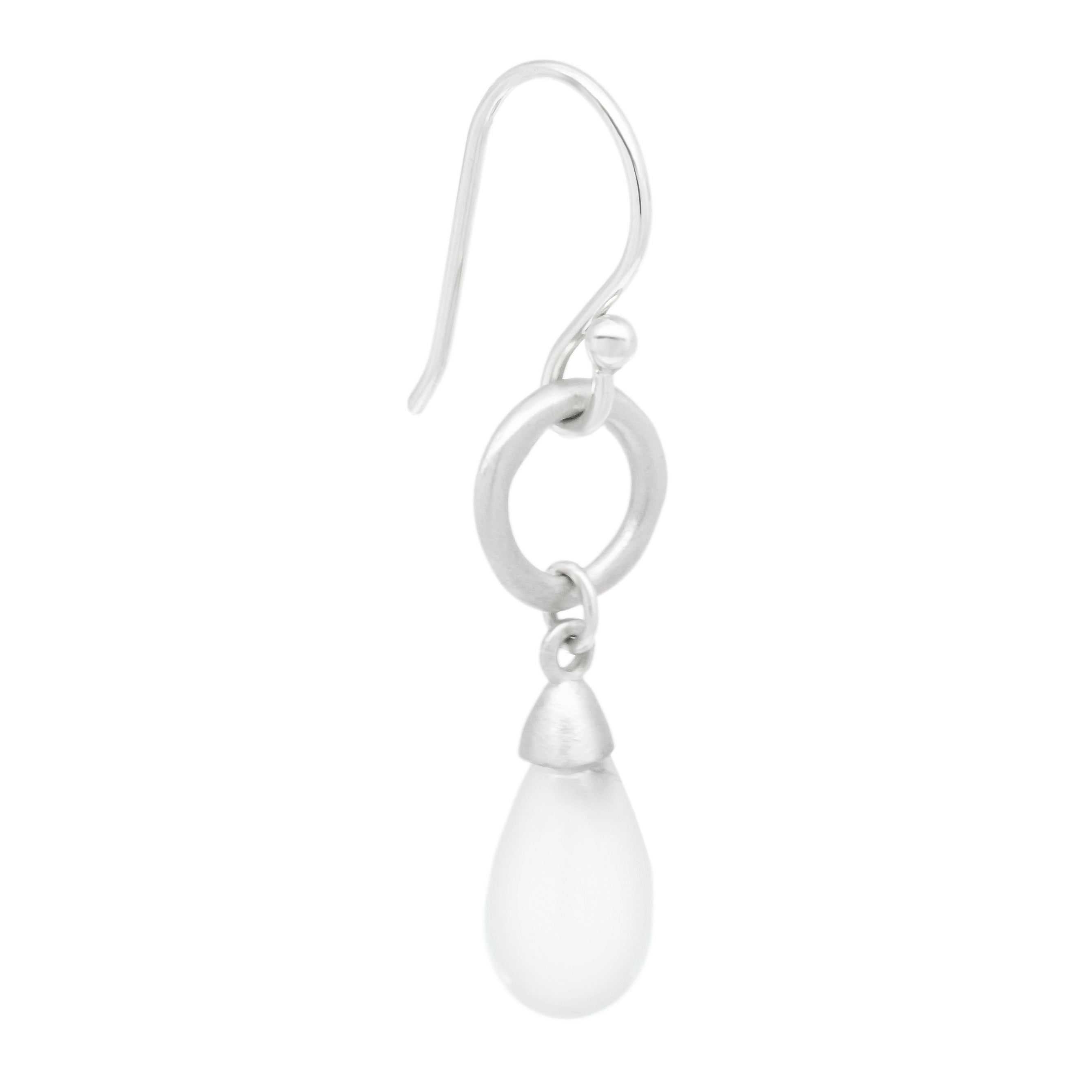 Gold hook earrings with organic open circle drop and capped smooth milky moonstone teardrop (~8 x 5mm) dangling.