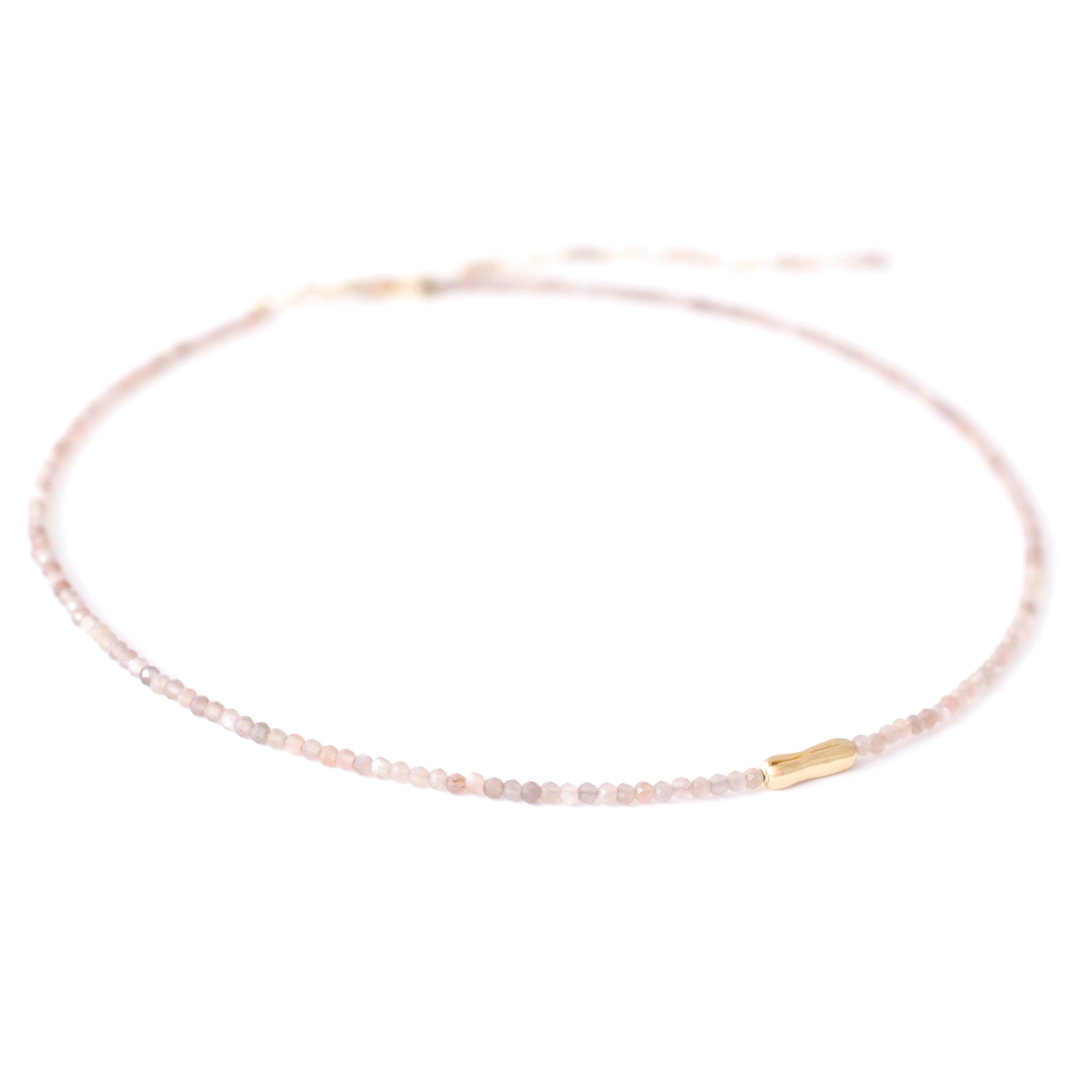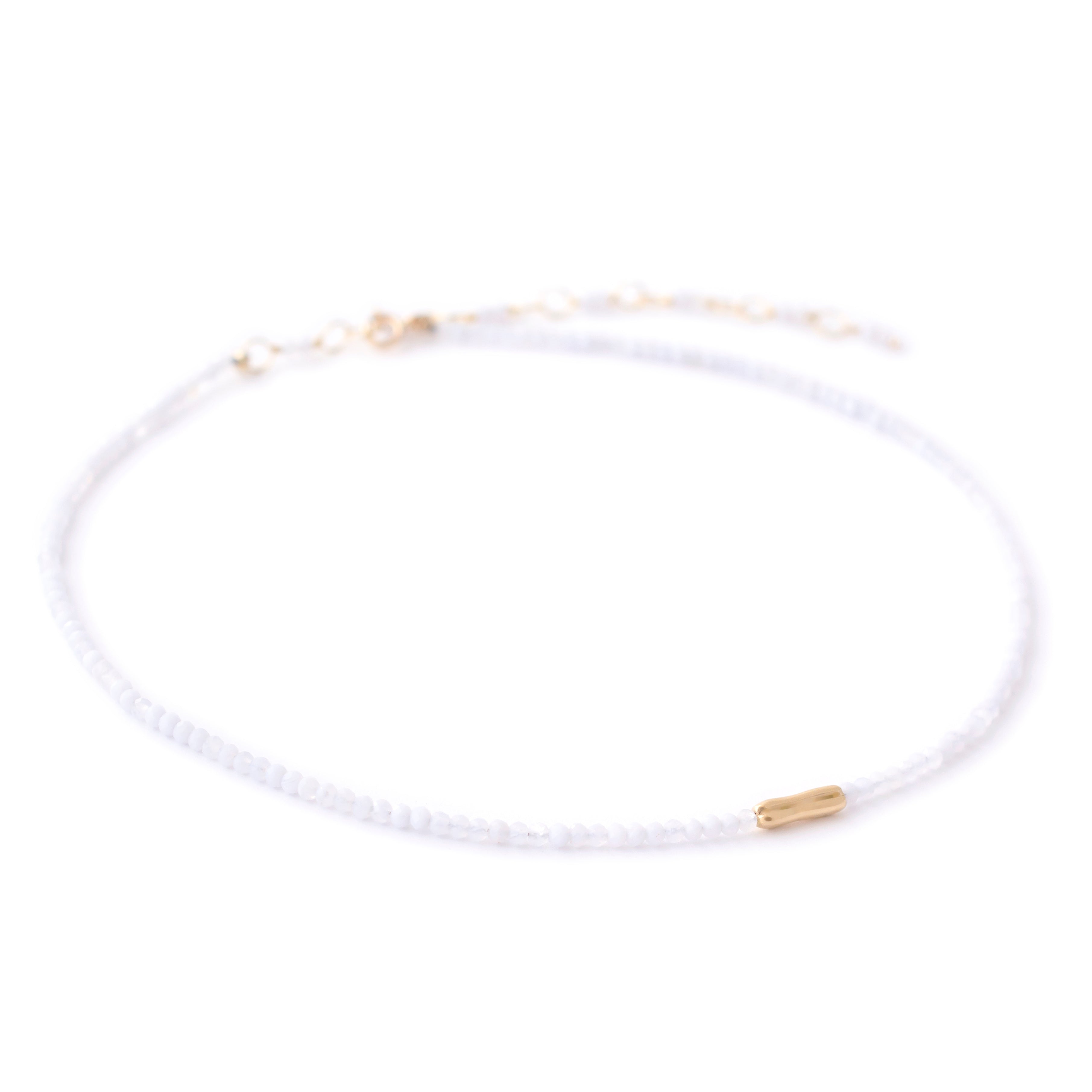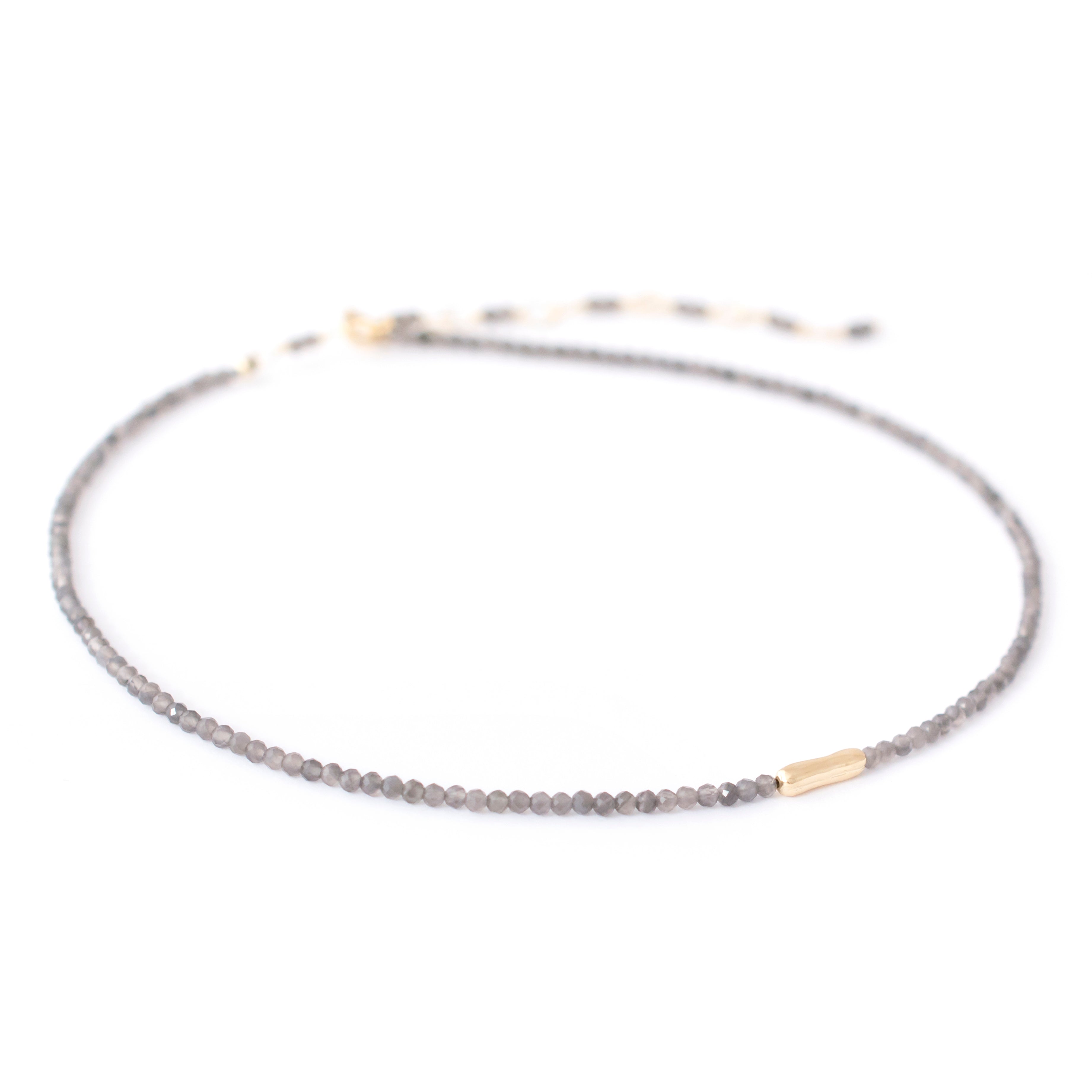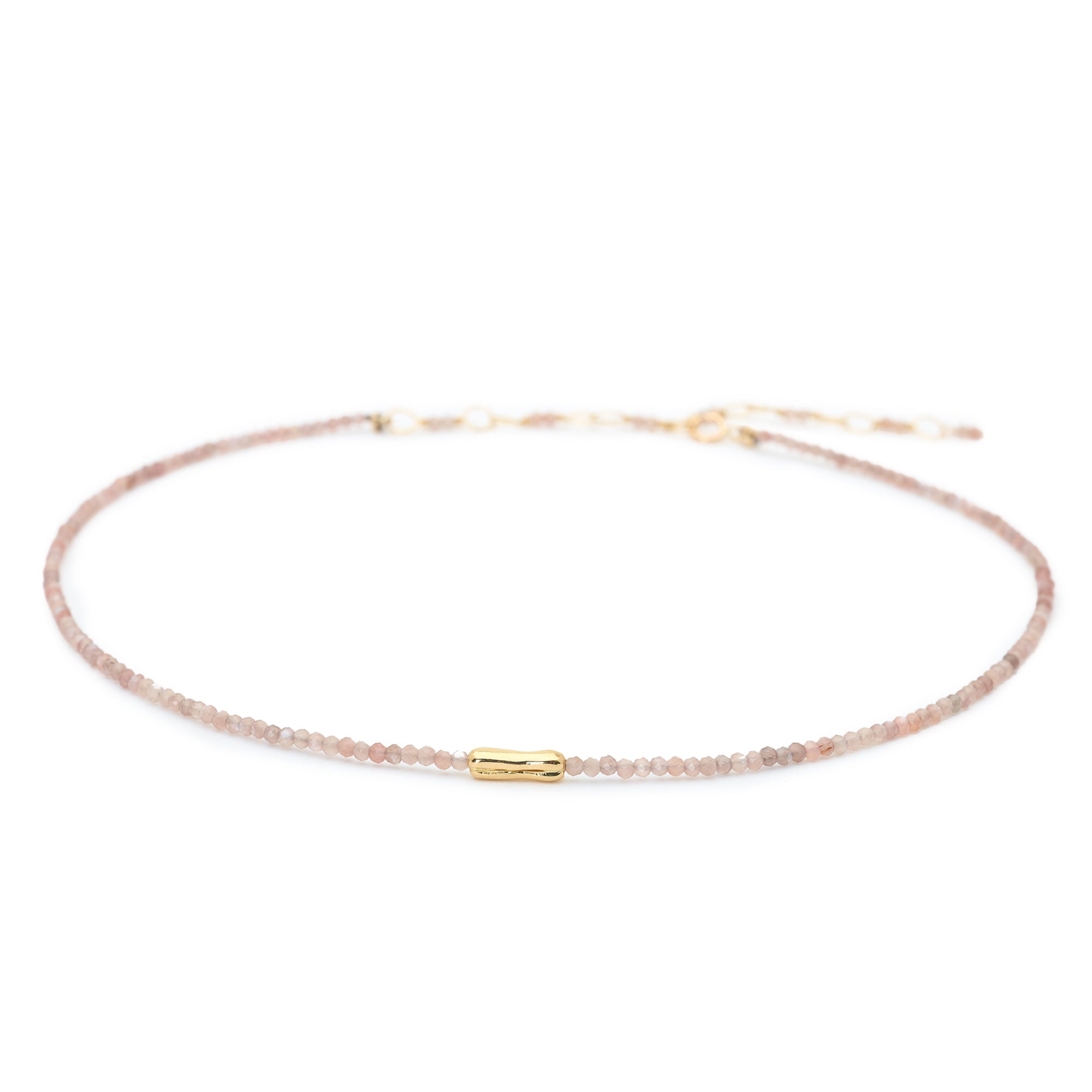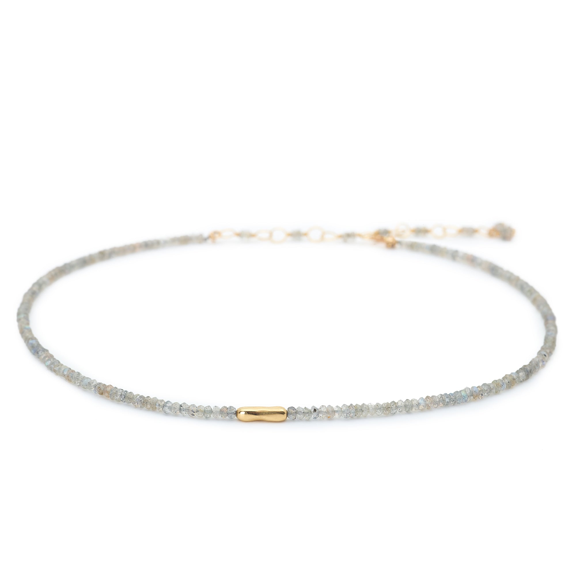 Gold "Wrap" gemstone bead choker necklace with gold organic log bead, clasp and tied extension. 12-15" Length.