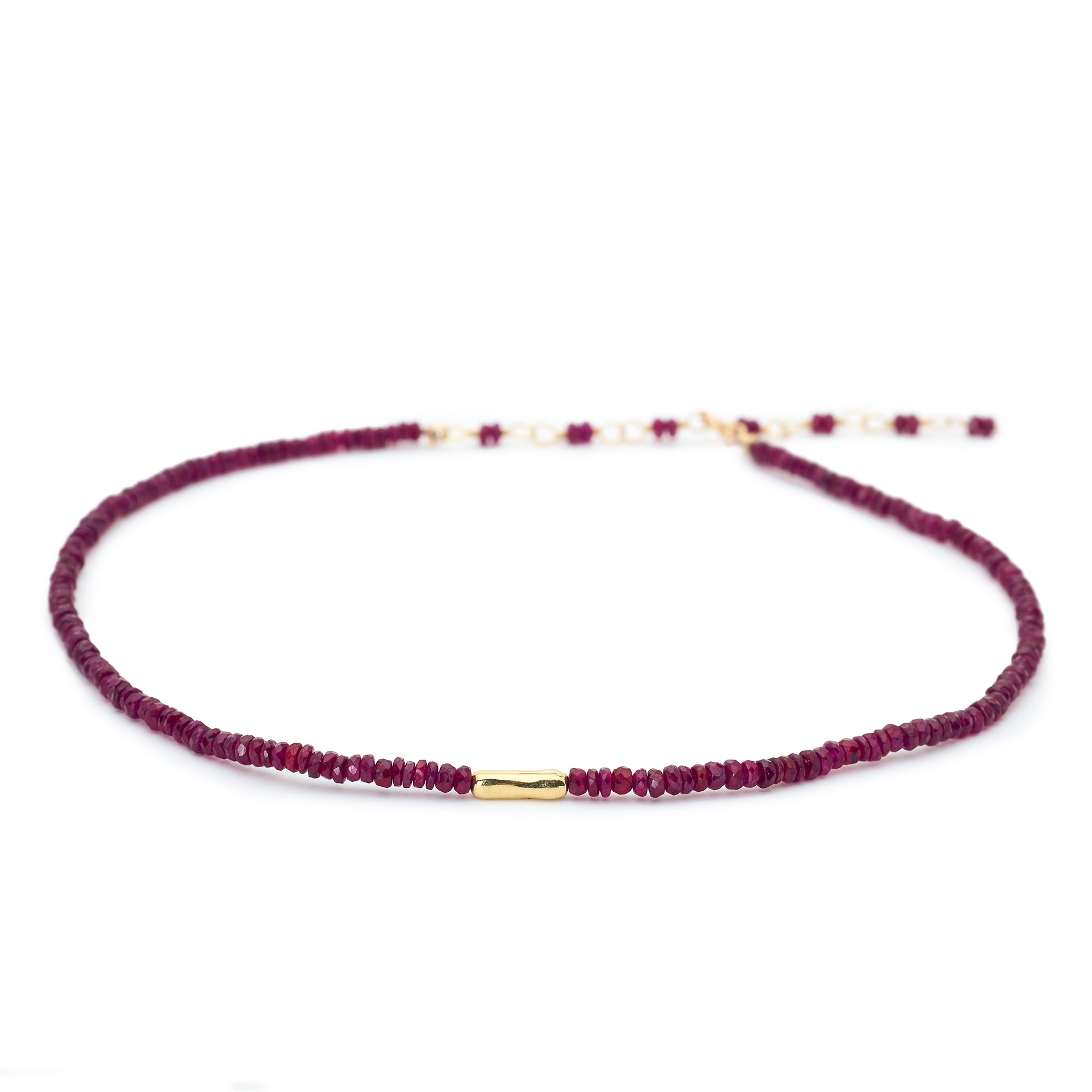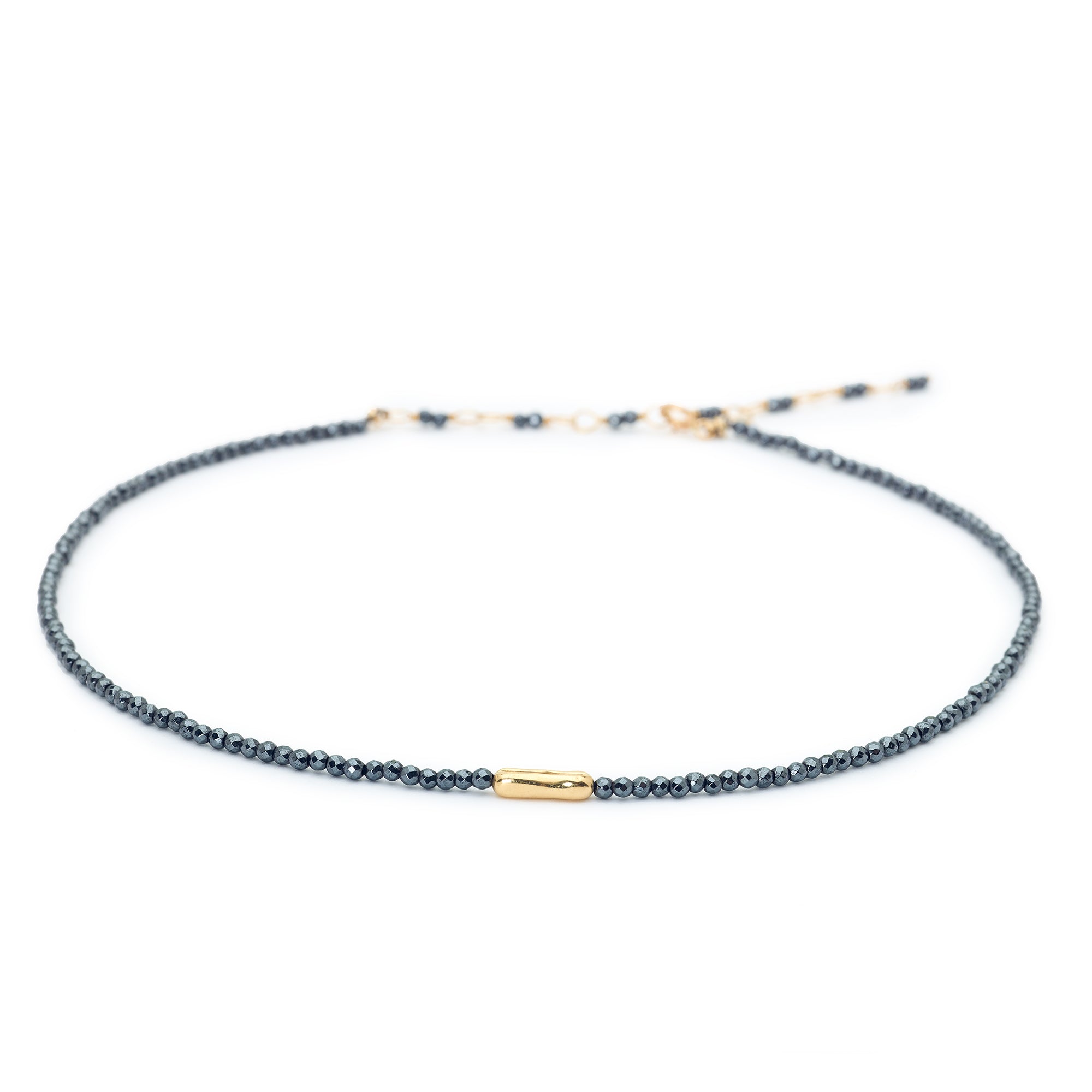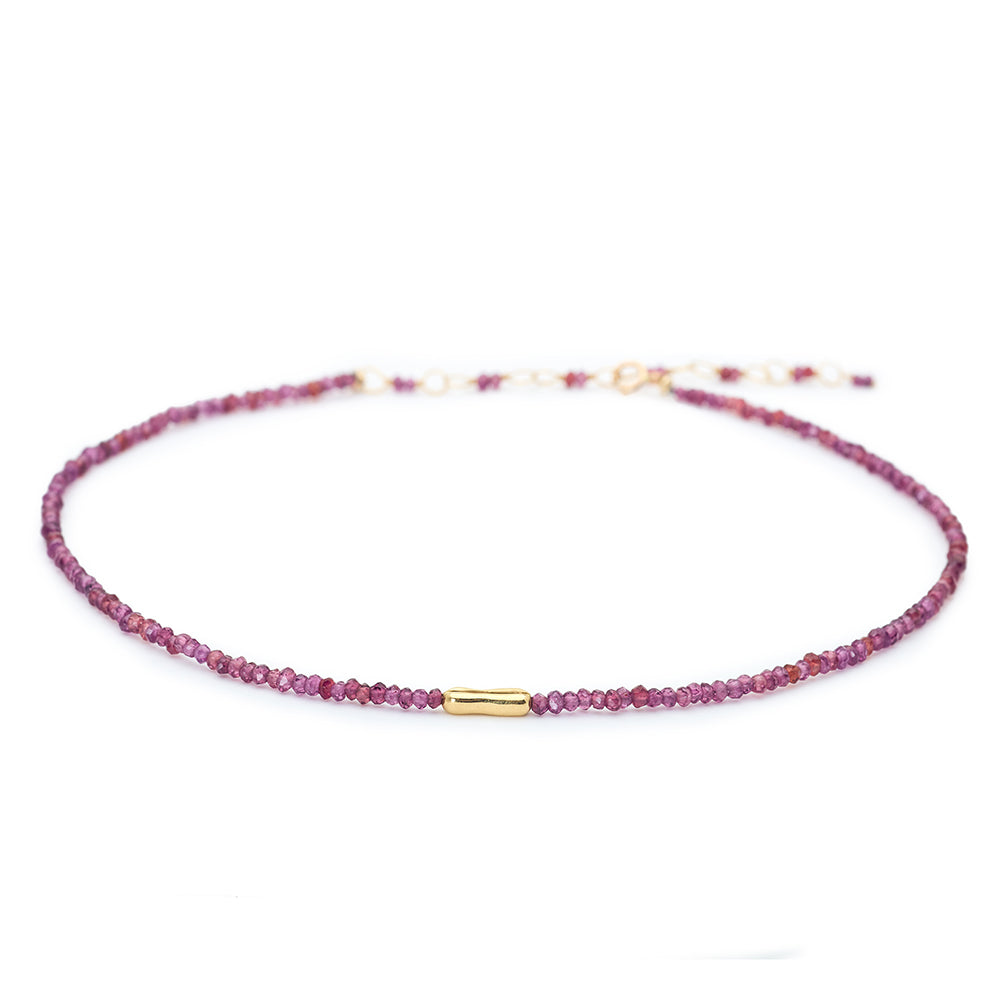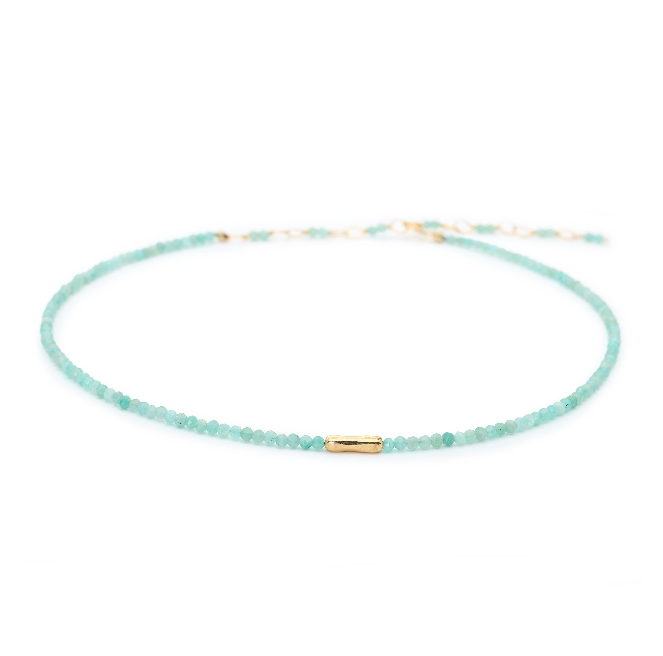 Gold "Wrap" gemstone bead choker necklace with gold organic log bead, clasp and tied extension. 12-15" Length.