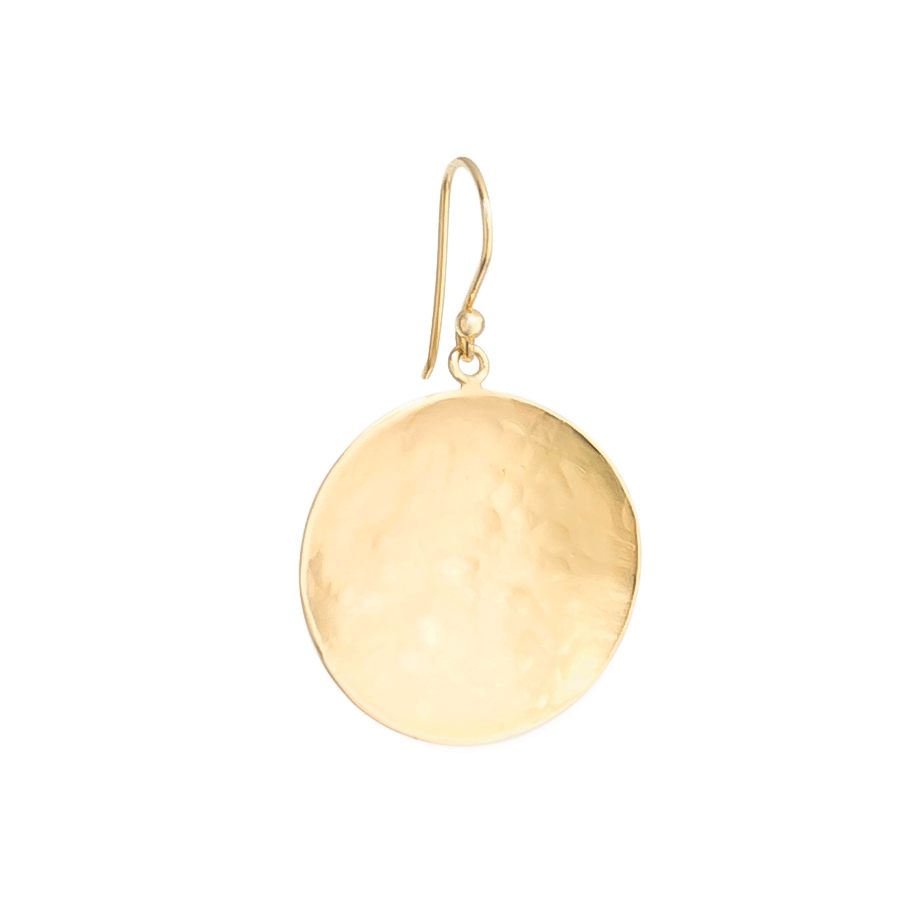 Bold large hammered disc hook earrings make an impact in 18k yellow or 14k white gold.