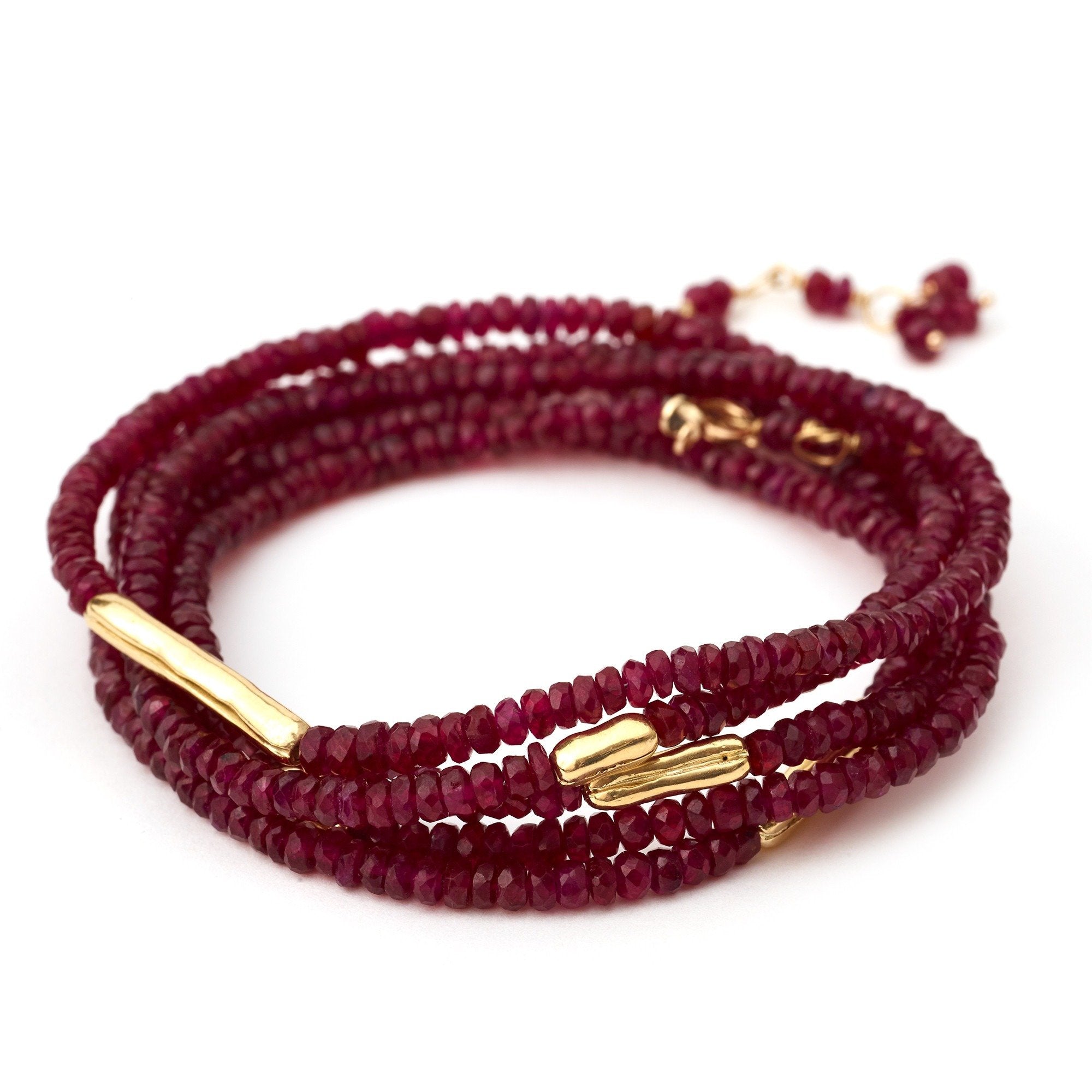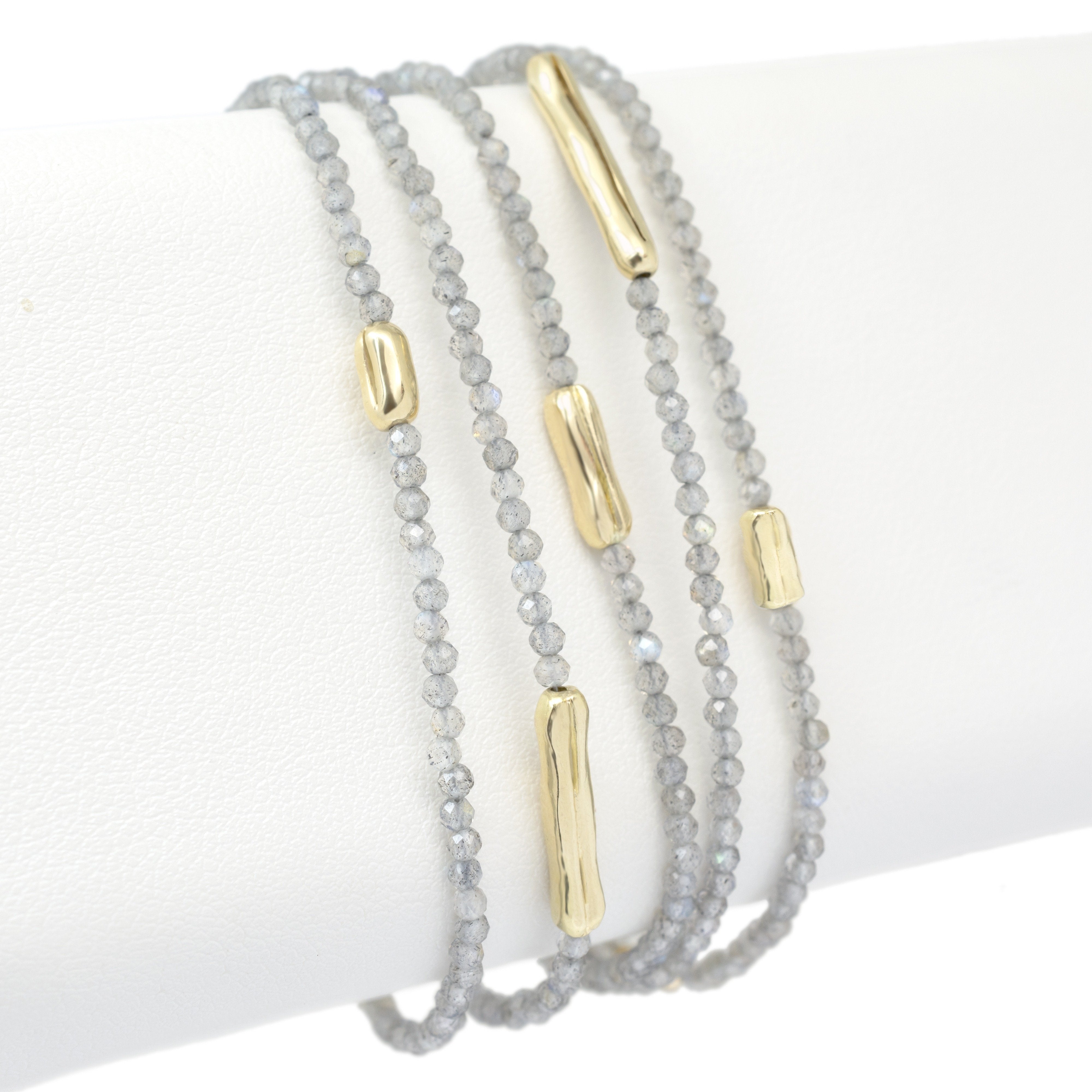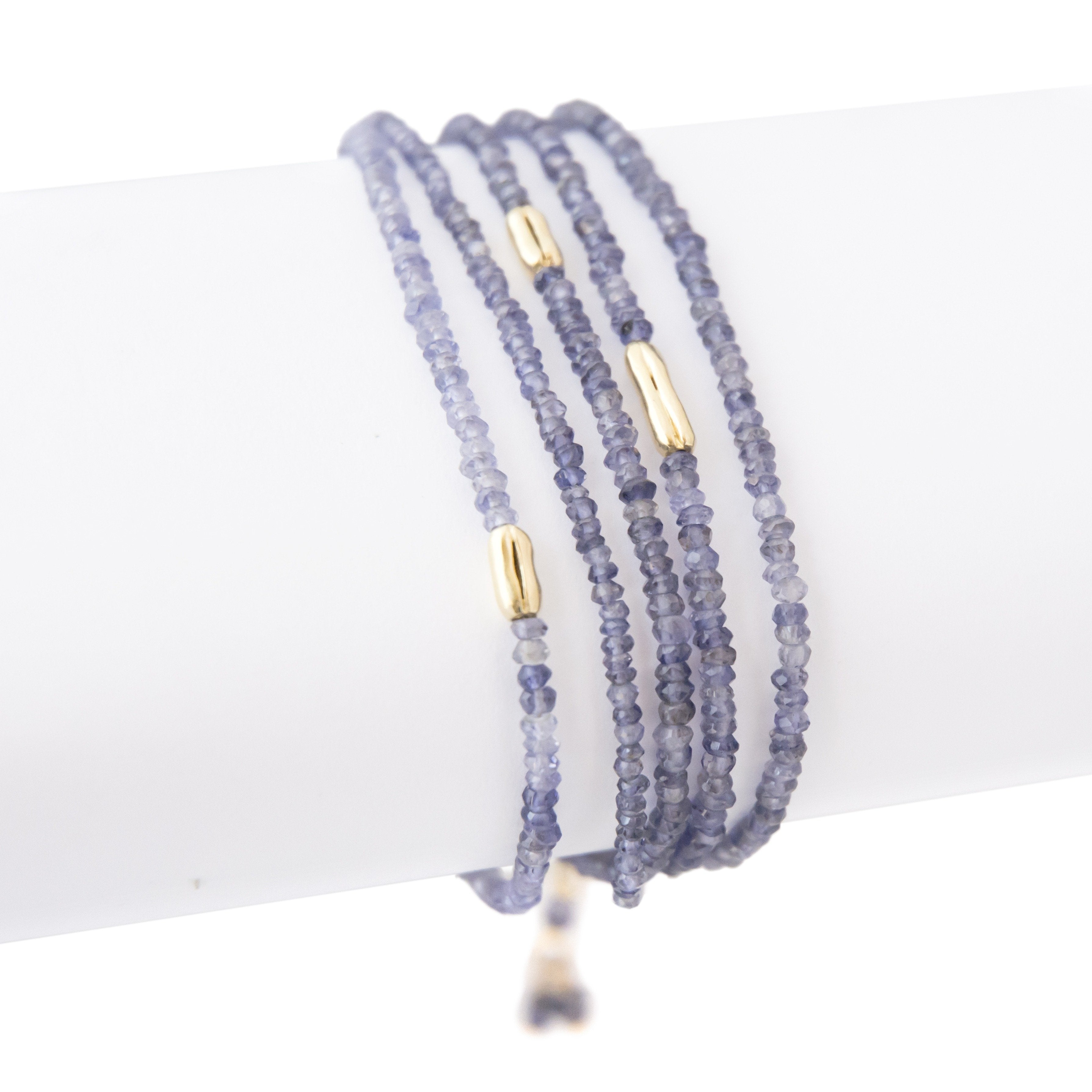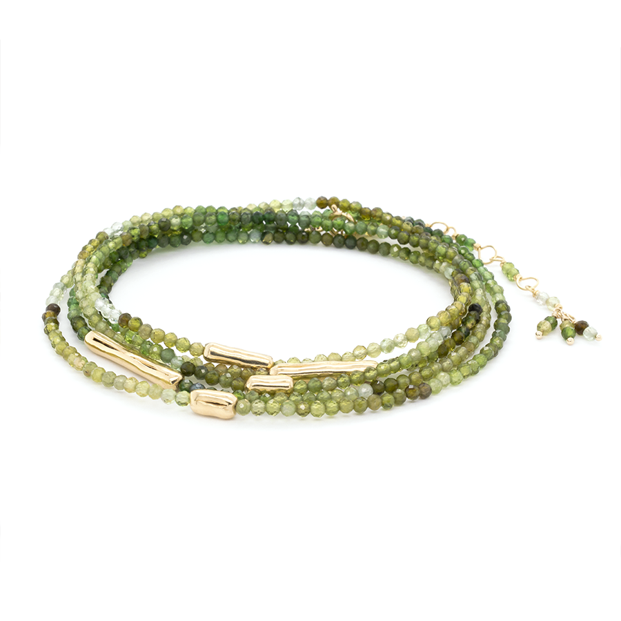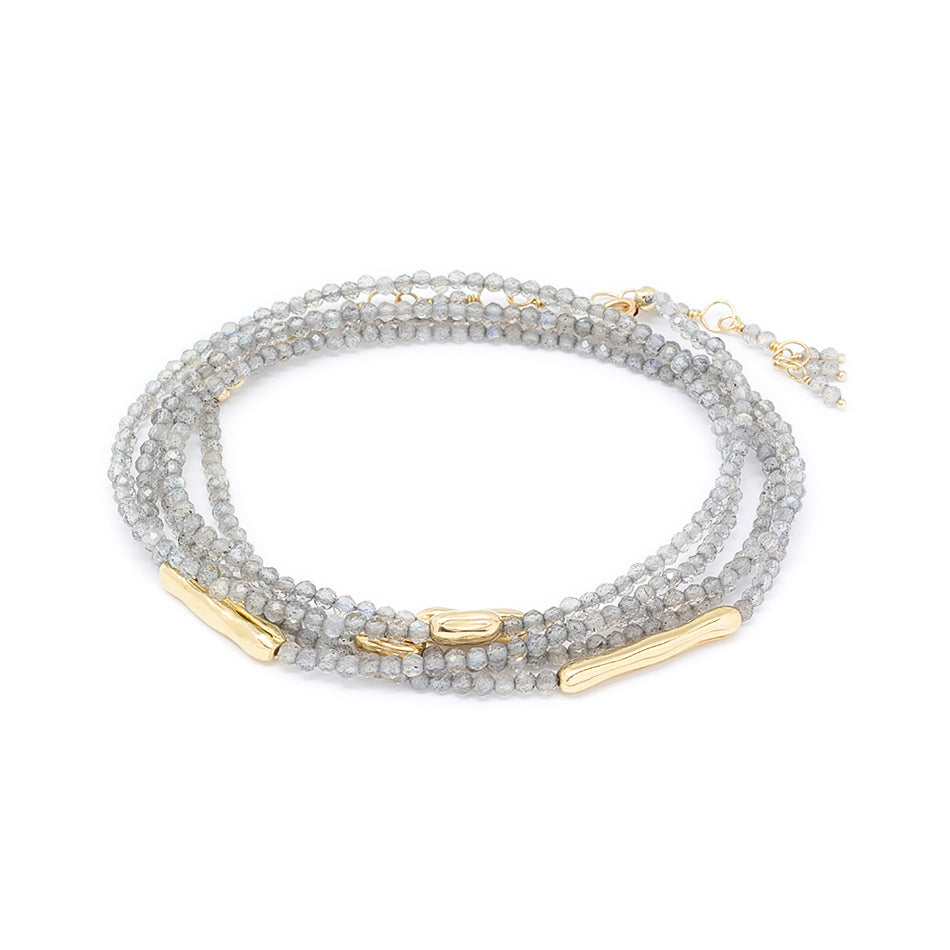 Strung 'Wrap' gemstone bracelet with 5 x gold organic log beads, clasp and tied extension.