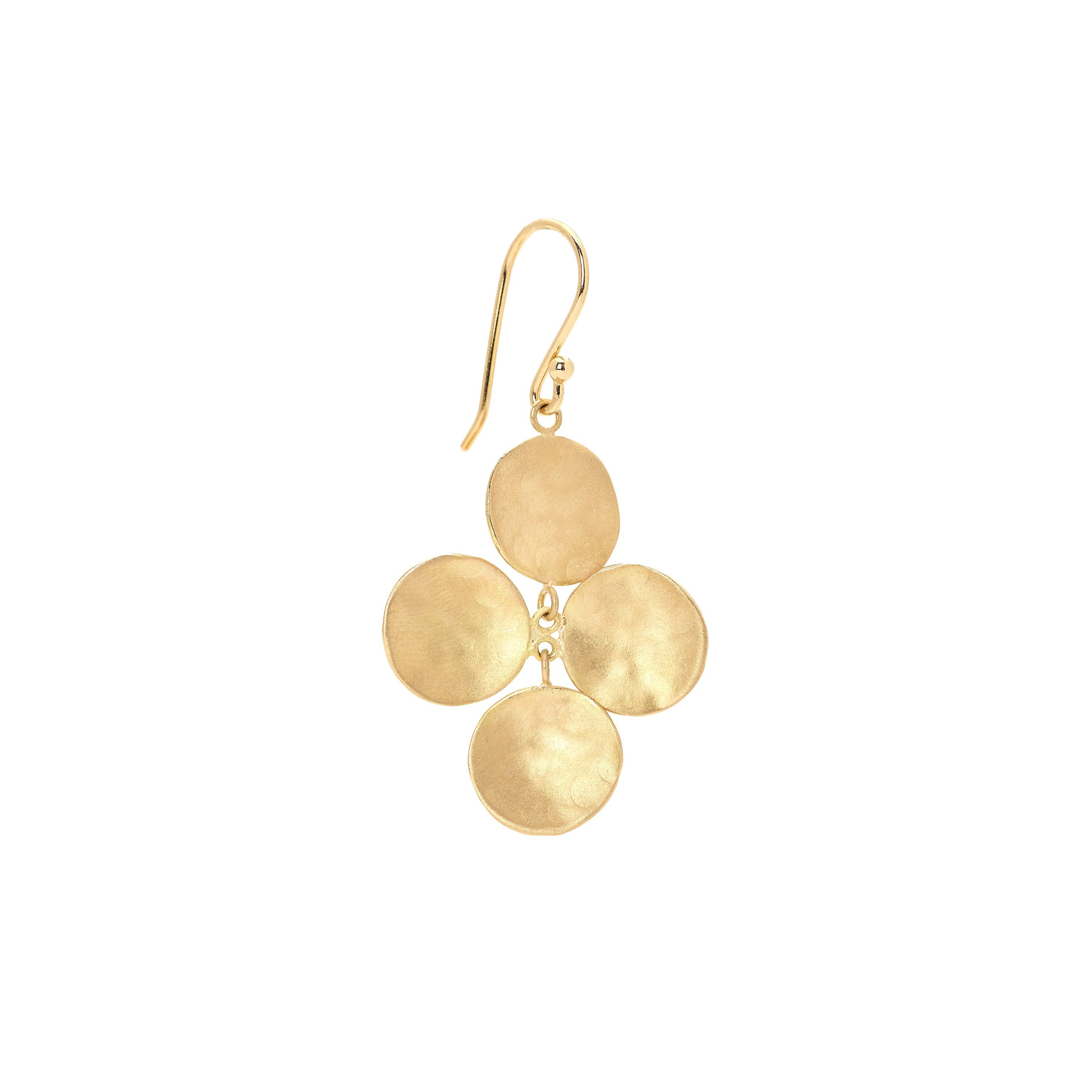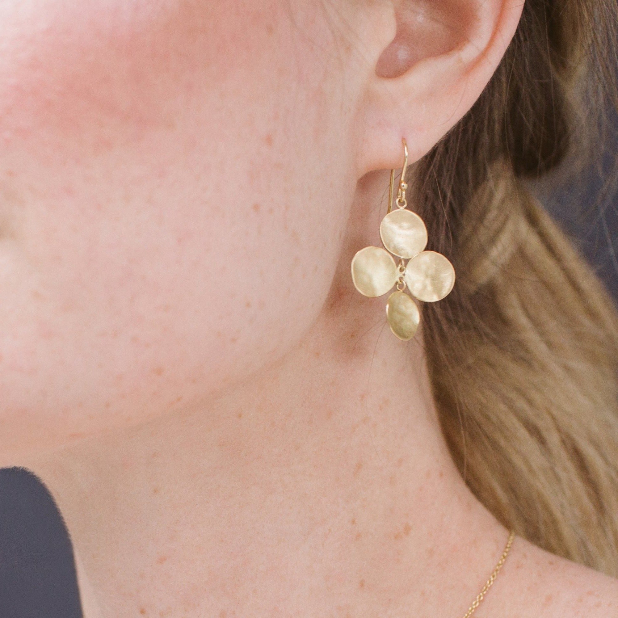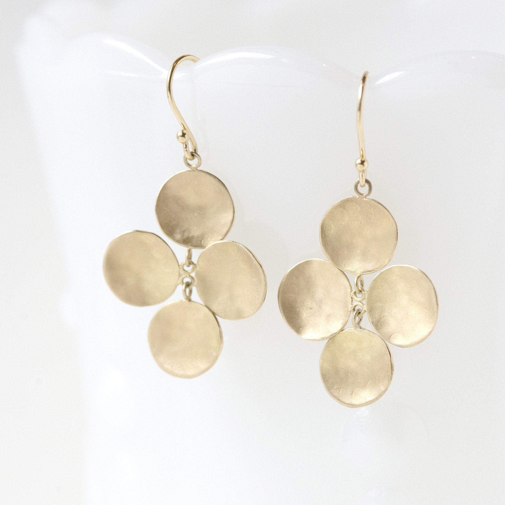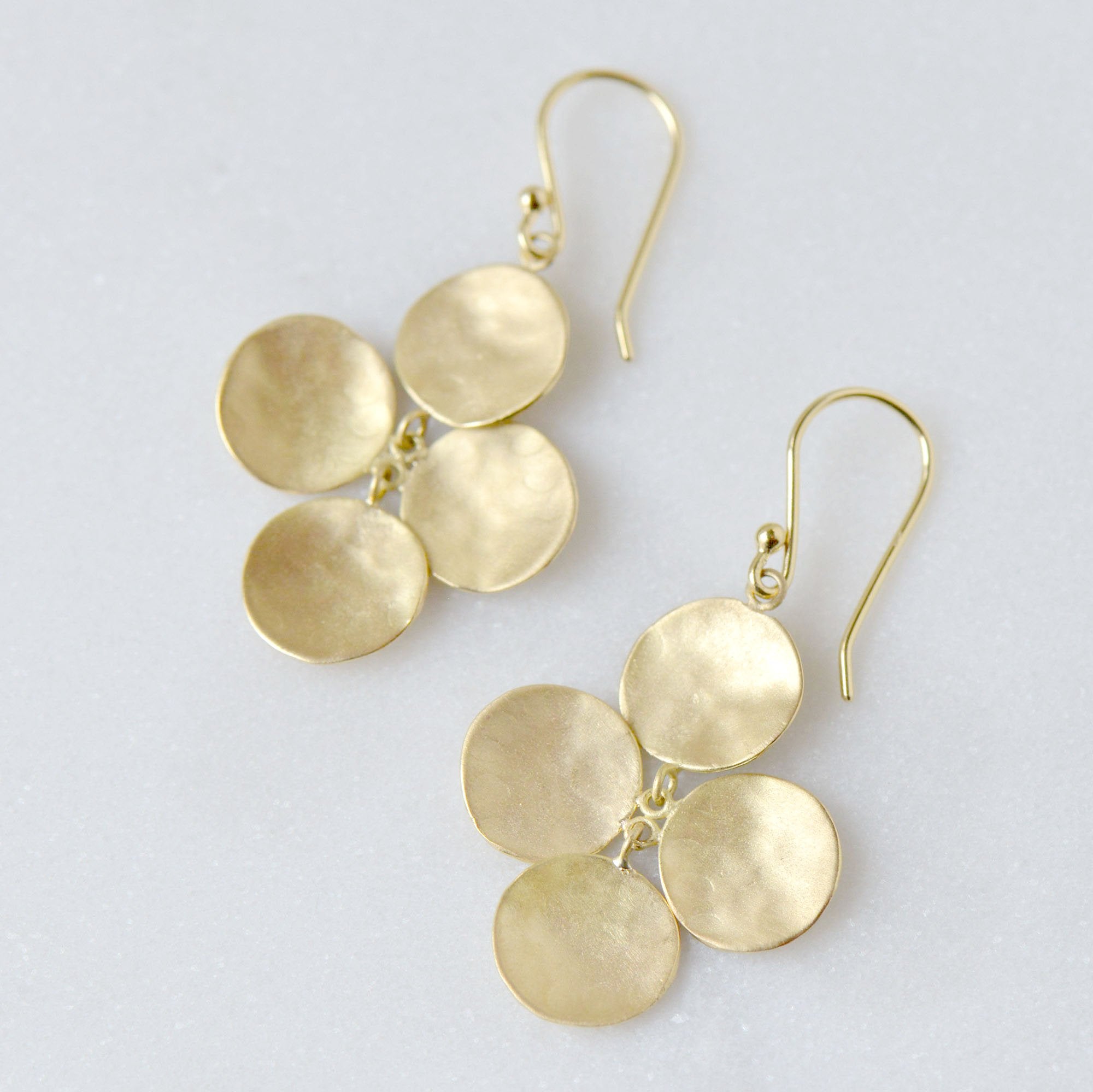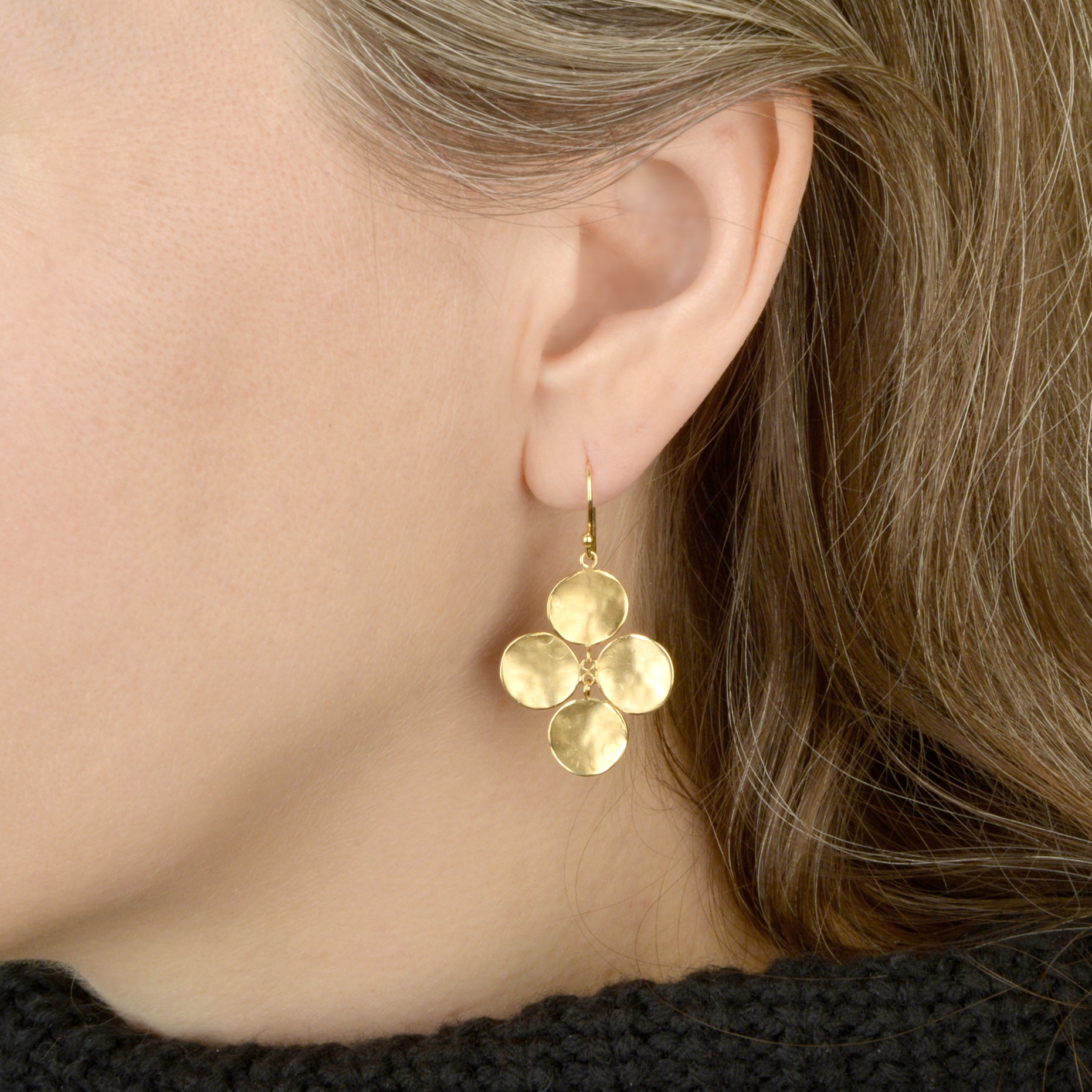 Anne's "Disc" collection with elegant hammered discs in a diamond formation. These earrings are bold and full of movement.
