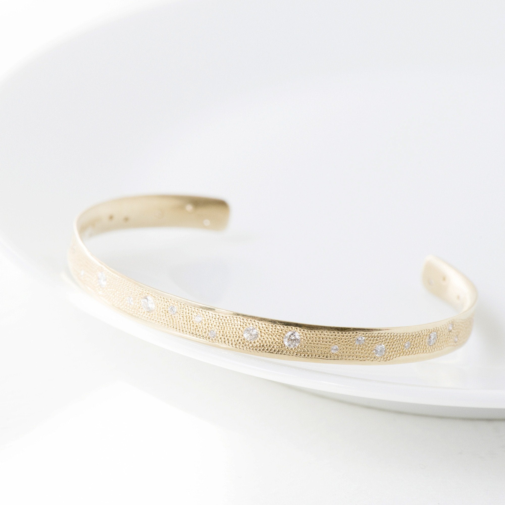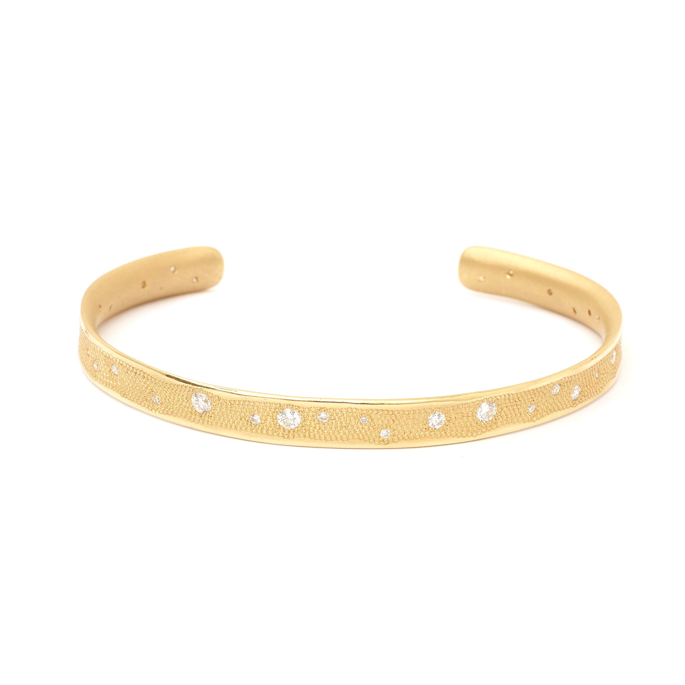 Gold "stardust" ~5mm wide cuff bracelet set with 31 mixed round brilliant cut G/VS diamonds, ~0.50 total carat weight.