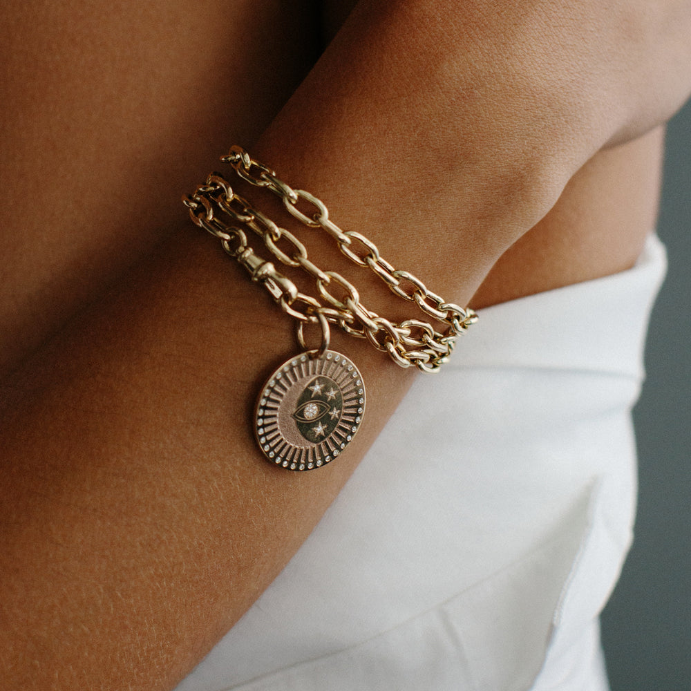14k extra large hollow square oval link chain necklace with a large round celestial protection medallion charm engraved with an evil eye, stars, and moon and white diamonds set around the border and in the center of the eye and stars. Necklace can also be worn as a wrap bracelet.