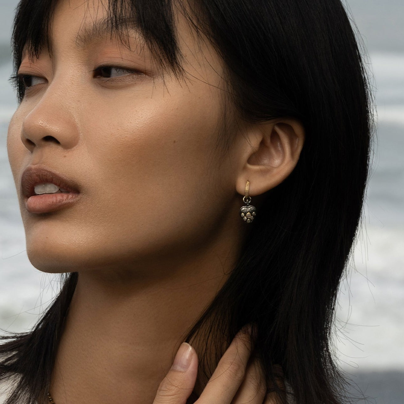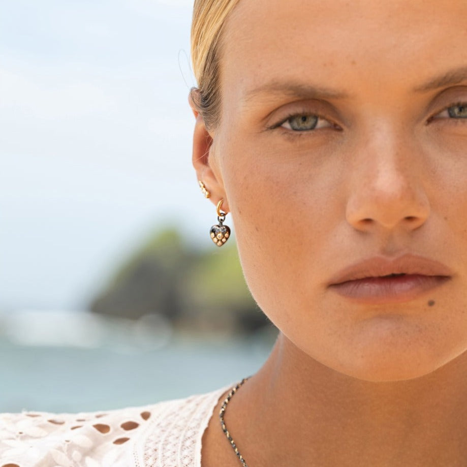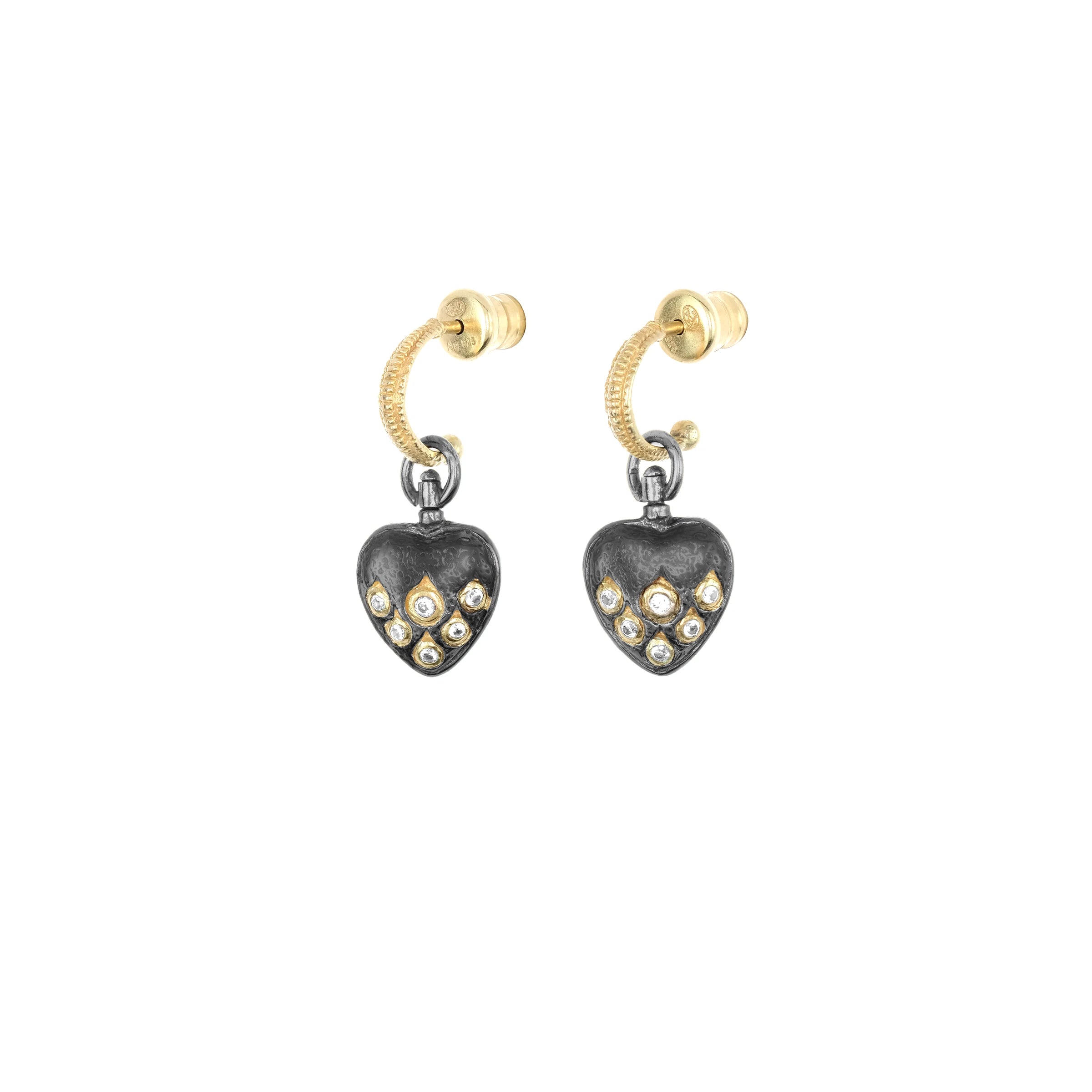 Truly charming heart-shaped pendants swivel on huggie half hoop earrings.
