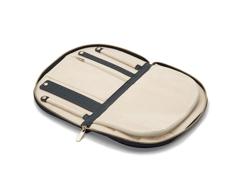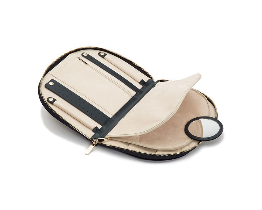 - Storage: Earring holder (2), ring roll (2), zip pocket medium (1), zip pocket large (1), necklace holder (4), removable round mirror (1)
