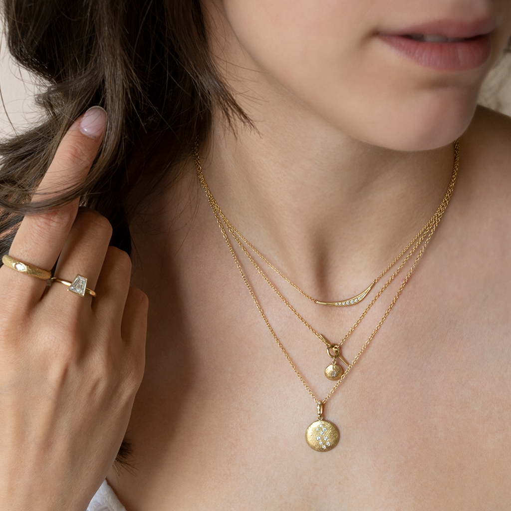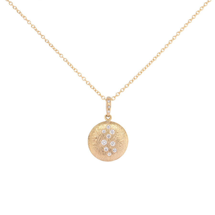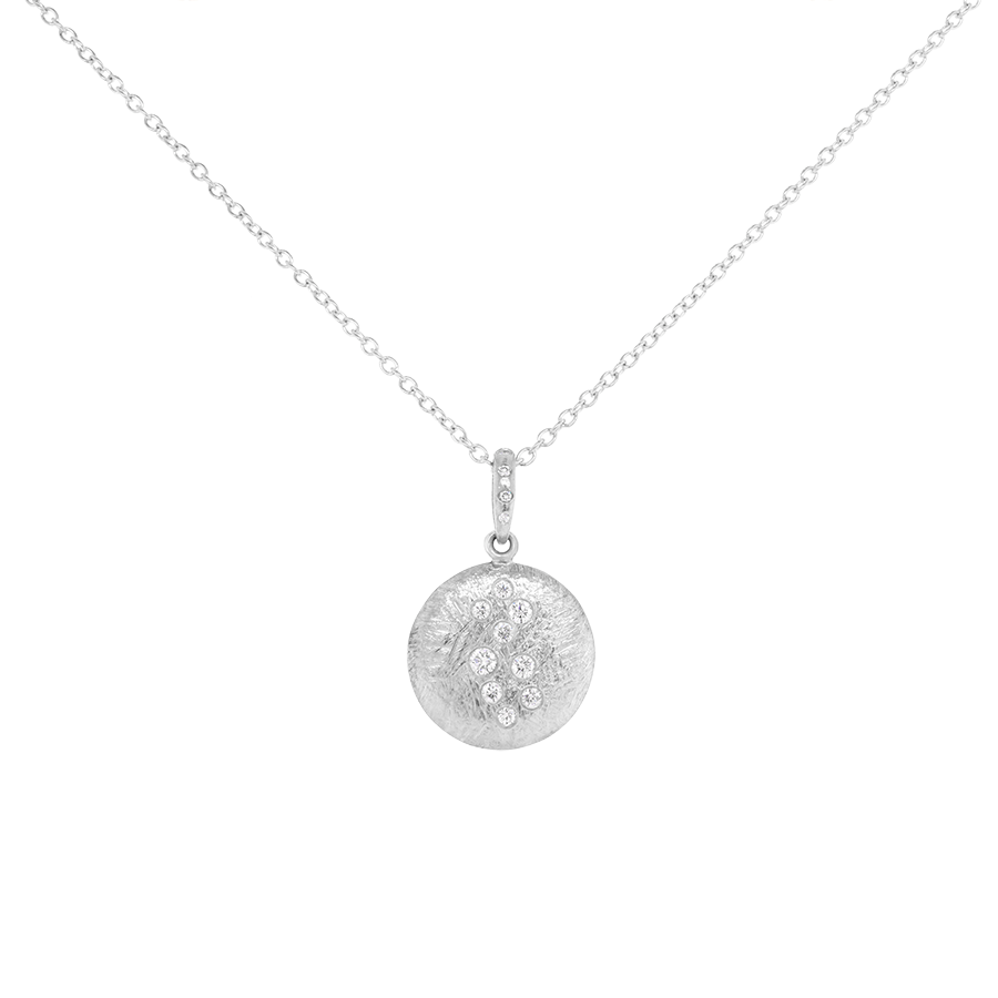 Impactful yet understated, the large 'Boulder' disc diamond studded pendant luxuriously suspends from our own hand carved large diamond pave bail.