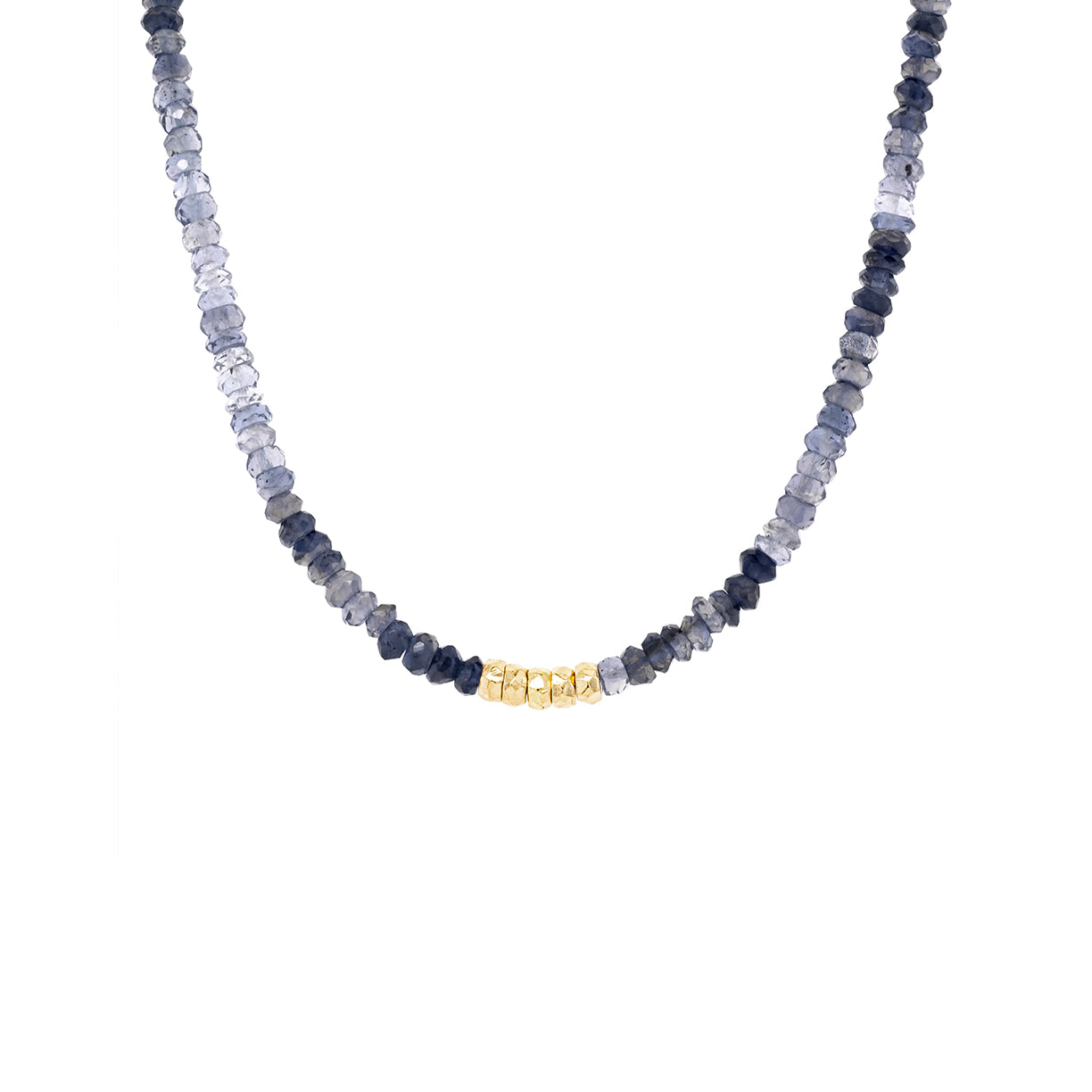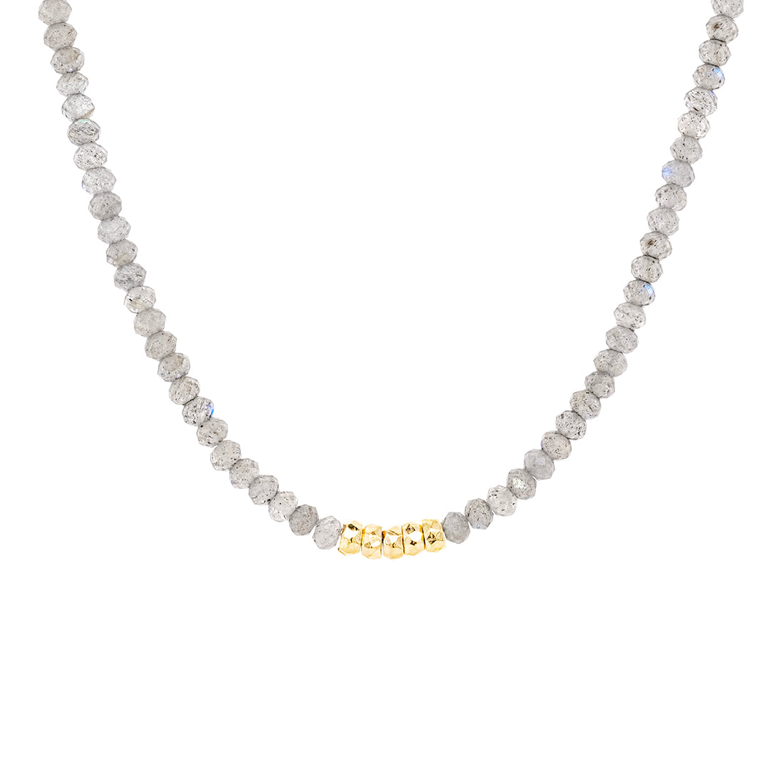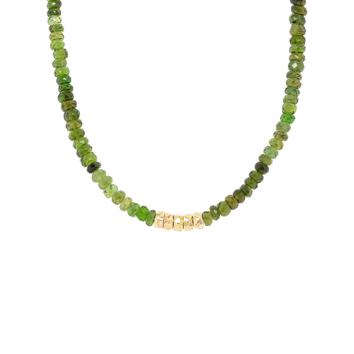 Bold Sparkling gemstone beads perfectly complemented by 5 of our hand carved hammer faceted gold beads in the center front.