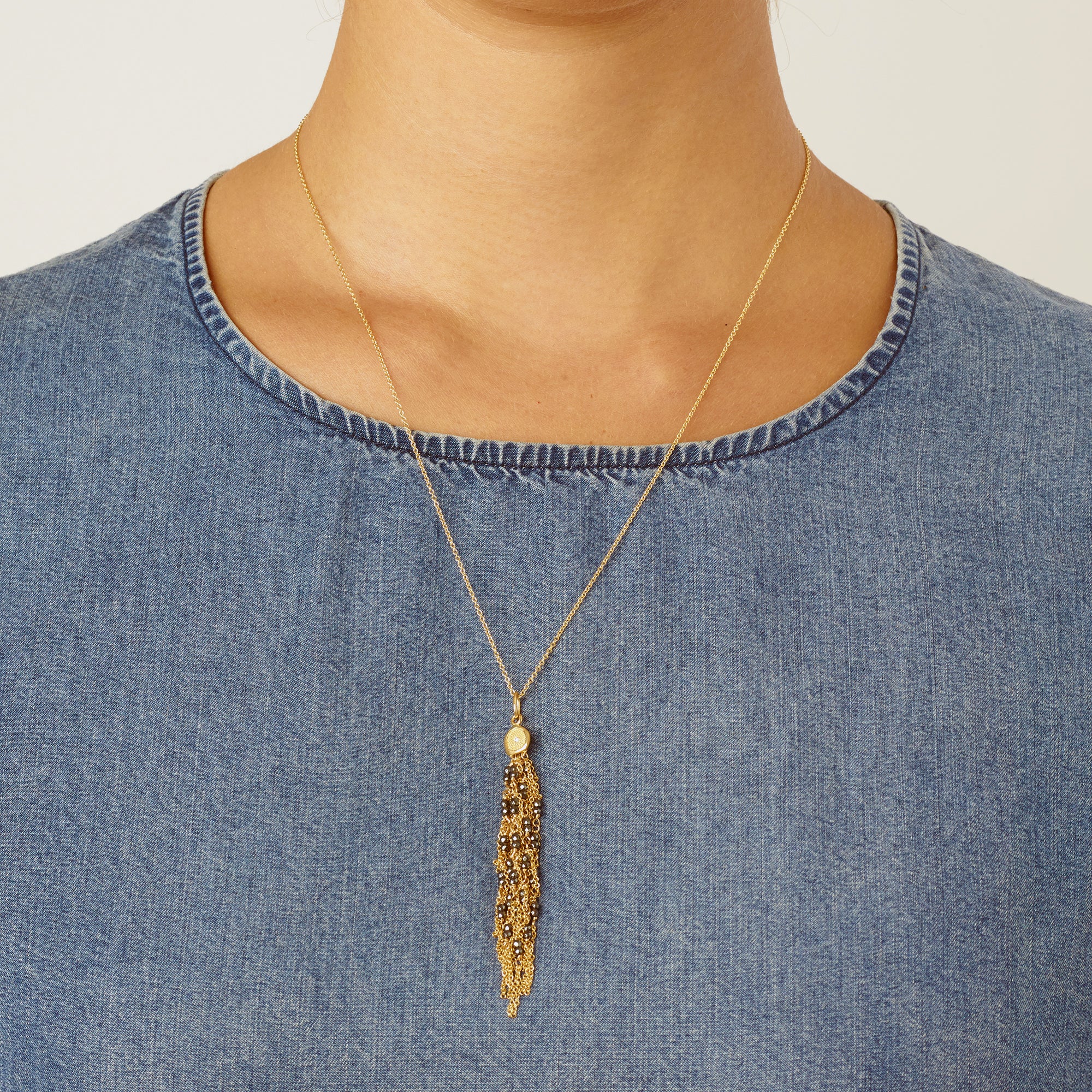 Dazzling eye catching movement: 18k yellow gold stardust disc charm set with 0.01ct round brilliant cut g/vs diamond and 5 strands of tied hematite beads and chain tassels below.