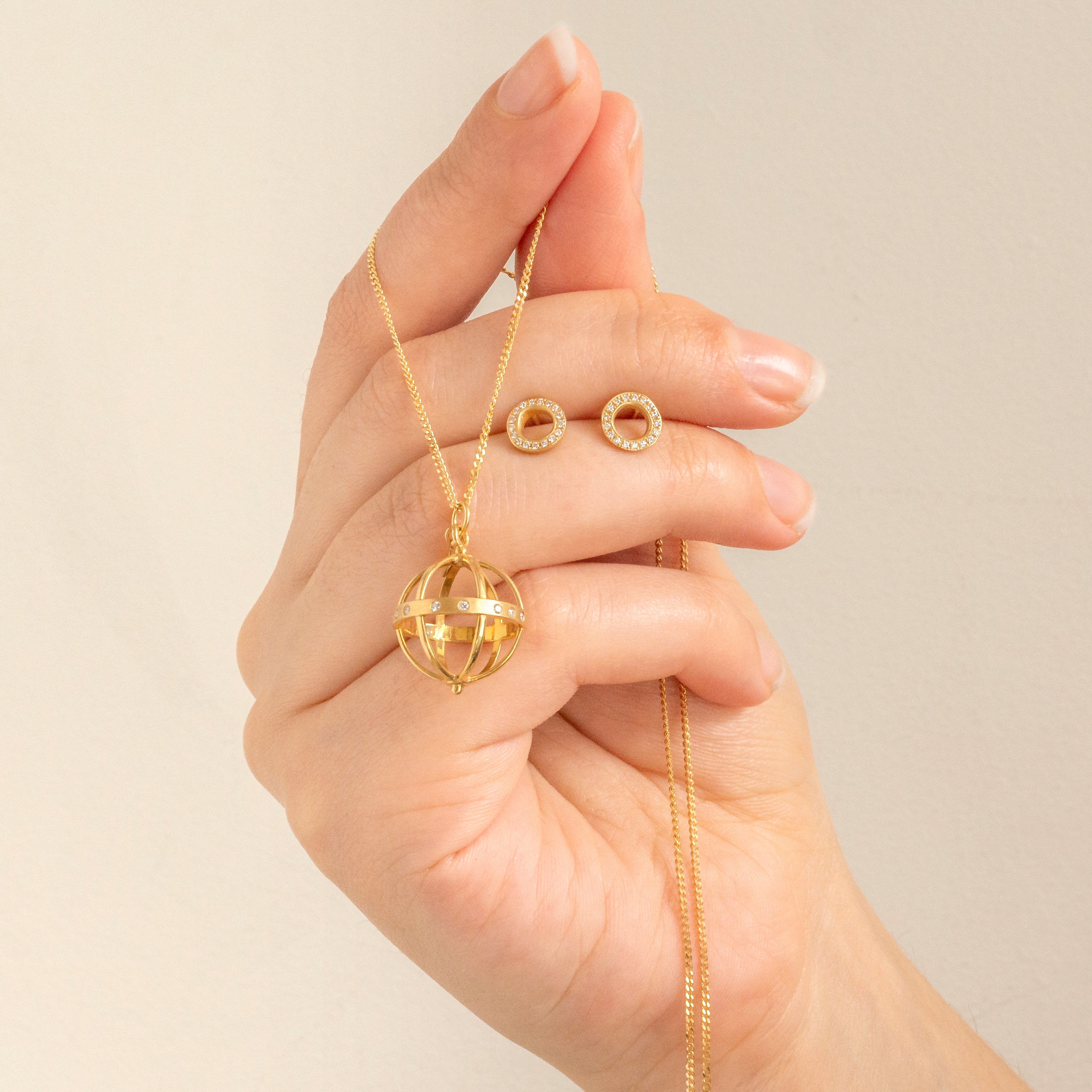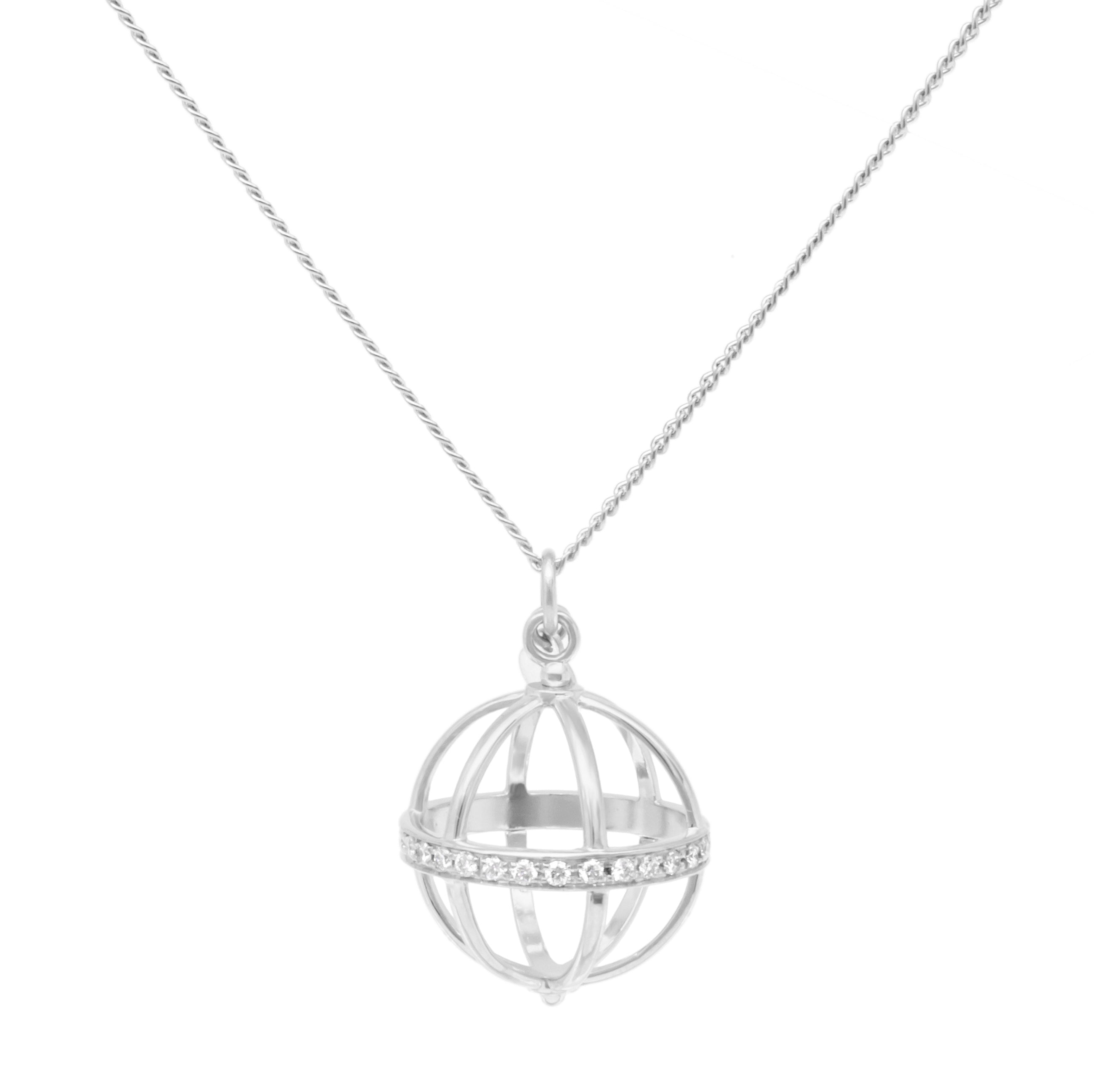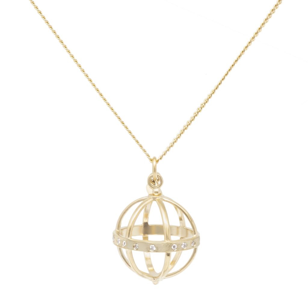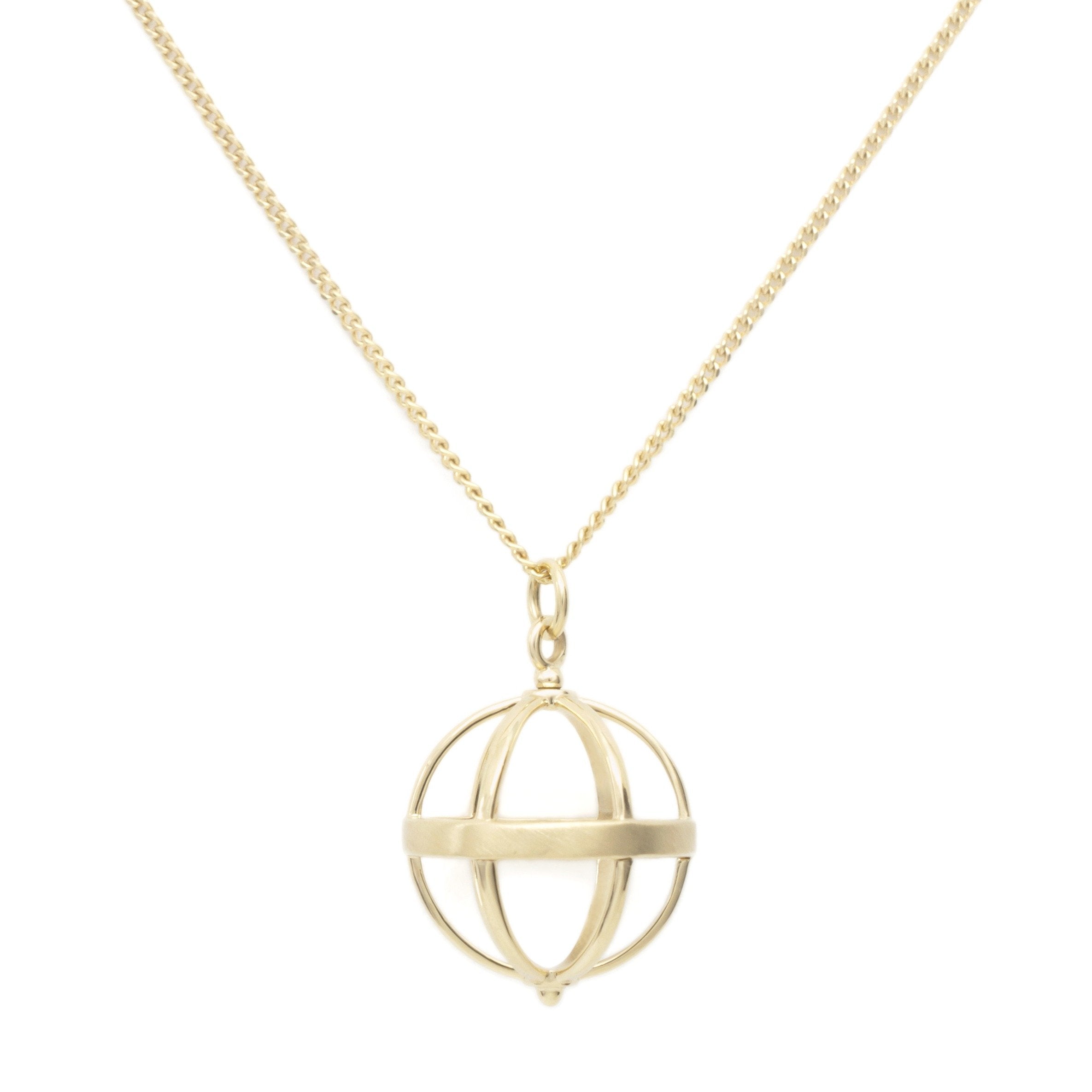 18k yellow gold necklace with large cage pendant (16mm), on fine curb chain 22-24" length.