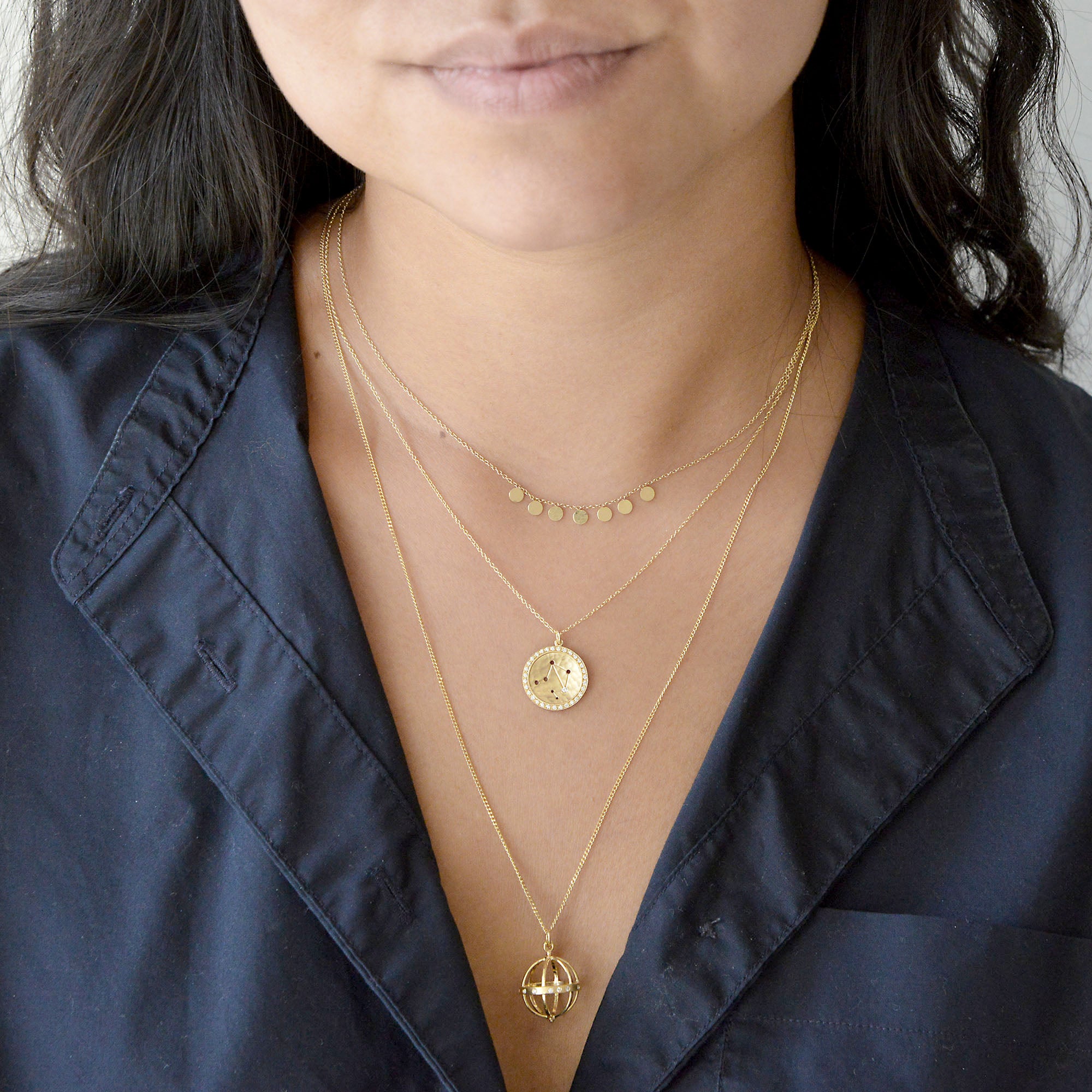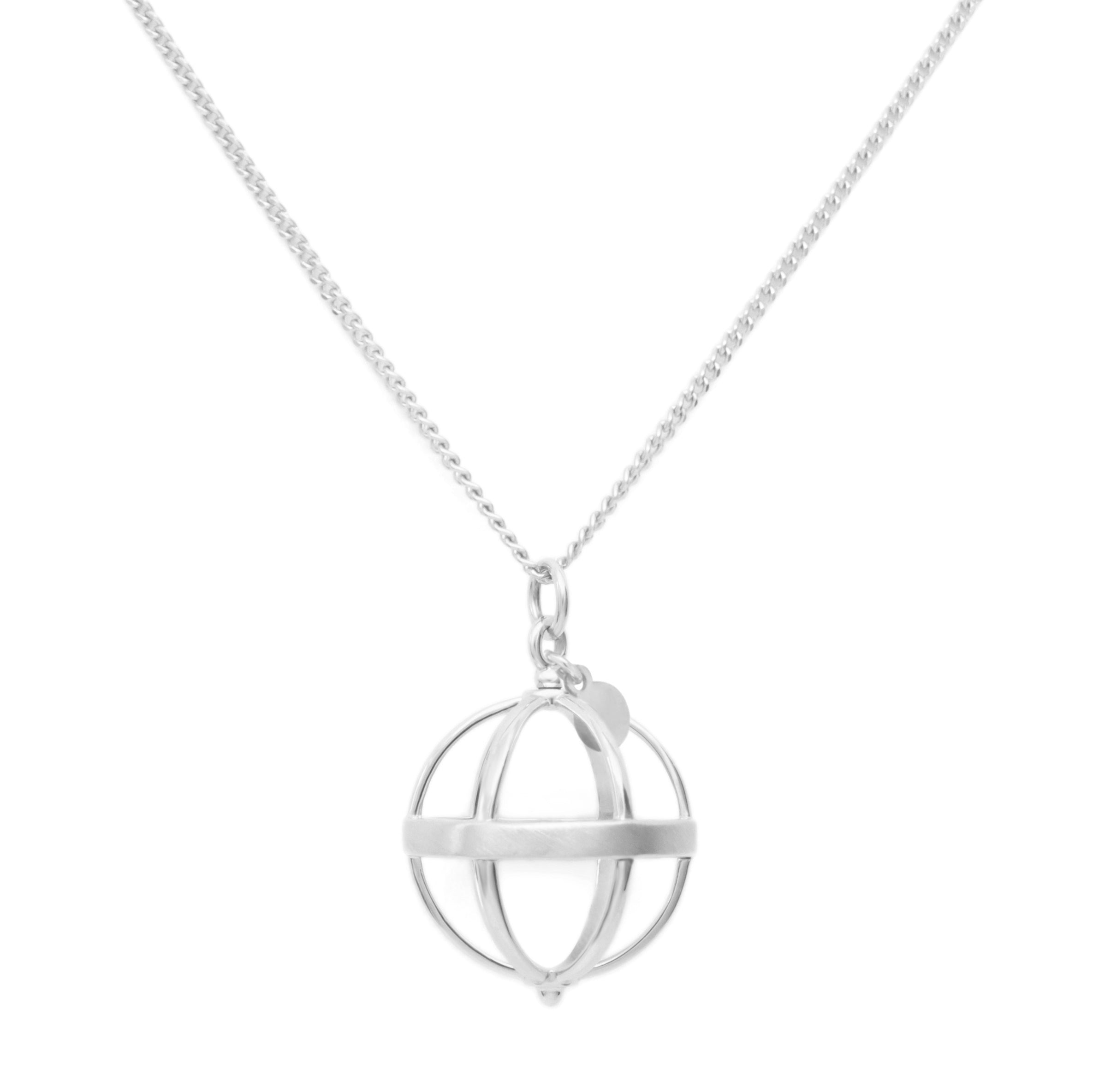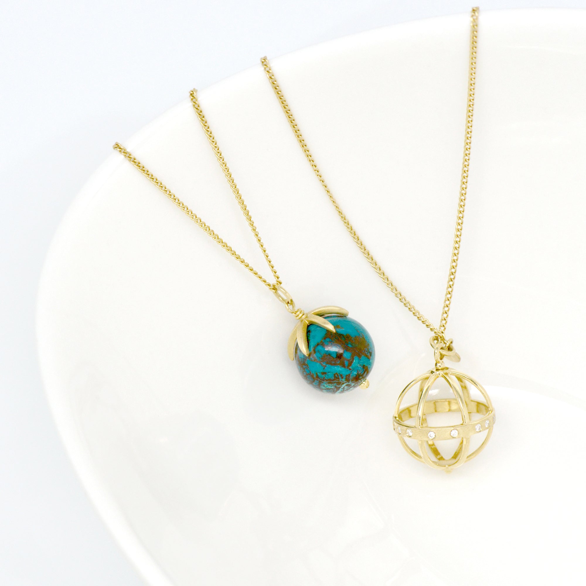 18k yellow gold necklace with large cage pendant (16mm), on fine curb chain 22-24" length.