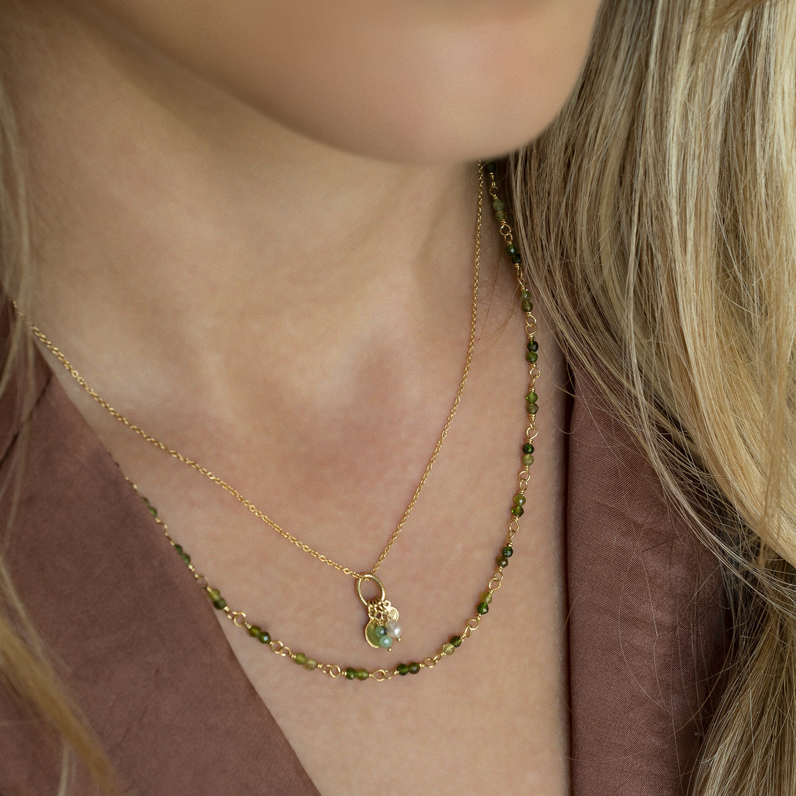 Perfectly Petite and made to layer: Solid 18k yellow gold charm necklace with our classic Mini Hammered Disc, paired with a delicate Baby Pearl, logo tag and beaded gemstone drop.