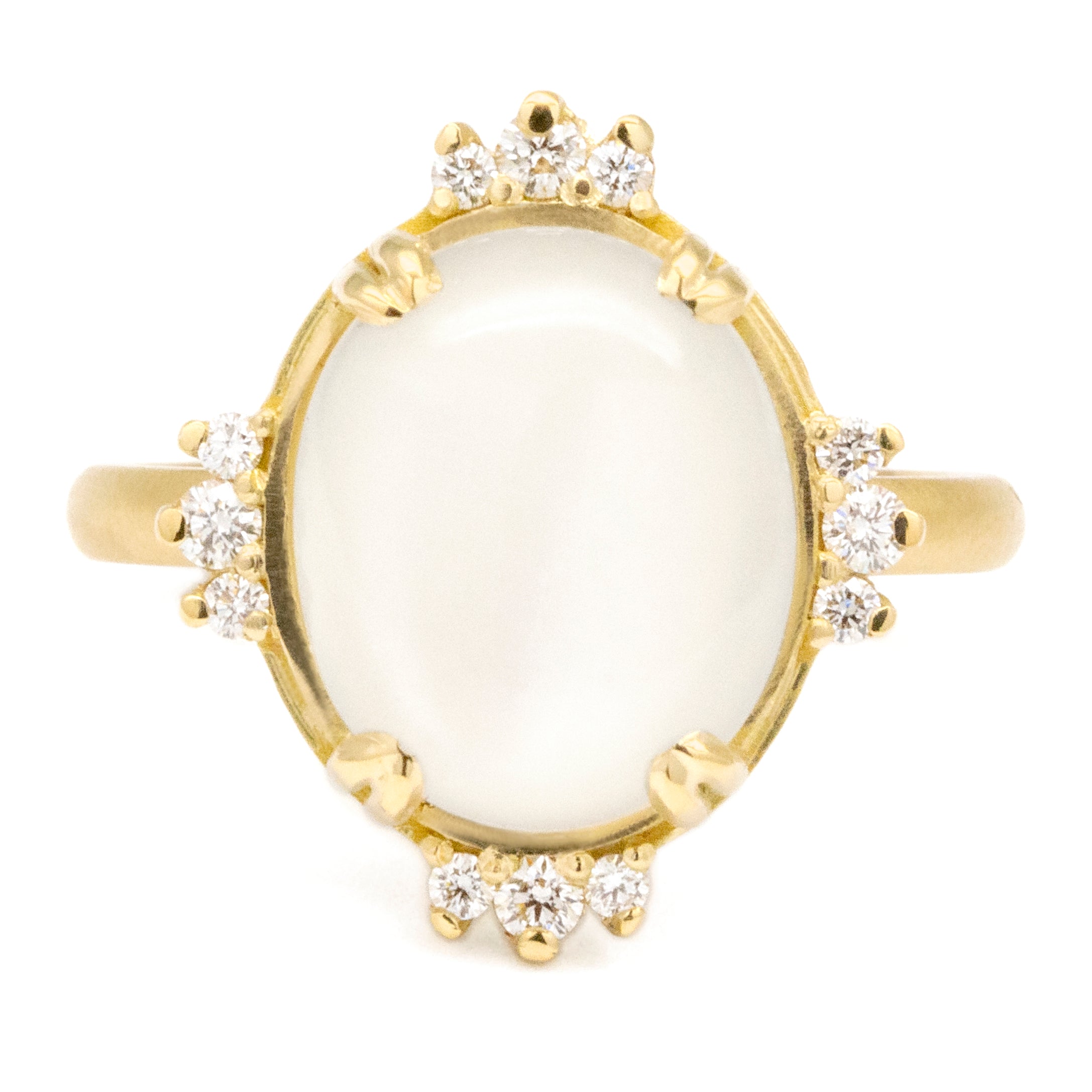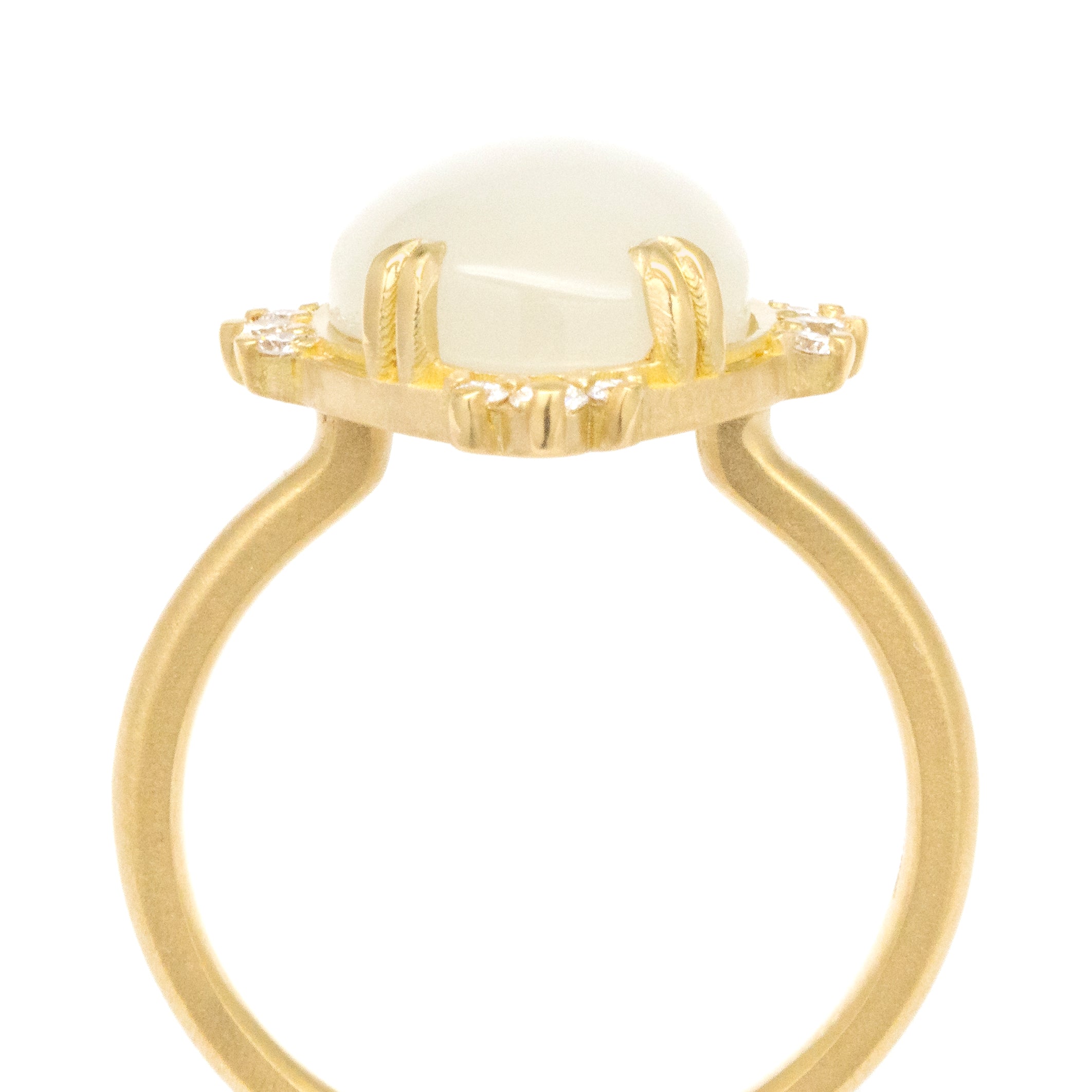 18k yellow gold ring with double prong set moonstone and set of four diamond clusters around the stone.