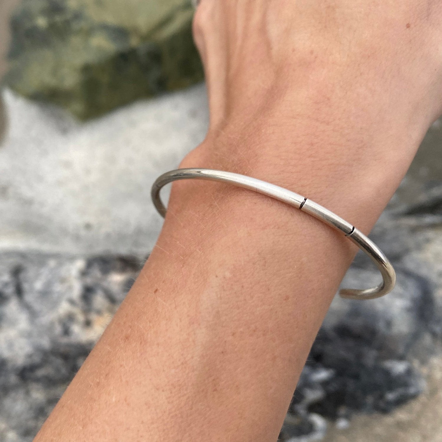 This 2.5mm wide, hand-hammered "Duality" cuff bracelet has three hand-carved lines that are oxidized and really pop against the silver.