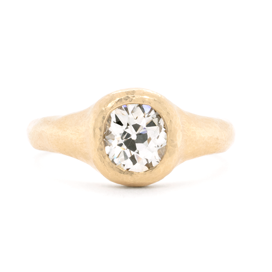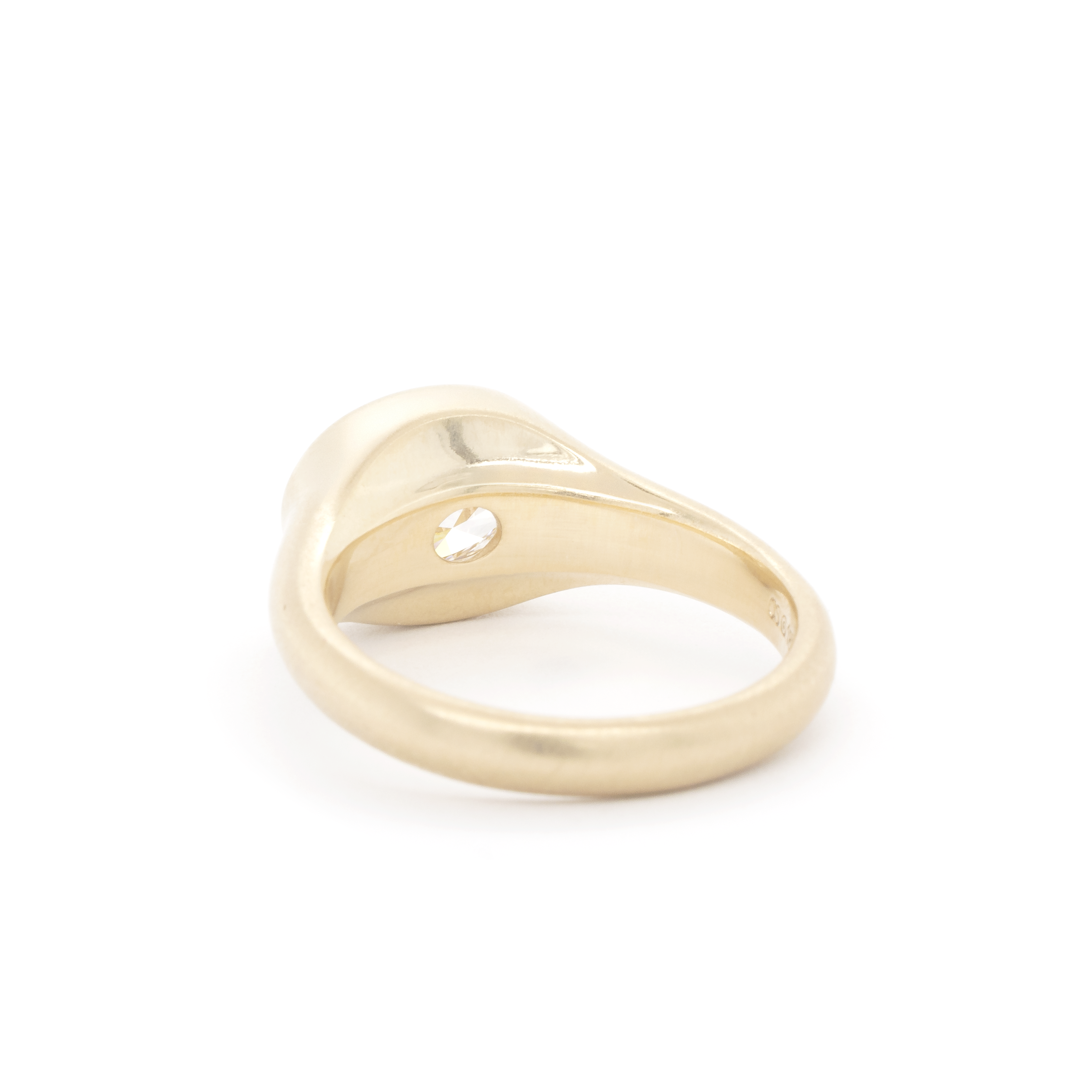 The Side Profile: Our soft signet-inspired style fully encompasses your diamond, keeping the ultimate low profile. We have a signature smooth cut-out towards the bottom, allowing you to stack it with another ring.