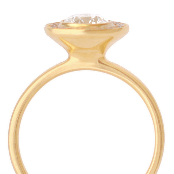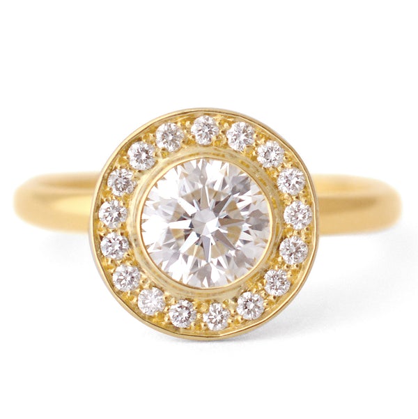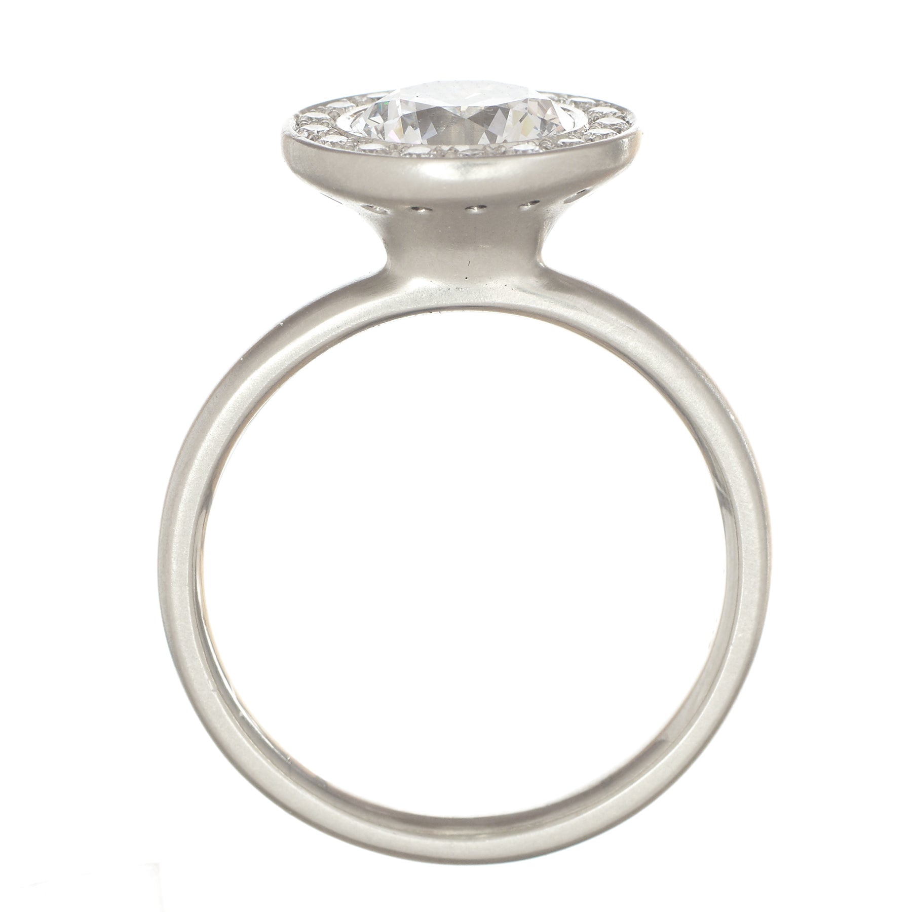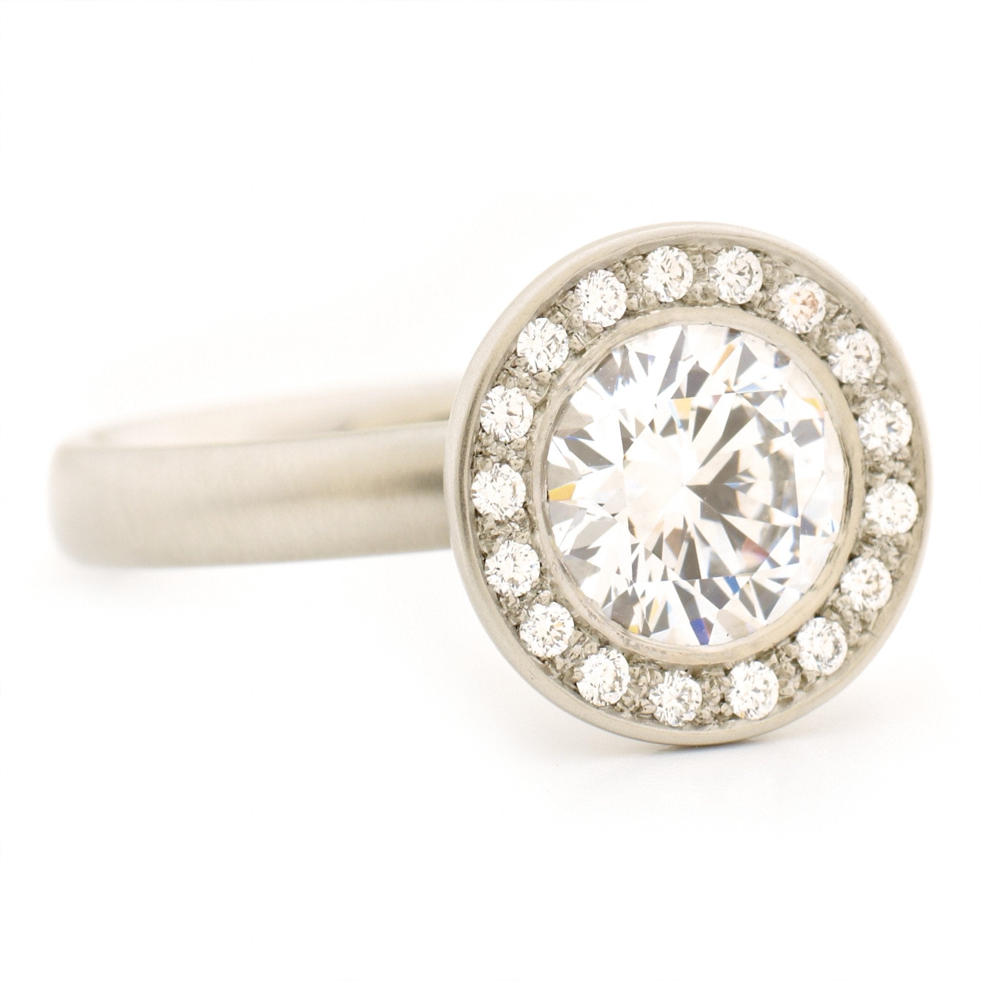 The Setting: A delicate pave diamond halo Using 1.1mm RBC G-VS diamonds and a simple bezel setting for the center stone.