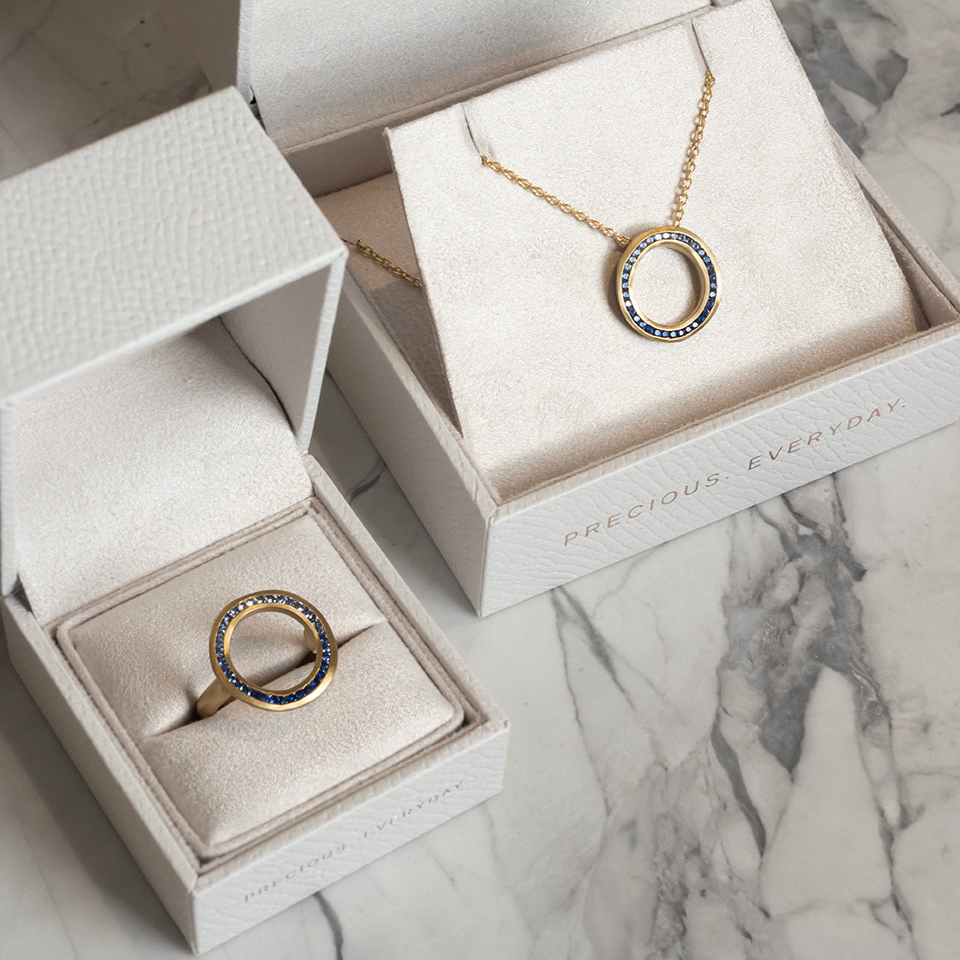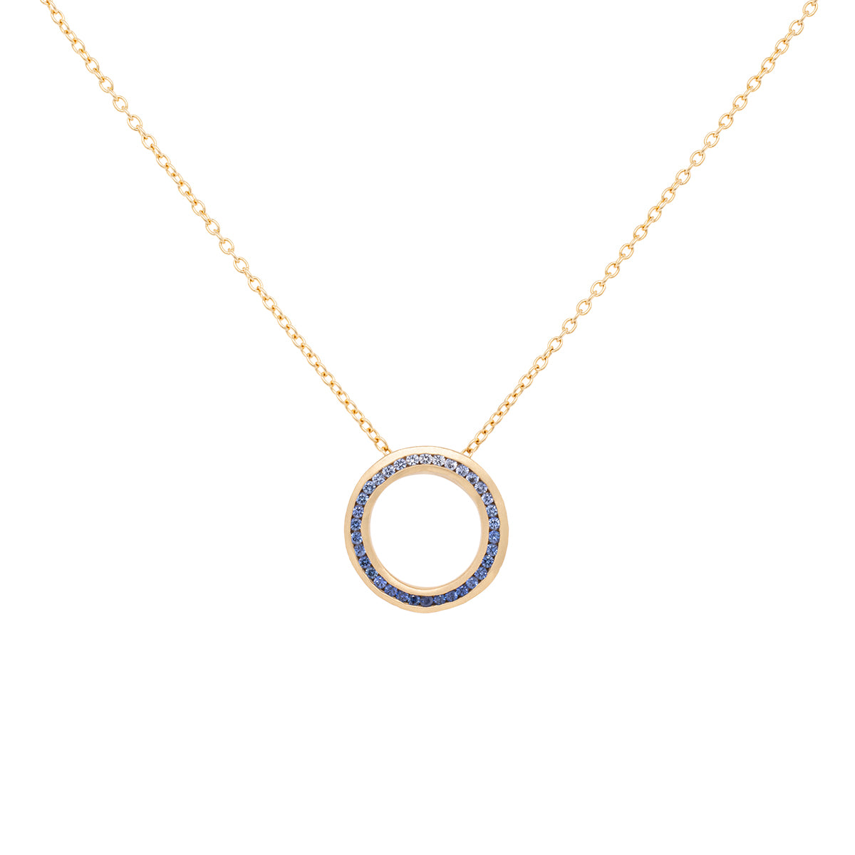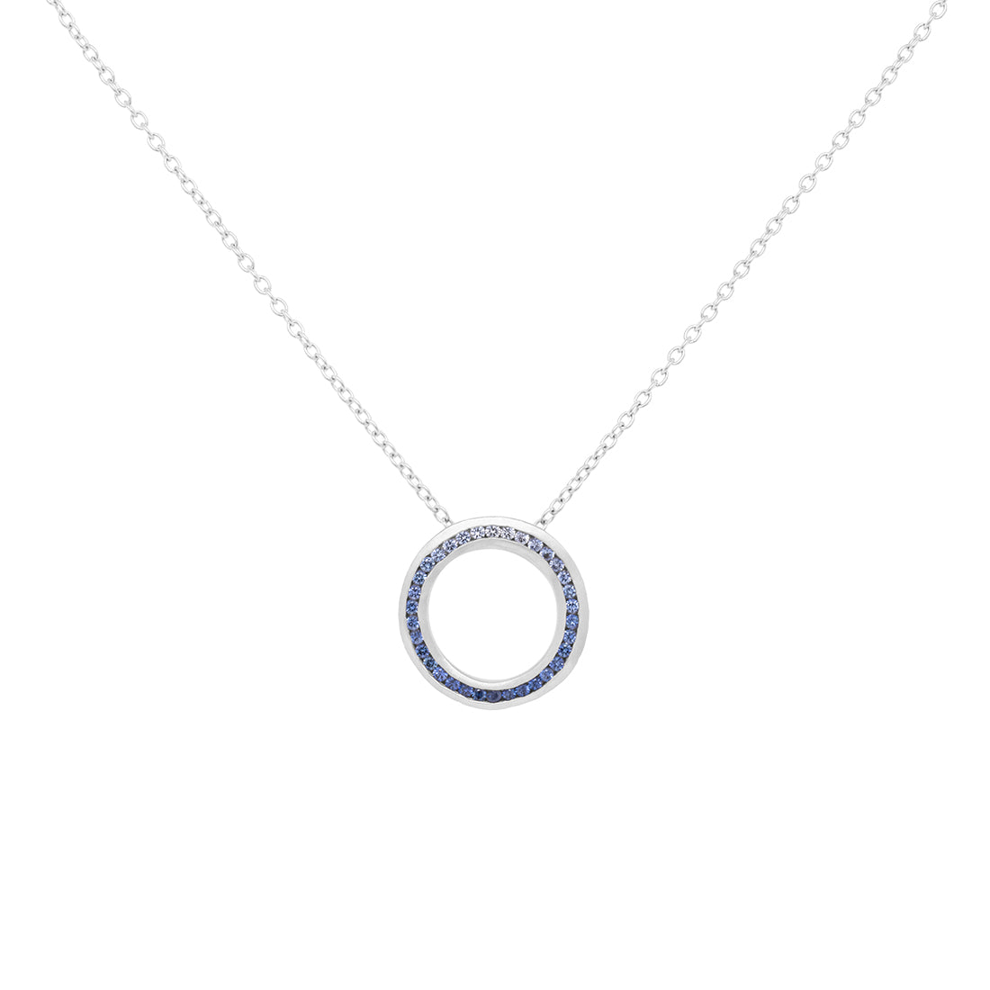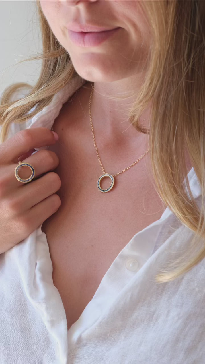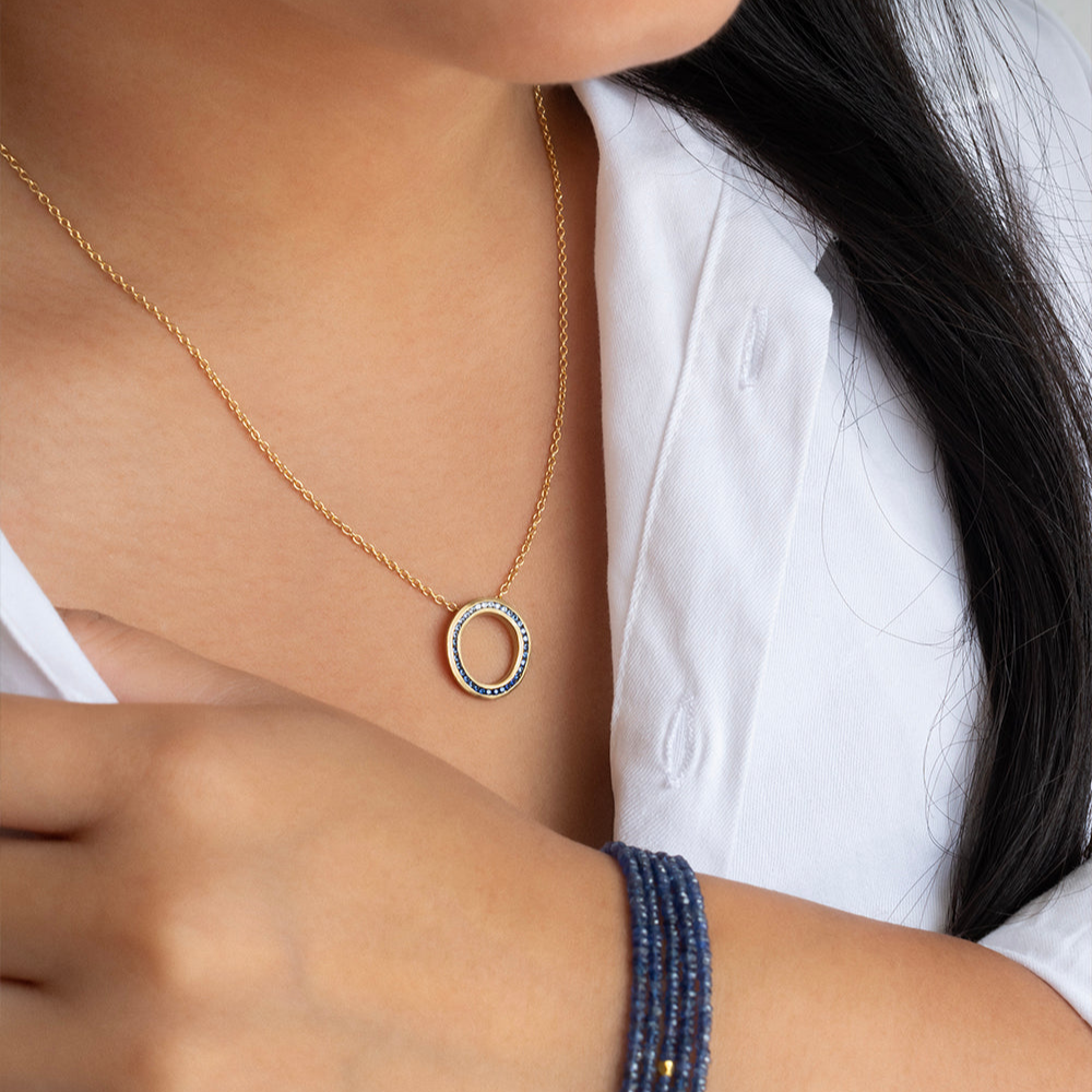 Like an enchanting sea cove... Our gorgeous organic open circle ombre blue sapphire necklace transports you to a calm and beautiful moment on the water.