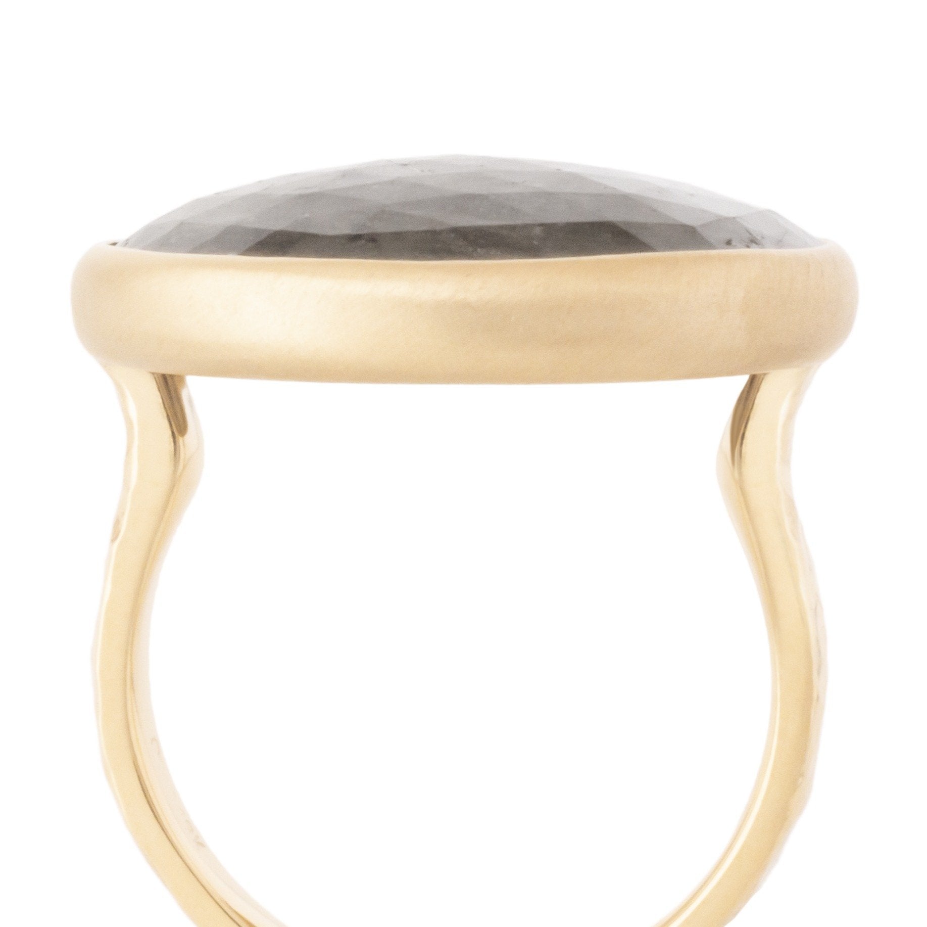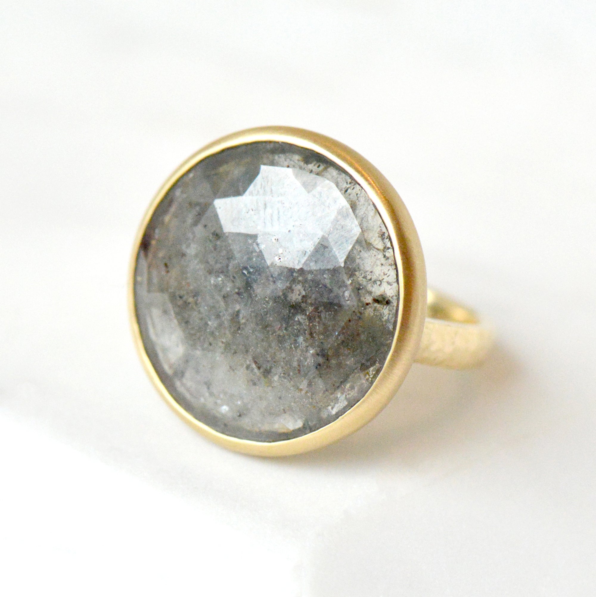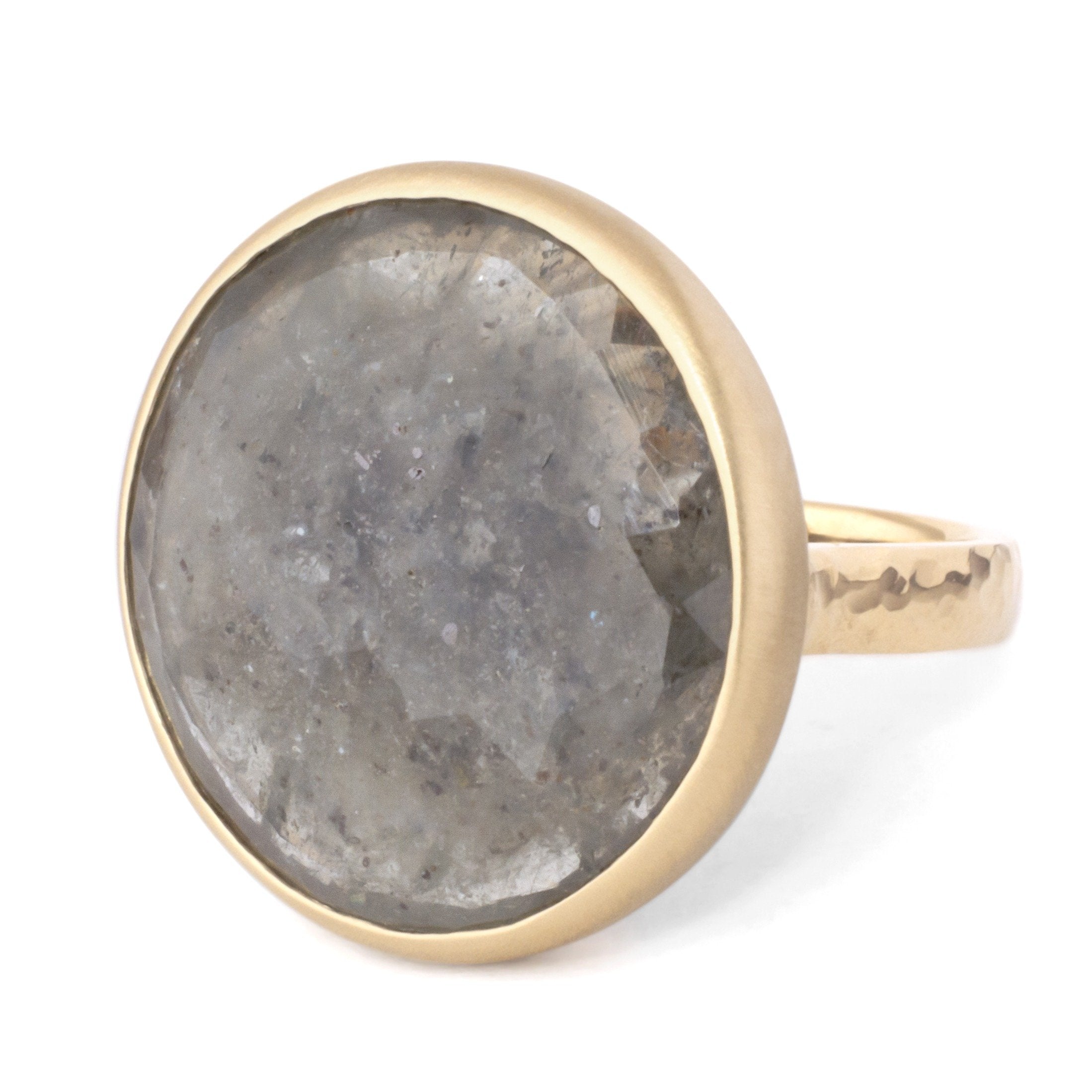 One of a kind statement piece: The 20.91ct rose cut round rose cut "Stormy Sky' grey sapphire takes center stage in an 18k yellow gold ring with hammered band.