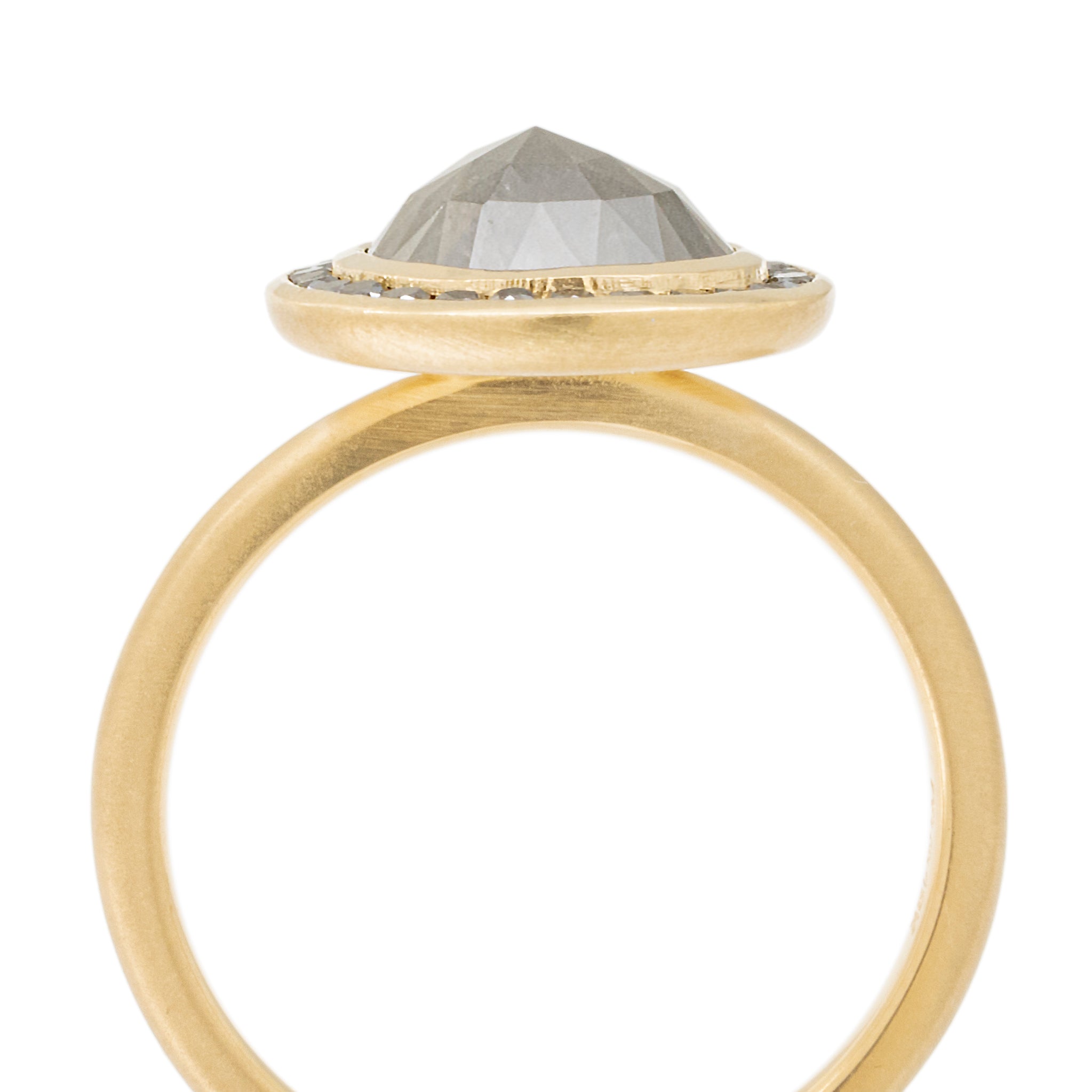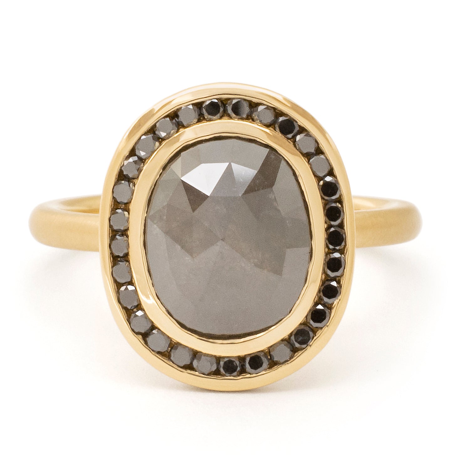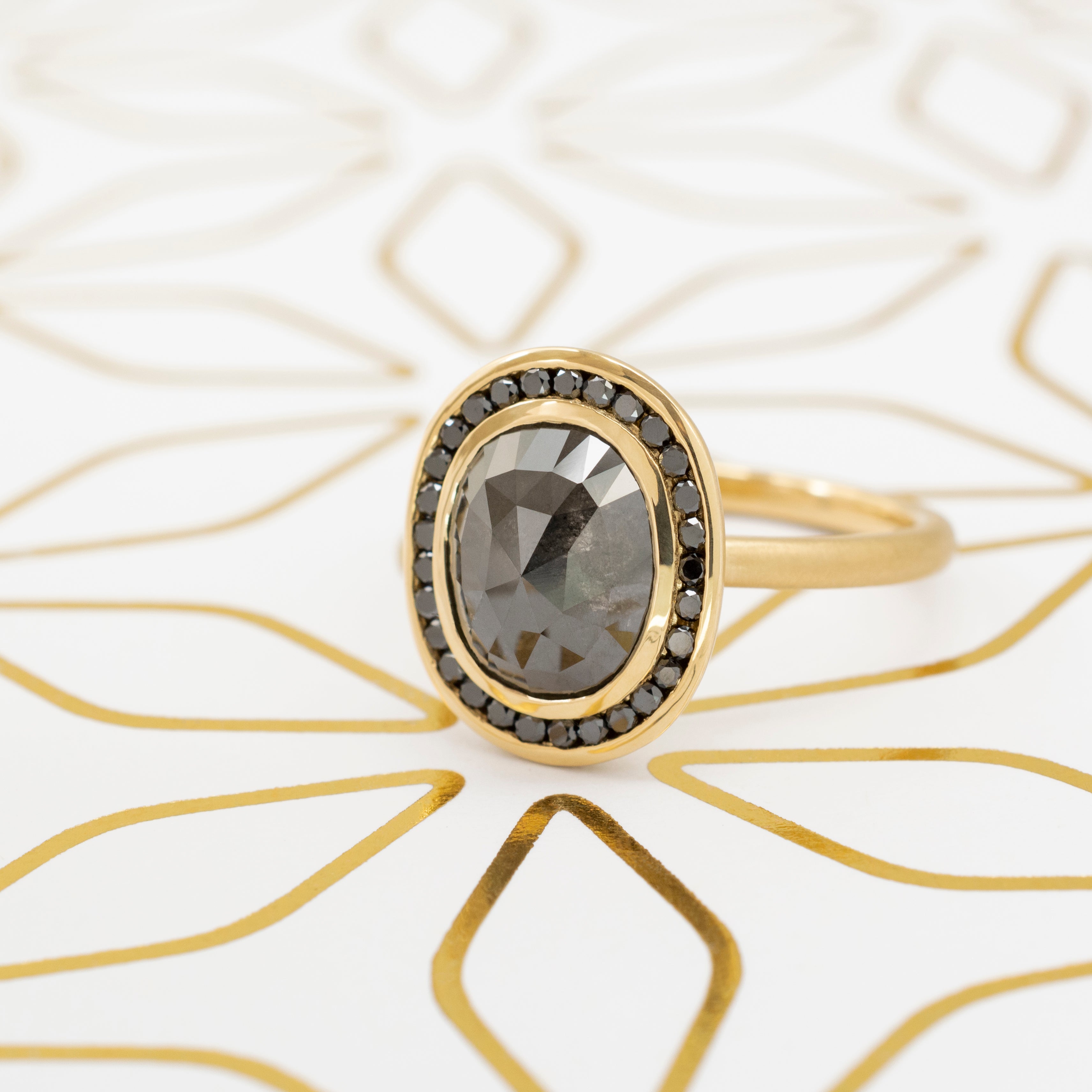 One of a kind 18k yellow gold ring with bezel set 2.68ct salt + pepper oval diamond (9.87 x 8mm), with black diamond channel halo (28 x 1.2mm round brilliant cut) 2mm band.