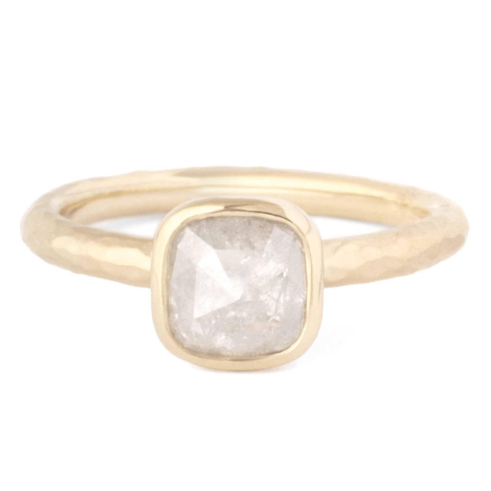 One of a Kind 18k yellow ring with bezel set 0.86ct grey cushion rosecut diamond (6.31x5.87mm). 2.1mm hammered band.