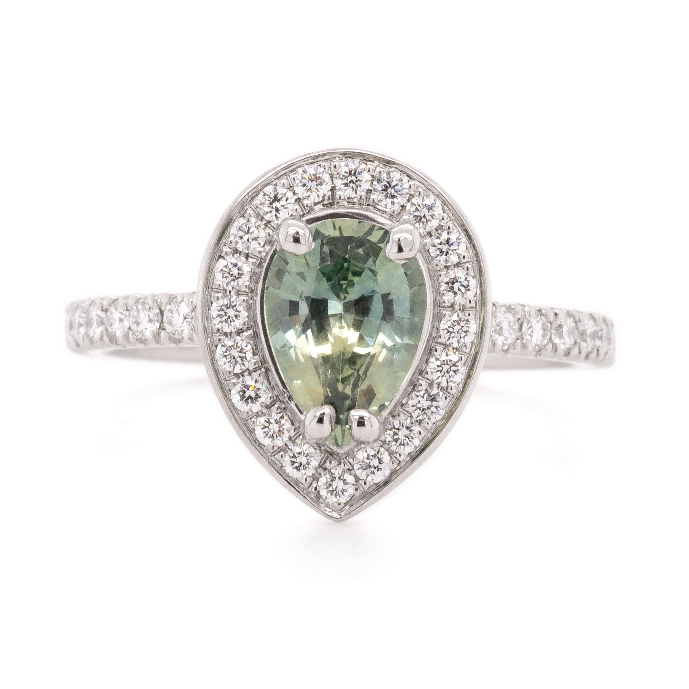0.93ct montana pear sapphire claw set with pave diamond halo (22 x .006ct) 14kw 1.5mm band with diamond shoulders (20 x .01ct) *Price doesn't include centre stone
