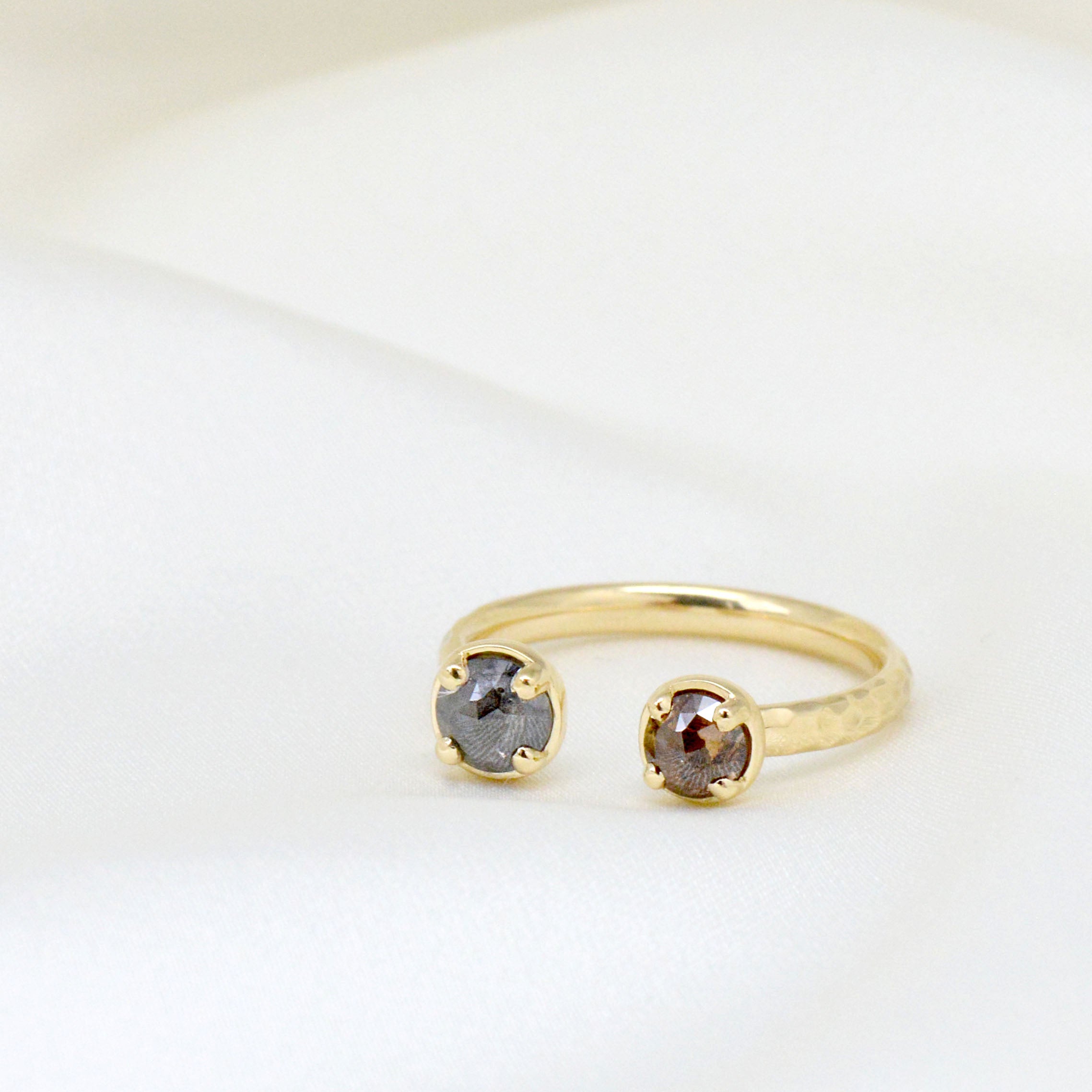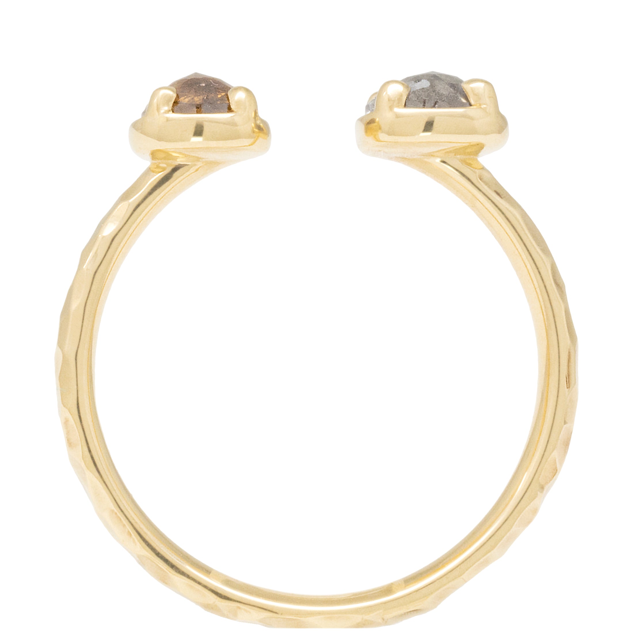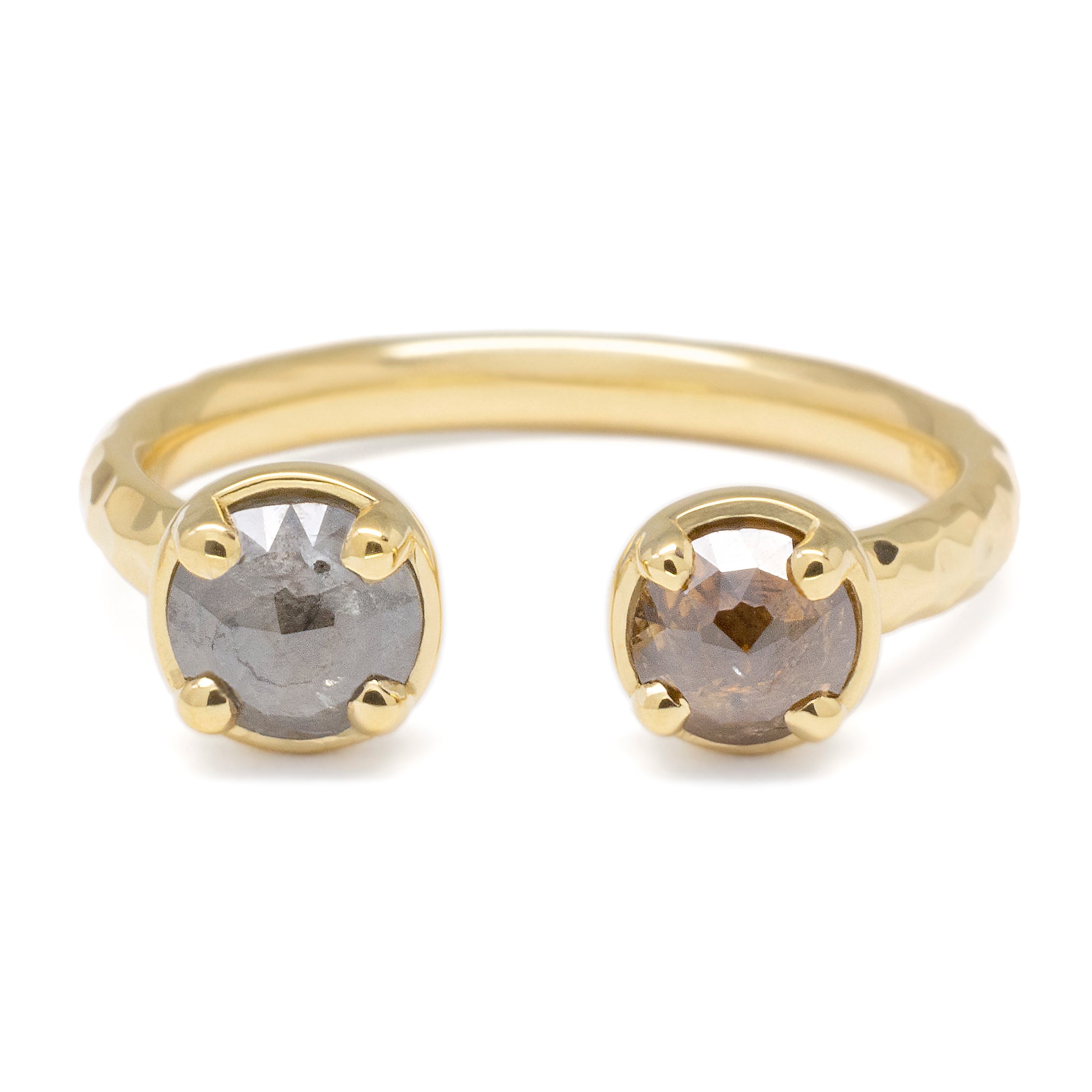 One of a kind 18k yellow gold open ring with claw set 0.38ct cognac diamond and 0.50ct silver diamond, 2.3mm hammered high polish band.