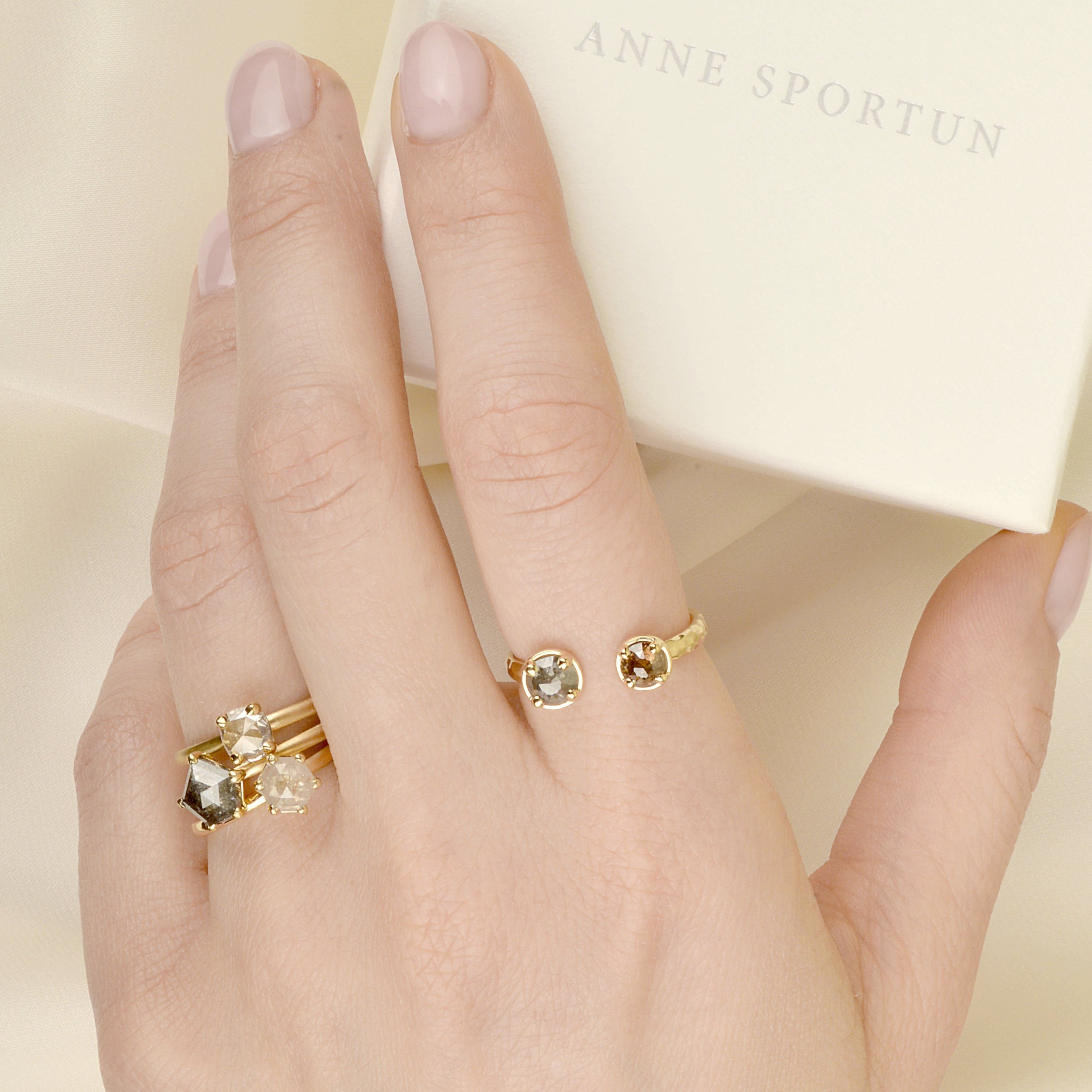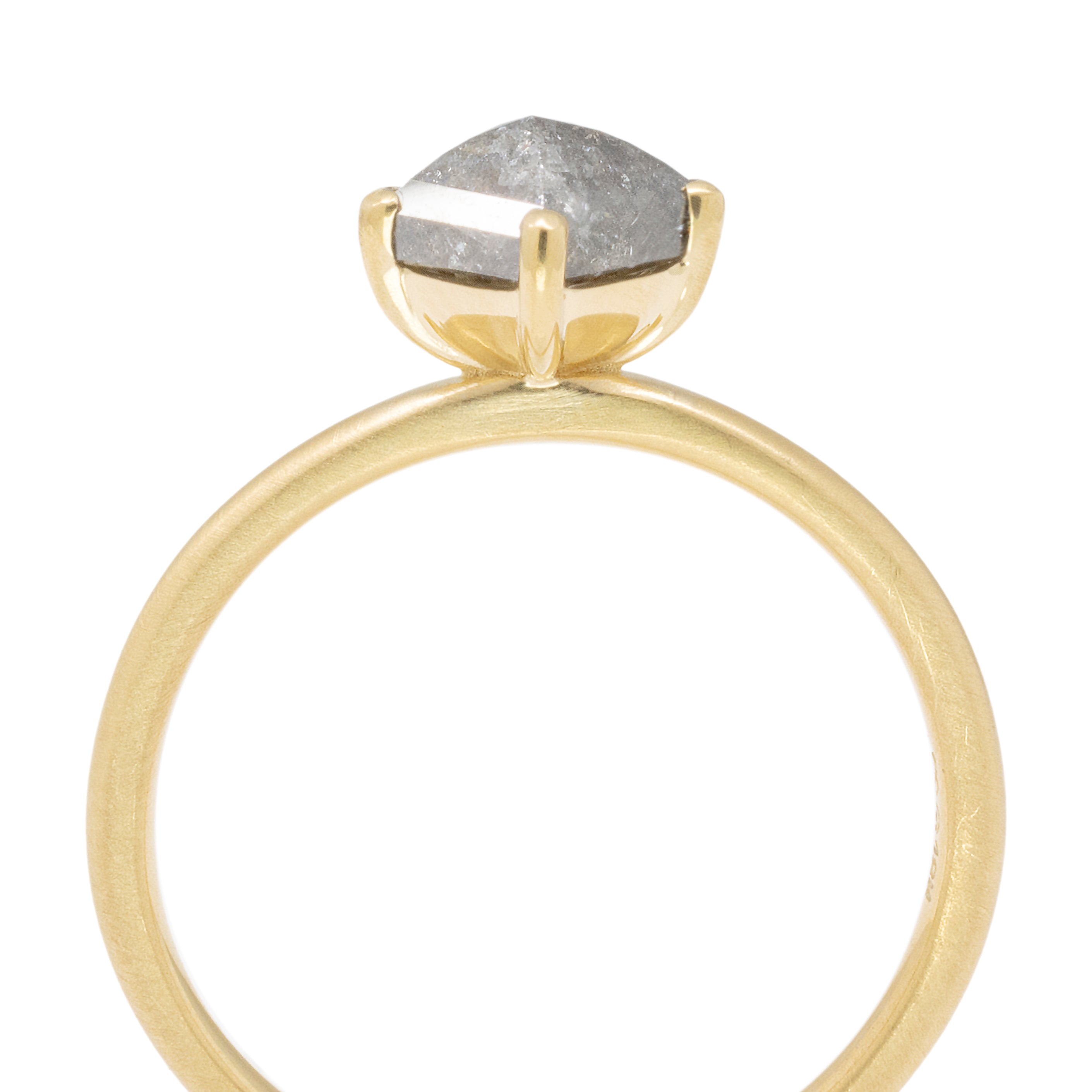As unique as it is spectacular, the one of a kind 18k yellow gold ring with 5 claw set 1.05ct salt + pepper rose-cut polygon diamond will announce your character effortlessly. 1.8mm band.