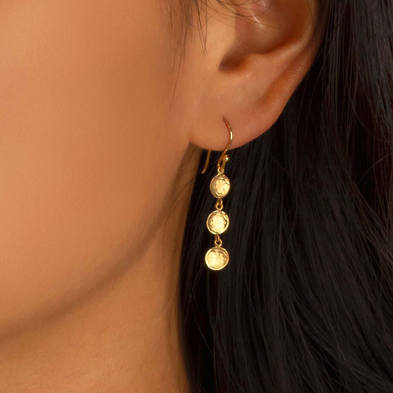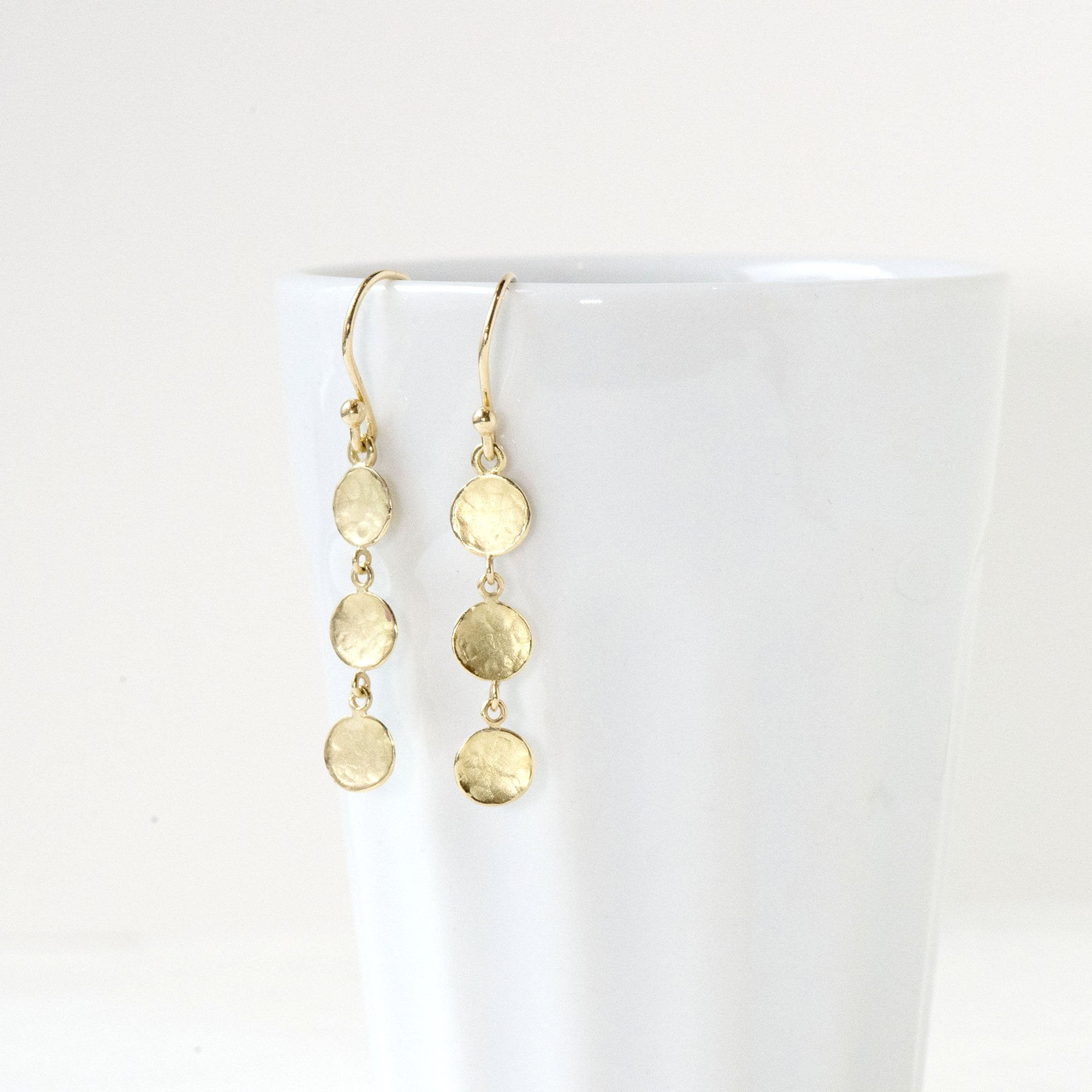 Gold hook earring with 3 hammered texture concave mini discs dangling in a vertical line. ~1.4" drop.