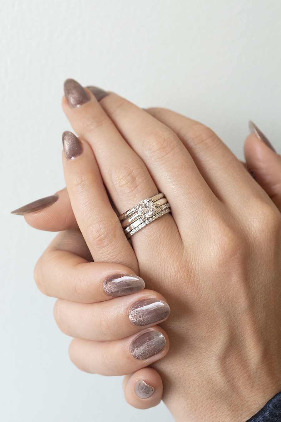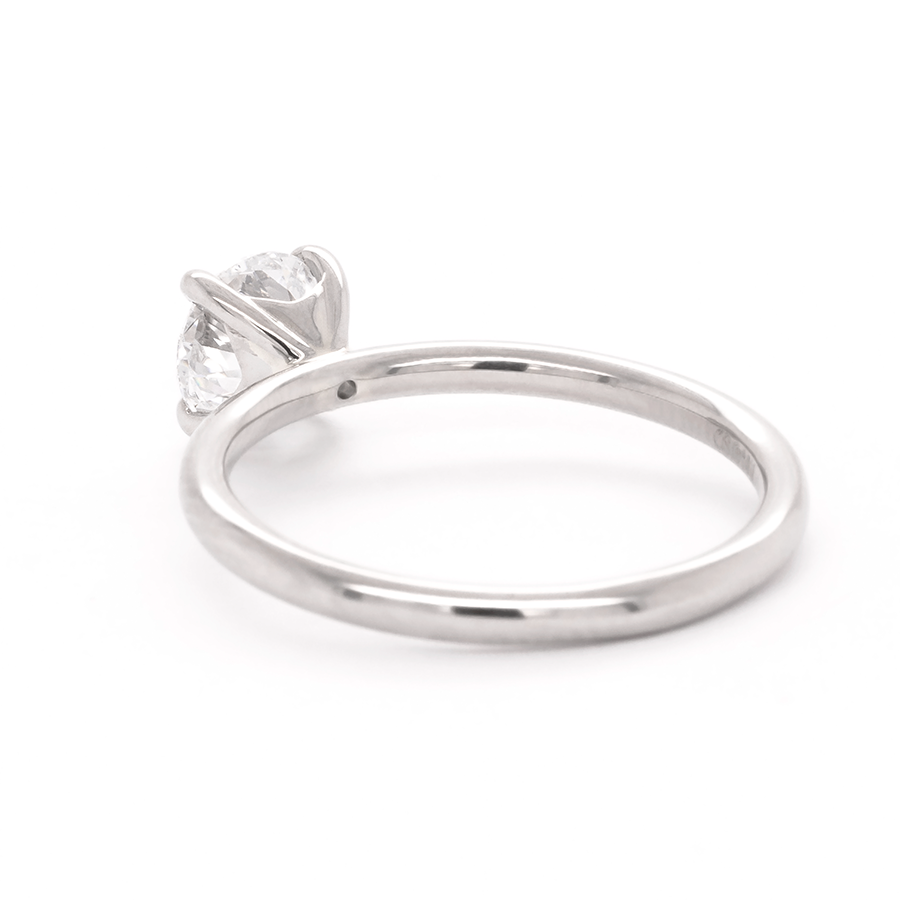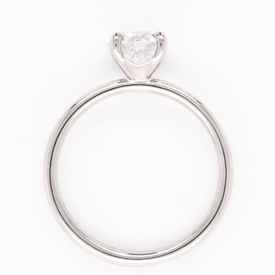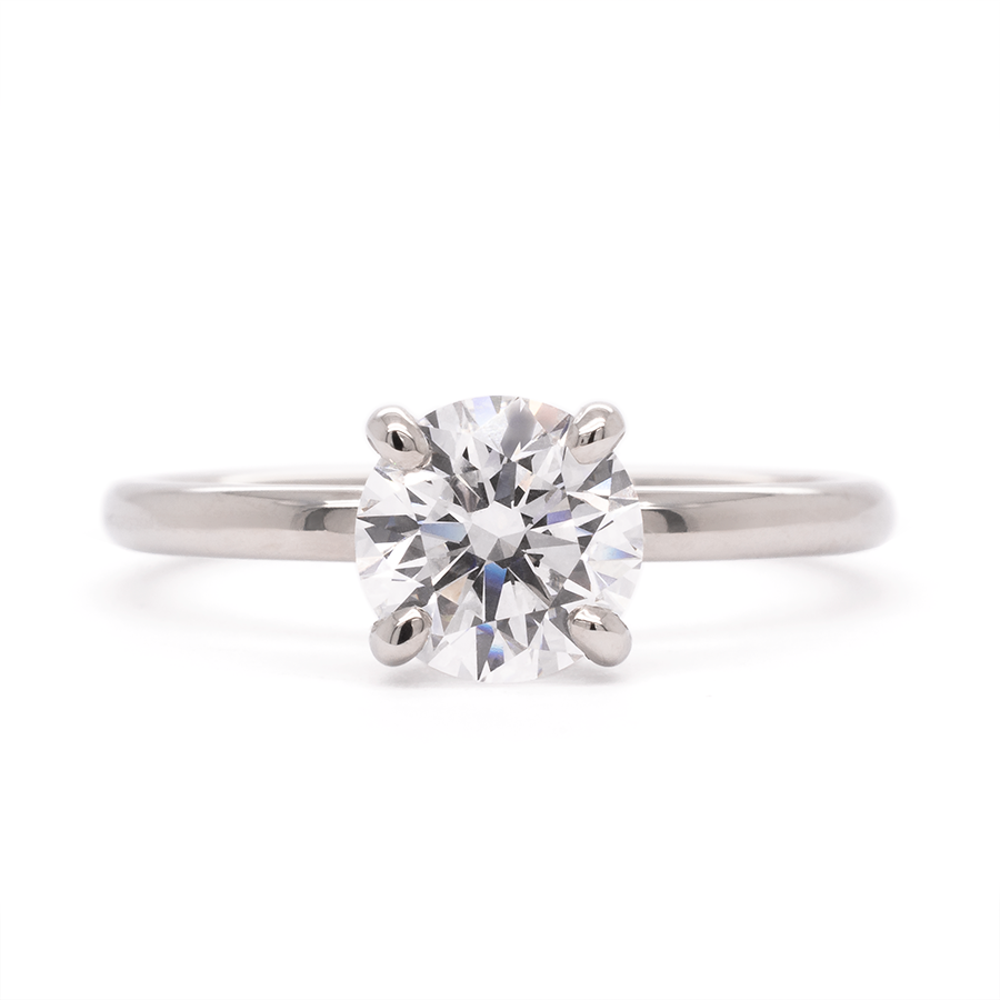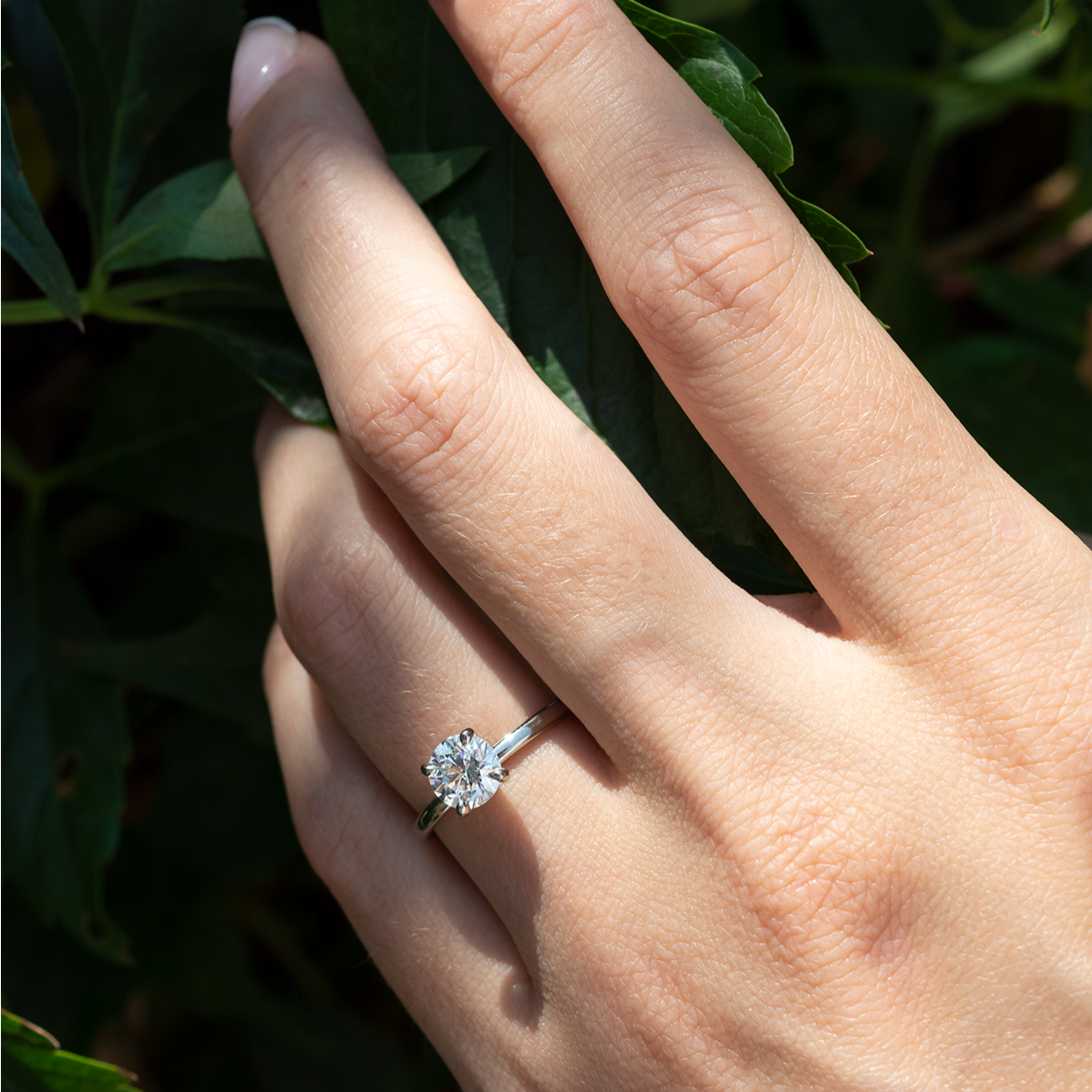 This classic solitaire 'Annie' Round Diamond Ring is set with a lab grown diamond whose cut delivers an EX grade of brilliance and fire, making it a truly captivating piece. Minimal four-prongs add a timeless elegance, and the diamonds D/VS2 grade makes for a stunningly clear and dazzling diamond.