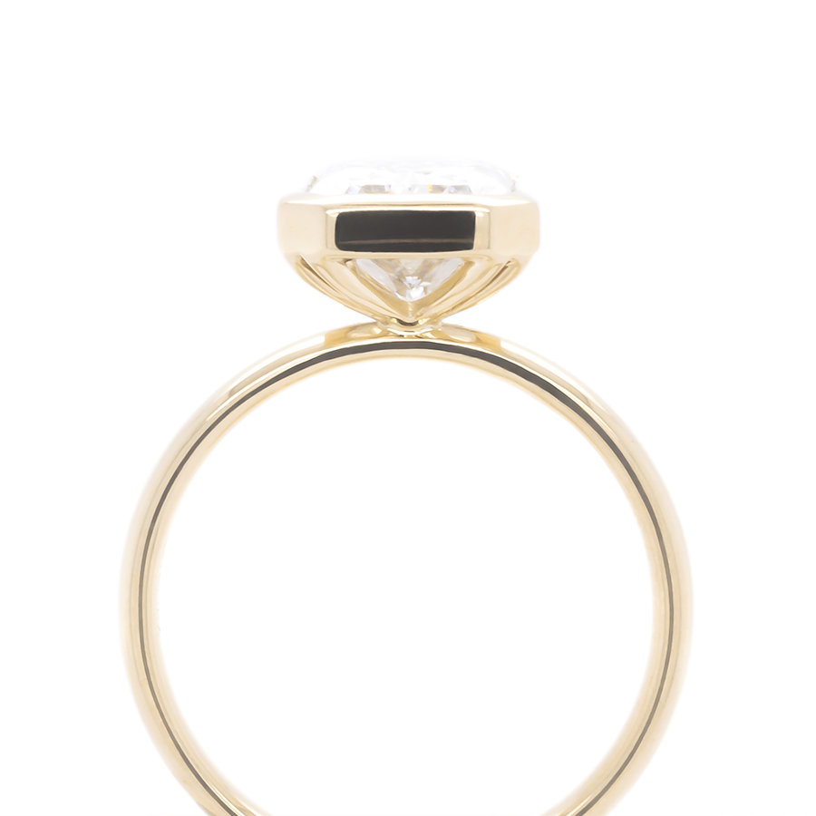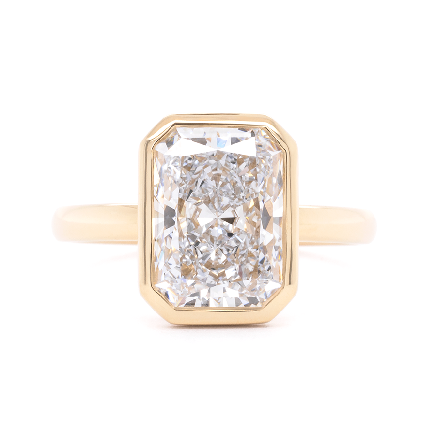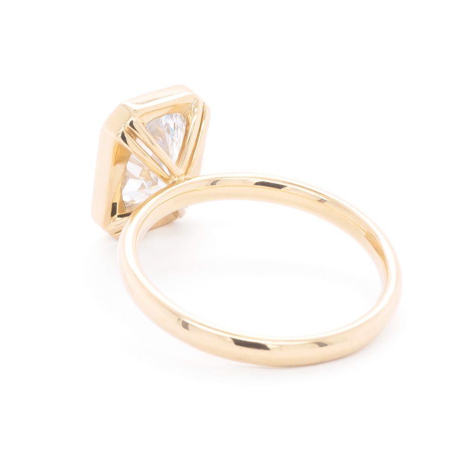 Impressive, and breathtaking: Handmade in solid 18k yellow gold, the the bezel set 3.01ct radiant cut corner diamond shines spectacularly in double arm open basket setting.