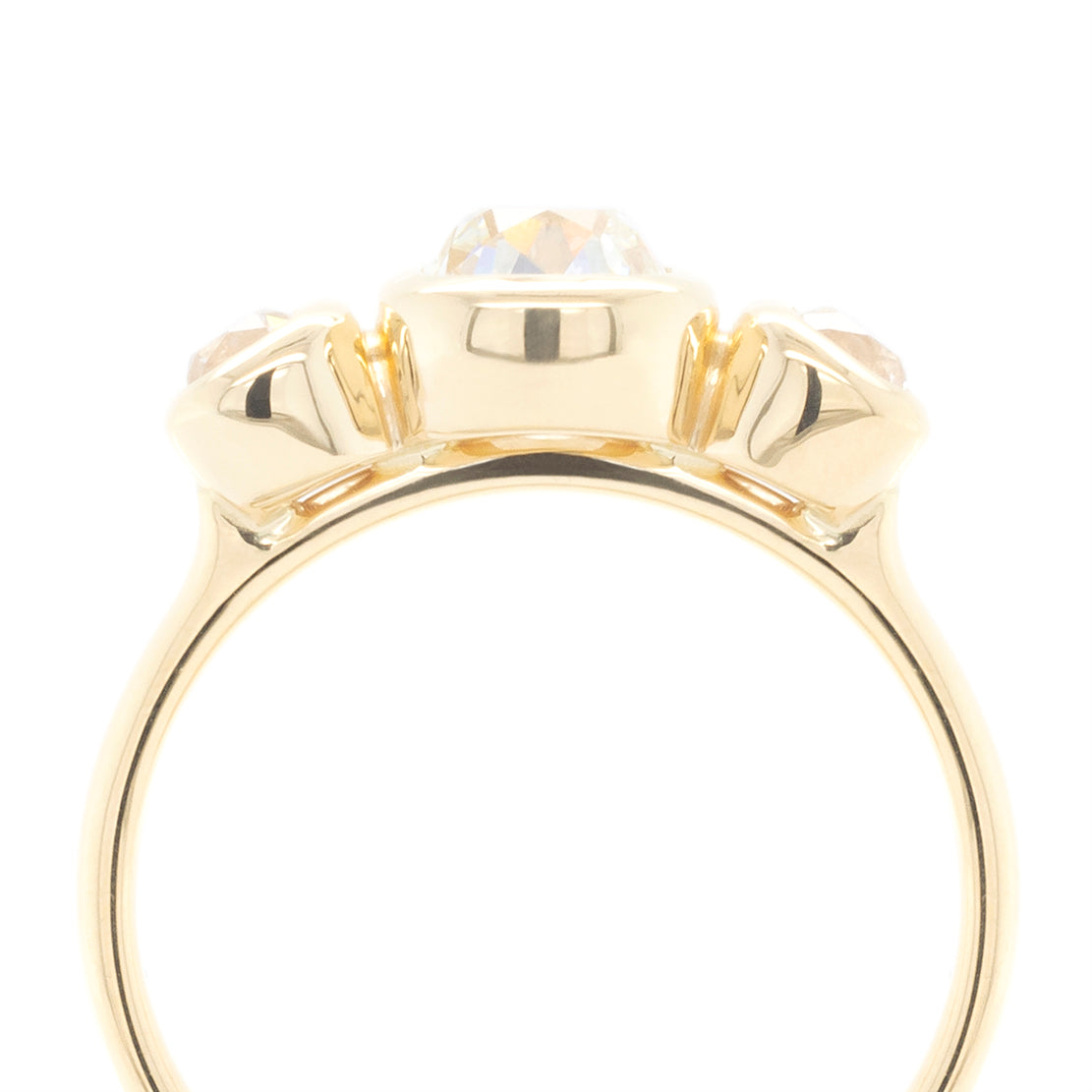 Give voice to your heart with this One of a Kind old mine cushion diamond Trinity Engagement Ring. Each beautiful old mine diamond is set in soft bezels, raised slightly to accommodate stacking your bands.