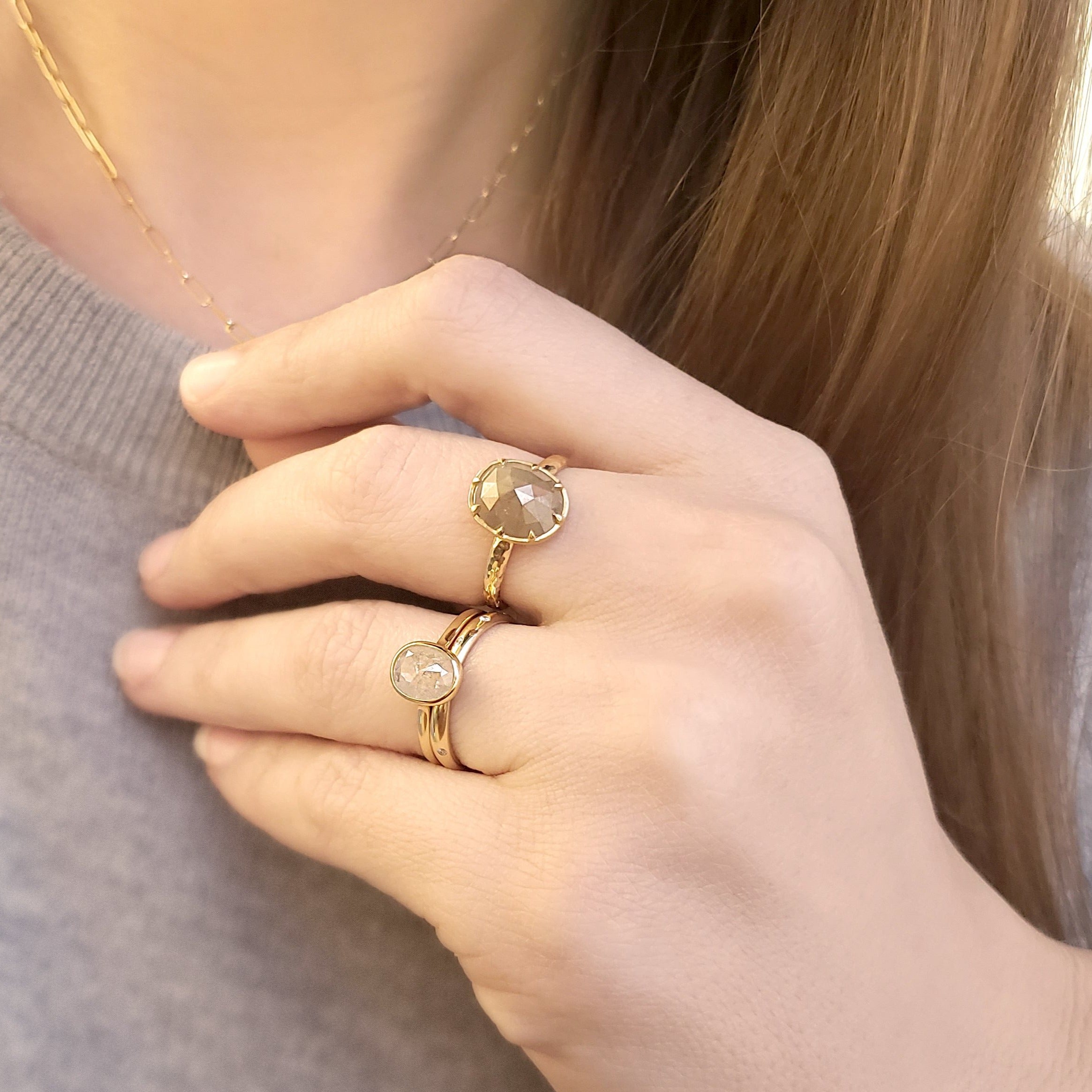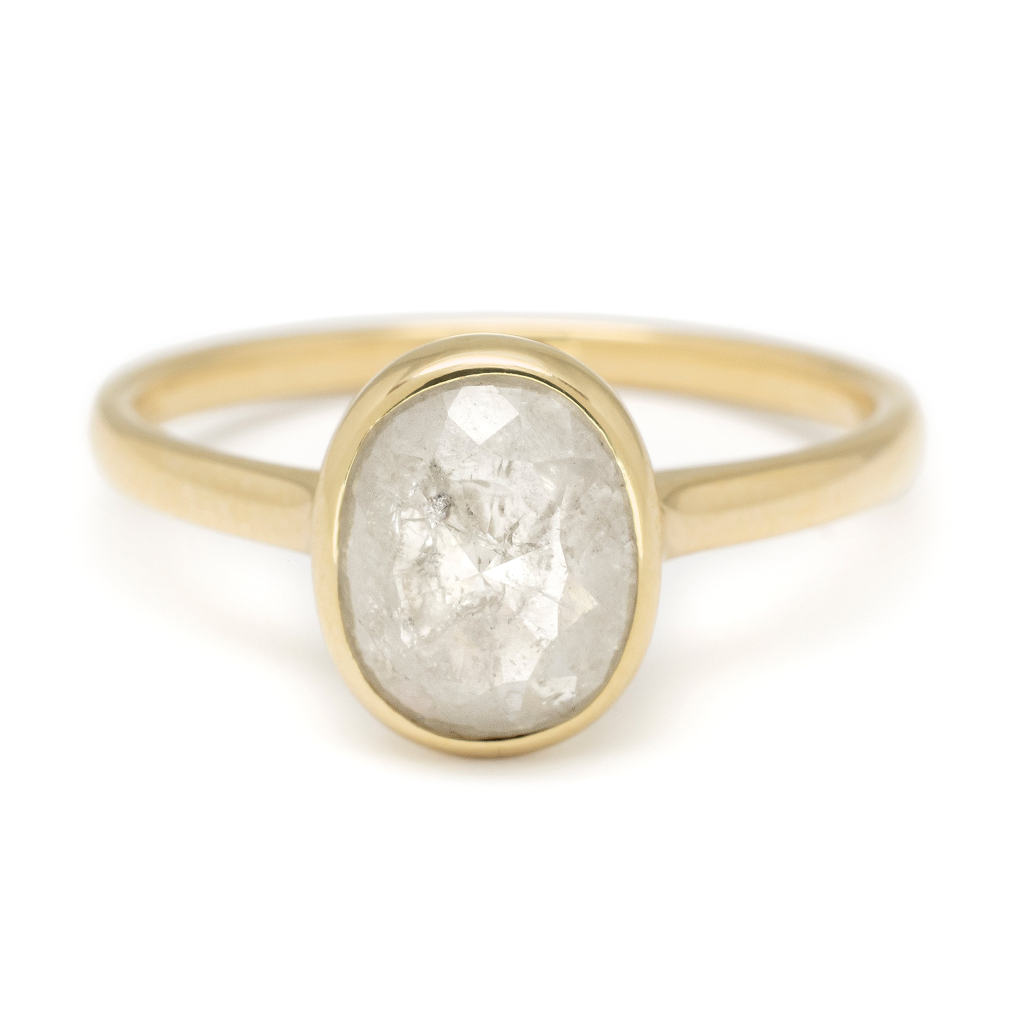 18k yellow gold ring with 1.11ct oval raw rosecut clear/grey diamond (7.58 x 6.01mm) in a thin bezel setting. 1.72mm band. One of a Kind Oval Raw Diamond Ring.