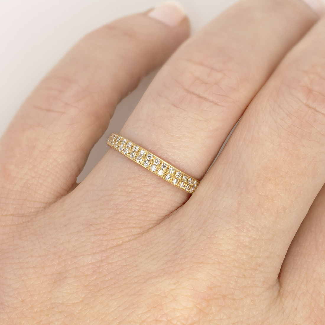 18k yellow gold narrow band set half pave with round brilliant cut diamonds.