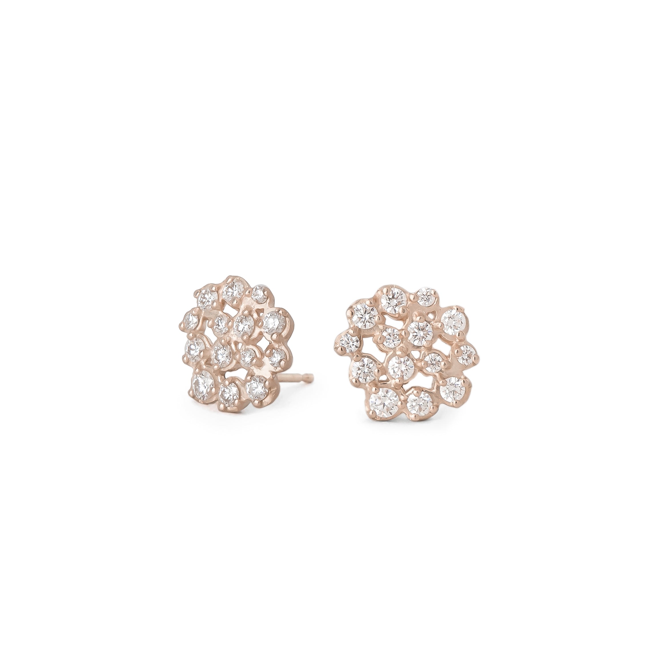 'Festival' Gold stud earring, with medium cluster (~11mm) of 14 x varying sizes of round brilliant cut diamonds, ~0.73tcw per pair.