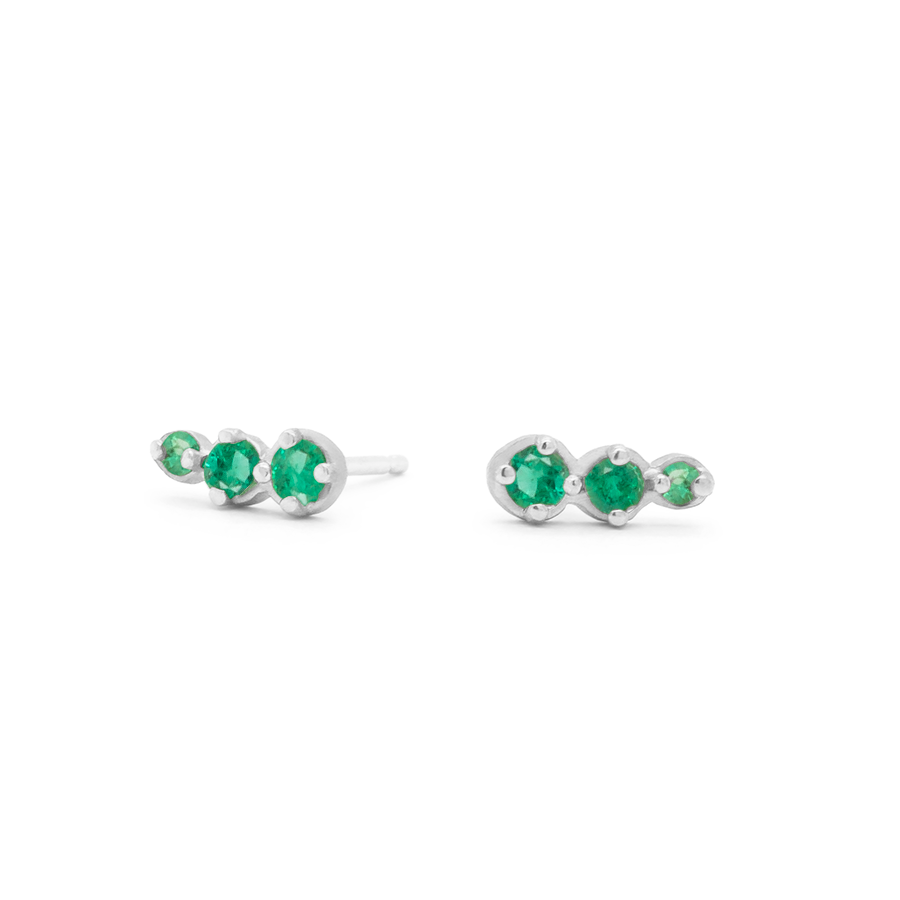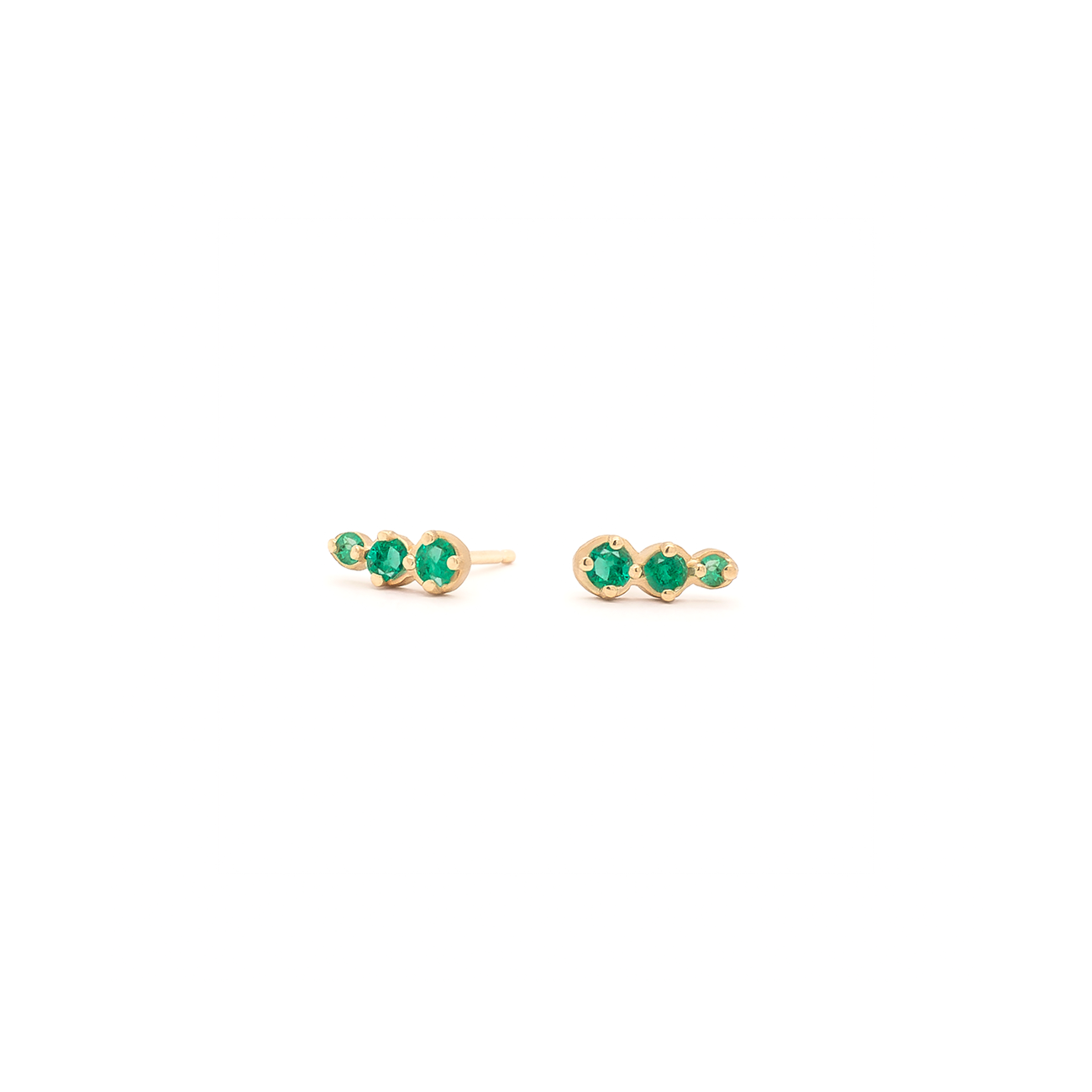 These gold post earrings feature three gradated, round brilliant-cut green emeralds of different sizes.