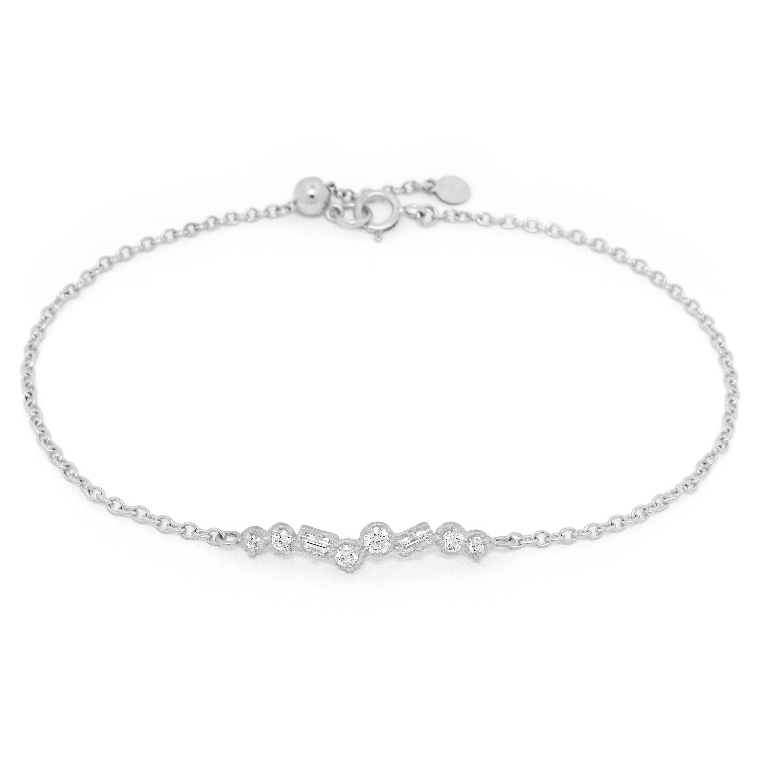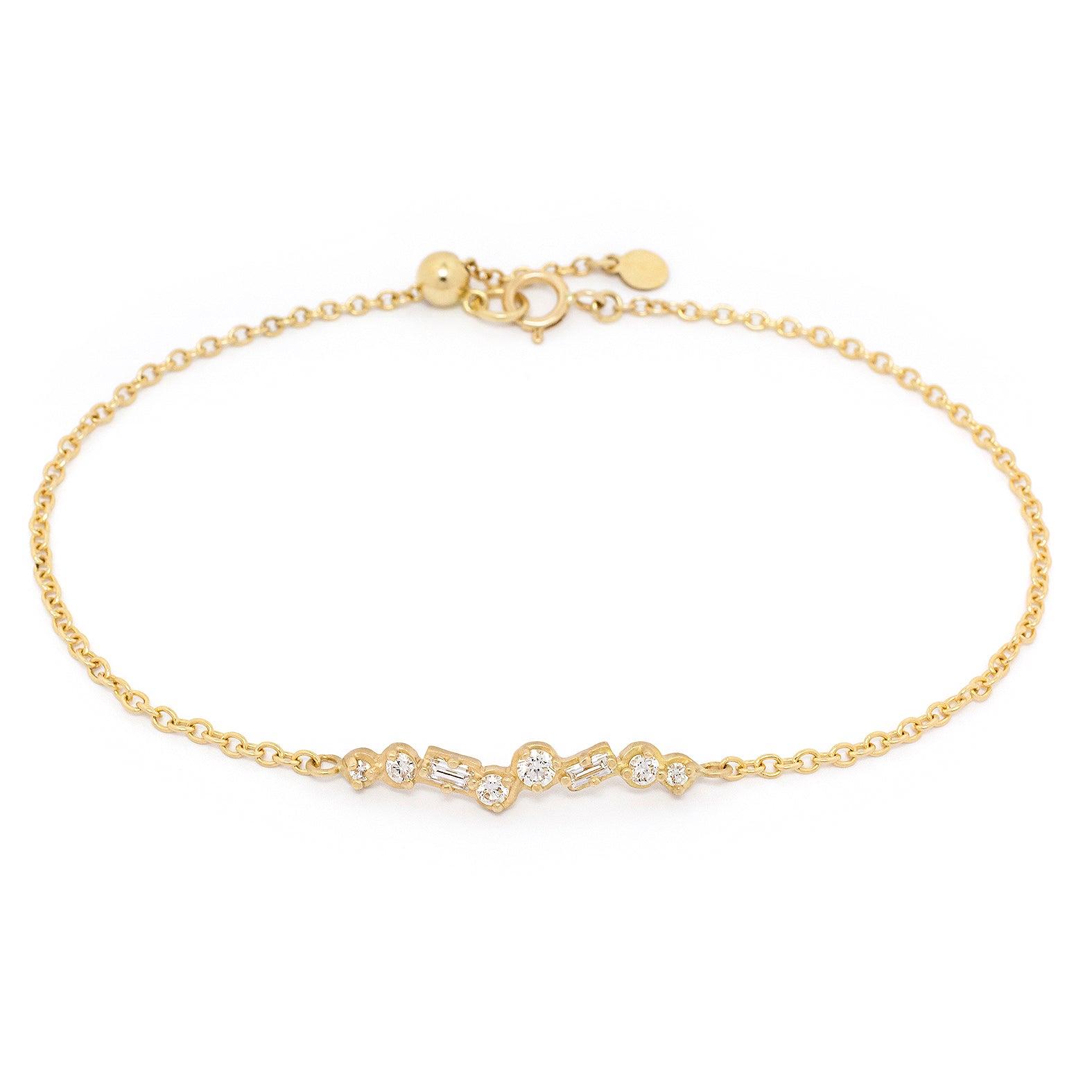 Gold 'Festival' cascade diamond bar bracelet of varying sizes of RBC and baguette diamonds. ~0.26 total carat weight.