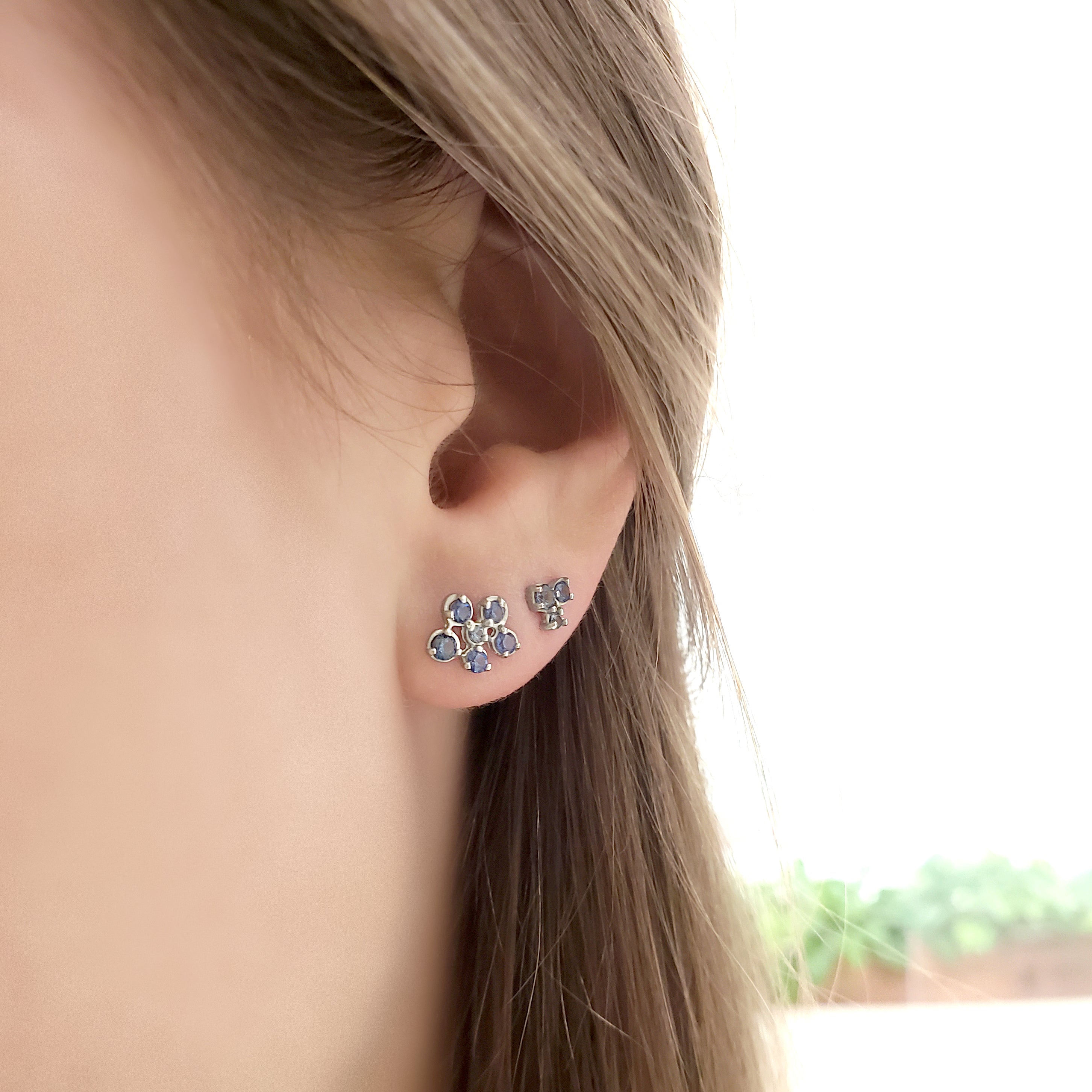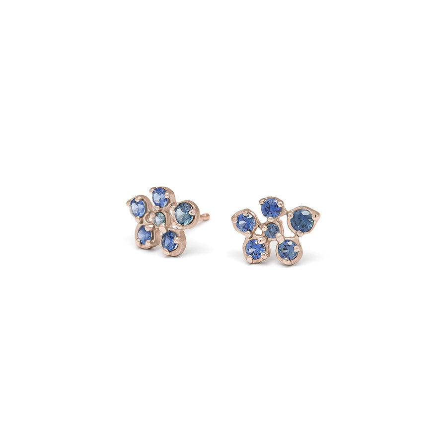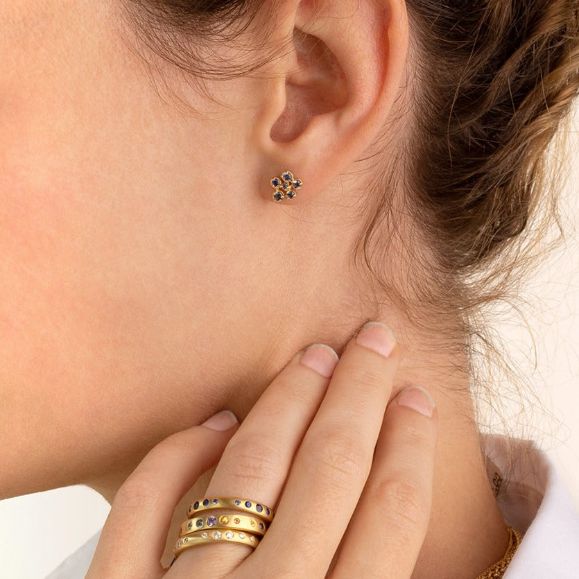Gold 'Festival' stud earring with a small floral cluster of varying sizes of round brilliant cut blue sapphires.