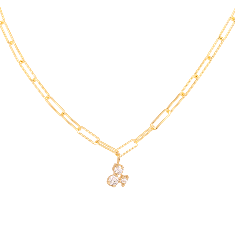 Make sure your style stands out from the rest with this solid gold paperclip chain necklace, complete with a trio of tiny diamonds! Clip on something unique and shine brighter than the others. It's the perfect way to add a little sparkle to any ensemble!