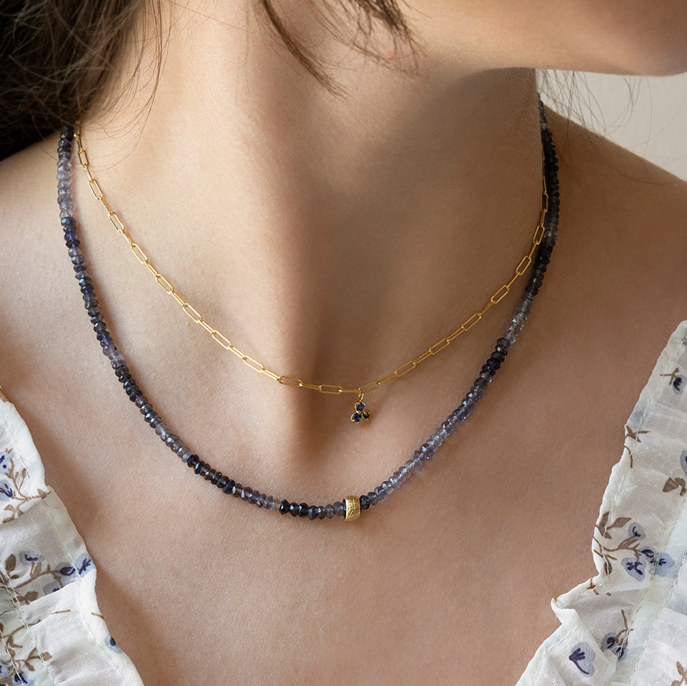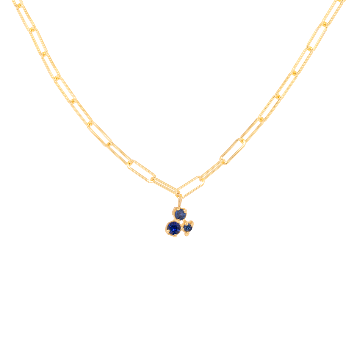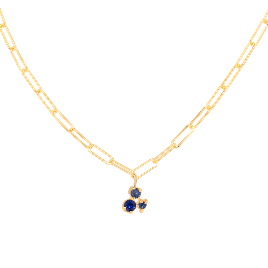 Make sure your style stands out from the rest with this solid gold paperclip chain necklace, complete with a trio of tiny sapphires! Clip on something unique and shine brighter than the others. It's the perfect way to add a little sparkle to any ensemble!