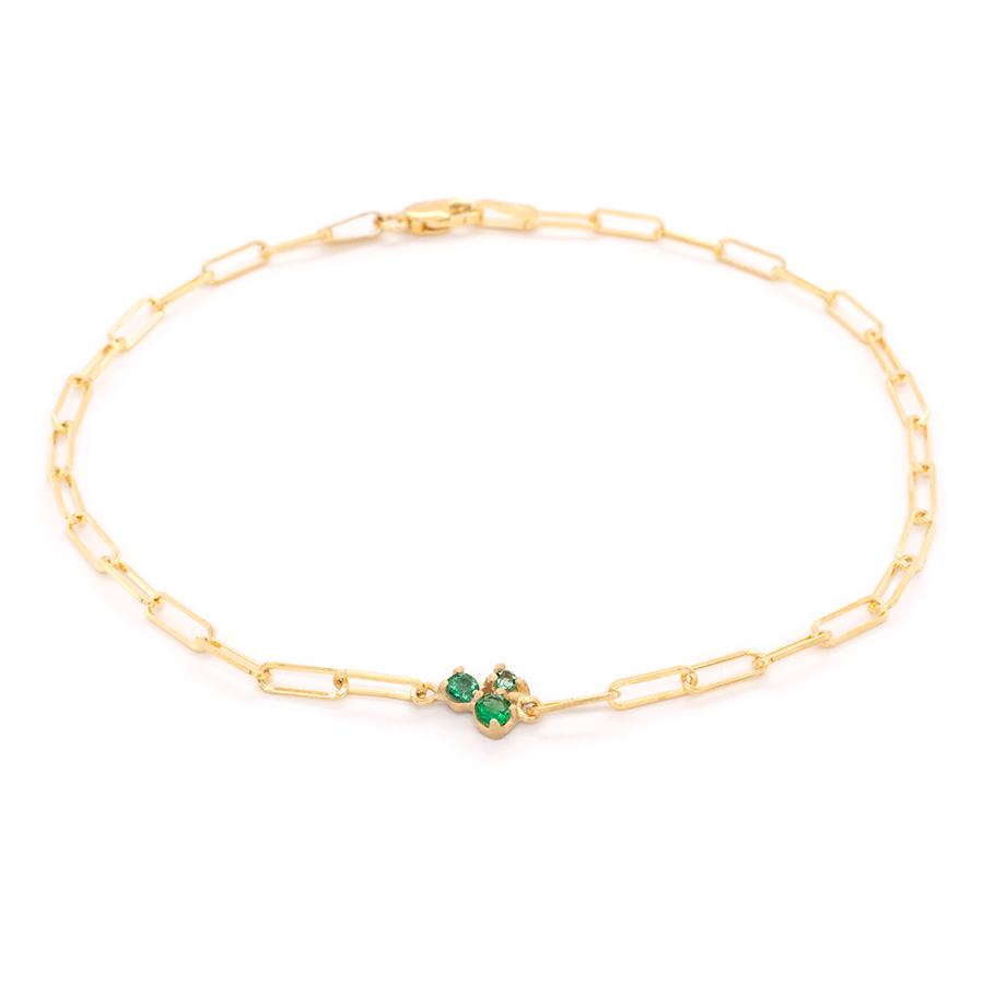 This exquisite Trio Cluster Festival Bracelet is crafted with three exquisite emeralds suspended from a delicate Paperclip Chain. Perfect for any occasion, this unique piece exudes subtle sophistication and elegance.